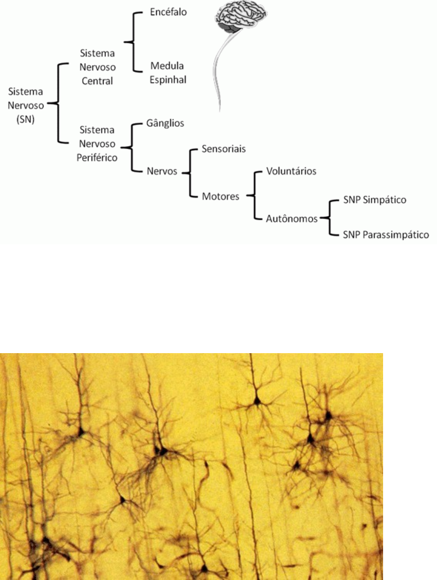 O sistema nervoso O sistema nervoso é o responsável por manter a homeostase corporal e também por nossas percepções, comportamento e memorias, além de iniciar todos os movimentos voluntários e involuntários do nosso corpo. O tecido nervoso compreende basicamente dois tipos de celulares: os neurônios e as células glias. Neurônio: é a unidade estrutural e funcional do sistema nervoso que é especializada para a comunicação rápida. Tem a função básica de receber, processar e enviar informações. Células Glias: compreende as células que ocupam os espaços entre os neurônios e tem como função sustentação, revestimento ou isolamento e modulação da atividade neural. Neurônios: Possuem excitabilidade elétrica que é a capacidade de responder a estímulos e convertê-los em um potencial de ação. Estímulo: é qualquer mudança no ambiente forte o suficiente para iniciar um potencial de ação. Potencial de ação: é um sinal elétrico que se propaga ao longo da superfície da membrana de um neurônio ou de uma fibra muscular. Partes de um neurônio: Corpo celular: contém um núcleo circundado por citoplasma que inclui organelas típicas. Dendritos: são as partes receptoras de um neurônio. Axônio: conduz os impulsos nervosos em direção a outro neurônio, a uma fibra muscular ou a uma célula glandular. Bainha de mielina: célula envoltória dos axônios que formam dobras múltiplas, com função de agilizar o impulso nervoso. Nodo de ranvier: espaçamentos intensos de mielina, que faz com que o impulso nervoso ocorra em saltos. Sinápse: é o local onde dois neurônios ou um neurônio e uma célula efetora podem se comunicar. Tipos de neurônios: Sensitivos ou aferentes: conduz a informação da periferia em direção ao SNC. Motores ou eferentes: conduz a informação do SNC em direção a periferia. Interneurônios: processam informações sensitivas recebidas dos neurônios sensitivos e então provocam uma resposta motora pela ativação dos neurônios motores apropriados. Classificação dos neurônios: Multipolares: geralmente possuem vários dendritos e um axônio. Bipolares: tem um dendrito principal e um axônio. Unipolares: tem dentritos e um axônio que estão fundidos para formar um processo continuo que emerge do corpo celular. Sistema nervoso central (SNC): O SNC divide-se em encéfalo e medula. O encéfalo corresponde ao telencéfalo (hemisférios cerebrais), diencéfalo (tálamo e hipotálamo), cerebelo, e tronco cefálico, que se divide em: bulbo, mesencéfalo e ponte. Os órgãos do SNC são protegidos por estruturas esqueléticas (caixa craniana, protegendo o encéfalo; e coluna vertebral, protegendo a medula - também denominada raque) e por membranas denominadas meninges, situadas sob a proteção esquelética: dura-máter (a externa), aracnóide (a do meio) e pia-máter (a interna). Entre as meninges aracnóide e pia-máter há um espaço preenchido por um líquido denominado líquido cefalorraquidiano ou líquor. Espaço entre as menínges: O espaço extradural ou epidural normalmente não é um espaço real mas apenas um espaço potencial entre os ossos do crânio e a camada periosteal externa da dura-máter. Torna-se um espaço real apenas patologicamente, por exemplo, no hematoma extradural. Líquor: É um fluido aquoso e incolor que ocupa o espaço subaracnóideo e as cavidades ventriculares. A são função primordial é proteção mecânica do sistema nervoso central. Encéfalo: É um dos maiores órgãos do nosso corpo, consiste em cerca de 100bilhões de neurônios e em 10 a 50 trilhões de neuroglia, com uma massa de cerca de 1,300g. Partes do encéfalo: Telencéfalo: O telencéfalo compreende os dois hemisférios cerebrais, direito e esquerdo. Os dois hemisférios cerebrais são incompletamente separados pela fissura longitudinal do cérebro, cujo o assoalho é formado por uma larga faixa de fibras comissurais, denominada corpo caloso, principal meio de união entre os dois hemisférios. Durante o desenvolvimento embrionário, quando há um rápido aumento no tamanho do telencéfalo, a substancia cinzenta do córtex cerebral amplia-se de tamanho muito mais rápido que a substancia branca subjacente. Como resultado, o córtex cerebral enrola-se e dobra-se sobre ele mesmo para que possa caber dentro da cavidade do crânio. As pregas são chamadas de giros. Os sulcos profundos entre os giros são as fissuras e os rasos são chamados de sulcos. Cada hemisfério possui três pólos: frontal, occipital e temporal; e três faces: súpero-lateral (convexa); medial (plana); e inferior ou base do cérebro (irregular), repousando anteriormente nos andares anterior e médio da base do crânio e posteriormente na tenda do cerebelo. Sulco Lateral: é o sulco que separa o lobo frontal do lobo temporal. Ele é subdividido em ascendente, anterior e posterior. Sulco Central: separa o lobo parietal do frontal. O sulco central é ladeado por dois giros paralelos, um anterior, giro pré-central, e outro posterior, giro pós-central. As áreas situadas adiante do sulco central relacionam-se com a MOTRICIDADE, enquanto as situadas atrás deste sulco relacionam-se com a SENSIBILIDADE. Outro sulco importante situado no telencéfalo, na face medial, é o sulco parieto-occipital, que separa o lobo parietal do occipital. Cada hemisfério cerebral tem 4 lobos que são nomeados de acordo com os ossos que os recobrem: Uma quinta parte do telencéfalo, o lobo insular, não pode ser vista na superfície do encéfalo, por que situa-se dentro do sulco cerebral lateral, profundamente aos lobos parietal, frontal e temporal. Lobo Frontal Lobo Temporal Lobo Parietal Lobo Occipital Lobo da Ínsula Na profundidade de cada hemisfério cerebral estão três núcleos que são denominados coletivamente de núcleos da base. A principal função dos núcleos da base é ajudar a iniciar e terminar os movimentos, regular o tônus muscular necessário aos movimentos corporais 