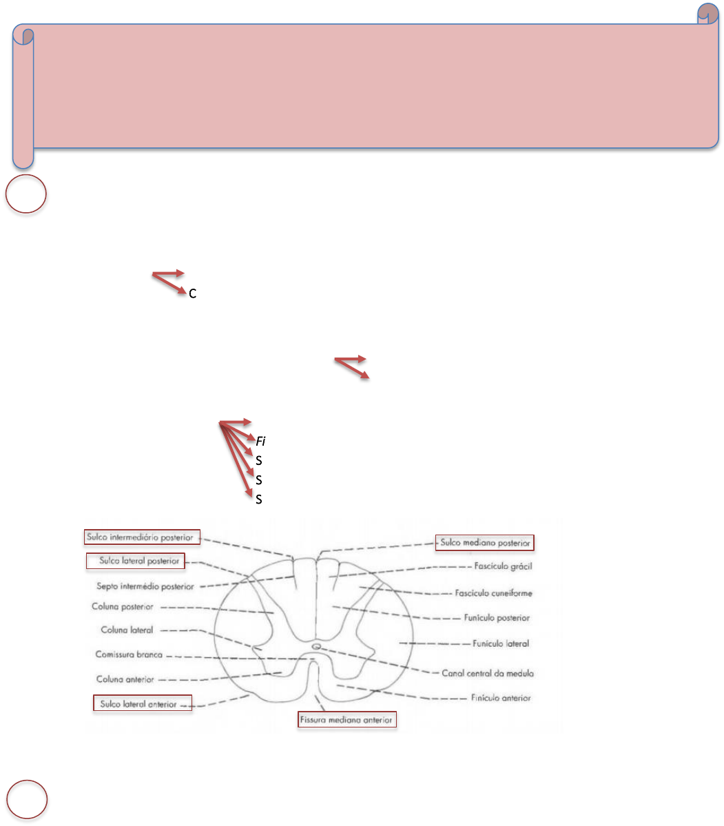 Medula ➢ O que é o Massa cilíndrica de tecido nervoso dentro do canal vertebral o Limites o Termina afilada = cone medular = contínuo ao filamento terminal ➢ Como é: o Possui 2 intumescências = 2 dilatações - formadas por conjunto de raízes nervosas que se conectam à medula o Sulcos longitudinais - são saídas e Entradas de raízes o OBS: dos sulcos laterais anteriores e dos posteriores, saem, respectivamente, as raízes (junção de filamentos nervosos radiculares) ventrais e dorsais ➢ Geral o Medula não ocupa todo o canal vertebral, porque tem crescimento diferente da coluna o Por crescer menos que a coluna, as raízes e os nervos espinais precisam se distender para conseguirem se relacionar com as vértebras → lembrar que nervos saem por entre as vértebras o Isso faz com que sua divisão seja em segmentos correspondentes ou não às numerações das vértebras ➢ Partes distintas da medula: o Cone medular = final da medula, quando ela se afunila o Cauda equina = conjunto de raízes e nervos espinais que estão se distendendo para alcançar espaços intervertebrais → pós o cone 1 FORMA E ESTRUTURA GERAL Cranial = bulbo – ao nível do forame magno do osso occipital Caudal = L2 cervical = plexo braquial = inerva MMSS lombar = plexo lombossacral = inerva MMII Sulco Mediano posterior Fissura mediana anterior → também é uma depressão, mas mais profunda do que o sulco Sulco lateral anterior = conexão das raízes ventrais Sulco lateral posterior = conexão dos nervos espinais Sulco intermédio posterior = na medula cervical (entre mediano e lateral posteriores) 2 SEGMENTOS MEDULARES GLOSSÁRIO: - substância cinzenta: neuroglia + corpos de neurônio + fibras amielínicas - substância branca: neuroglia + fibras mielínicas - trato: feixe de fibras com mesma origem, função e destino no SNC (no SNP = nervo) - fascículo: trato compacto - funículo: cordão com vários tratos ou fascículos na substância branca - comissura: região formada pelo cruzamento de fibras com direções opostas em 90º - decussação: região formada pelo cruzamento de fibras com mesma direção obliquamente - núcleo: grupo de neurônios com estruturas e funções semelhantes o Filamento terminal = conecta medula (cone medular) ao cóccix para estabilidade → forma a cauda - é a própria dura-máter (meninge) ➢ Segmentos: o O segmento medular de um nervo = parte medular onde filamentos radiculares que formam esse nervo se conectam o 1 segmento medular = 1 porção da medula que possui 1 raiz ventral bilateral + 1 raiz dorsal bilateral - lembrar que: 1 raiz = união de radículas = união de prolongamentos axonais dos corpos de neurônios que estão na substância cinzenta, parte mais interna da medula - raiz ventral = porção eferente, pois corresponde a axônios de neurônios motores - raiz dorsal = porção aferente, pois corresponde a axônios de neurônios sensitivos * corpos desses neurônios no gânglio sensitivo fora da medula - como se dá a comunicação entre raízes: raiz dorsal (sensitiva) entra na substância cinzenta e conduz a info ao se comunicar com as radículas axonais ventrais que formam a raiz ventral e saem da medula para formar nervo espinal, que sai entre as vértebras e conduz a info para a parte motriz o Pelo crescimento diferente, segmentos medulares vão se afastando das vértebras correspondentes (ex.: vértebras T11 e T12 se relacionam com segmentos lombares e não torácicos) o 31 pares de nervos espinais = 31 segmentos medulares Coluna vertebral Medula Cervicais 7 8 Torácicas 12 12 Lombares 5 5 sacrais 5 5 coccígeas 4 1 o Regra prática: segmento C1-C7 acima das vértebras de mesmo nome ex.: C1 acima da vértebra C2 (obs: distância entre elas vai aumentando, de início, é quase correpondente) segmento C8 correponde à vértebra C7 (lembrar que só tem 7 vértebras cervicais X 8 segmentos cervicais) segmento T1- T6 100% correspondentes às vértebras de mesmo nome ex.: T5 corresponde a vértebra T5 segmento T7-T12 acima da vértebra correspondente ex.: T8 acima da vértebra T8 segmentos L1-L5 correspondem às vértebras T11 e T12 ex.: L2 no mesmo nível da vértebra T11 segmentos S1-S5 e cox 1 correspondem à vértebra lombar L1 saem acima das vértebras correspondentes ex.: nervo de C3 sai acima da vértebra C3, abaixo da C2 nervos dos segmento s C1-C7 sai abaixo da vértebra C7 (última cervical) e acima da T1 nervo do segment o C8 saem abaixo das vértebras correspondentes ex.: nervo de T10 sai abaixo da vértebra T10 nervos dos segment os de T1- T12 saem abaixo das vértebras correspondent es nervos dos segment os de L1- coc1 vértebras C1- C6 •No nível dos segmentos medulares cervicais vértebra C8- T10 •no nível dos segmentos medulares torácicos vértebras T11- T12 •no nível dos 5 segmentos medulares lombares vértebra L1 •no nível dos 5 segmentos medulares sacrais ➢ O que são: o Membranas fibrosas que envolvem o SNC ➢ Dura máter espinal: o Mais externa o Envolve toda a medula = saco dural → termina em fundo-de-saco, ao nível da S2 o Tem prolongamentos que envolvem as raízes dos nervos espinais – contínua ao epineuro o Tem alguns orifícios para a passagem das raízes ➢ Aracnoide espinal o Do meio o Se une à pia por trabéculas aracnoideas ➢ Pia-máter espinal: o Mais interna o Penetra na fissura mediana anterior o Forma o filamento terminal medular → ele perfura o fundo de saco da dura e passa a ser filamento da dura até se inserir no cóccix e formar o ligamento coccígeo o Forma, bilateralmente à medula, o ligamento denticulado ➢ Espaços entre as meninges o Epidural/extradural = entre dura e periósteo do canal vertebral - tem tecido adiposo e veias o Subdural = entre a dura e a aracnoide o Subaracnóideo = contém o líquor 3 MENINGES ➢ Neurônios medulares: o De axônio longo (tipo I de Golgi) - radiculares → formam raiz ventral * viscerais = pré-ganglionares do SNA → corpo na substância 