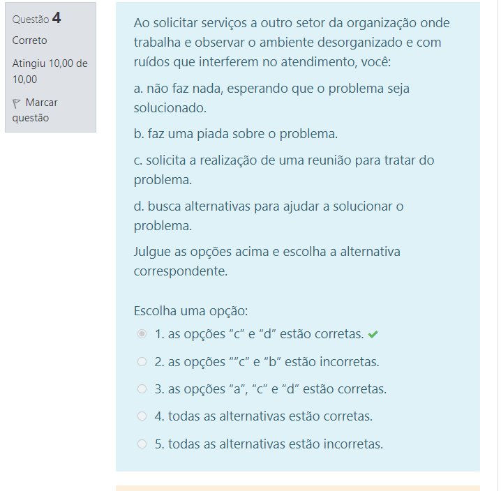 Ao solicitar serviços a outro setor da organização onde reto trabalha e observar ambiente desorganizado e com giu 10,00 de ruídos que interferem no atendimento, você: a. não faz nada, esperando que o problema seja solucionado. b. faz uma piada sobre o problema. c. solicita a realização de uma reunião para tratar do problema. d. busca alternativas para ajudar a solucionar o problema.
