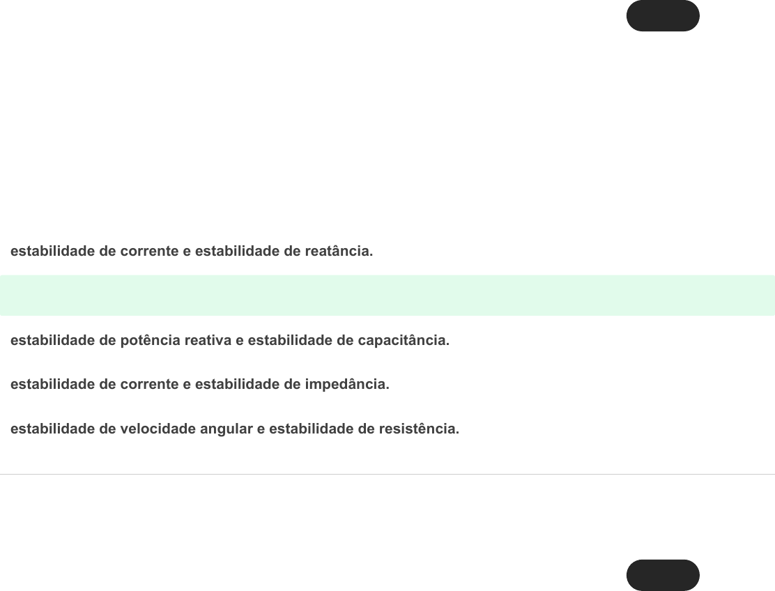 25/05/2023, 14:01 Comentários https://sereduc.blackboard.com/ultra/courses/_163436_1/outline/assessment/_7834749_1/overview/attempt/_26753639_1/review/inline-feedbac… 1/10 Ocultar opções de resposta Pergunta 1 1 / 1 A estabilidade de uma rede elétrica é interpretada, de forma prática, como a capacidade do sistema em pauta de retornar as condições operativas normais após ter sofrido alguma perturbação. No caso dos sistemas elétricos, a estabilidade possui dois pontos, um estável e outro instável. Com base nos conteúdos estudados sobre estabilidade e nas informações acima, pode-se concluir que são tópicos de estudo de estabilidade: estabilidade de corrente e estabilidade de reatância. Resposta corretaestabilidade de tensão e estabilidade de ângulo. estabilidade de potência reativa e estabilidade de capacitância. estabilidade de corrente e estabilidade de impedância. estabilidade de velocidade angular e estabilidade de resistência. Pergunta 2 1 / 1 25/05/2023, 14:01 Comentários https://sereduc.blackboard.com/ultra/courses/_163436_1/outline/assessment/_7834749_1/overview/attempt/_26753639_1/review/inline-feedbac… 2/10 Ocultar opções de resposta Leia o trecho a seguir: “O angulo crítico é definido como o ângulo máximo onde consegue-se recuperar um sistema após a ação de algum distúrbio. Para isto, considere a Figura abaixo representando um gerador conectado ao barramento infinito, cujas unidade são dadas em pu (por unidade).” Fonte: ZANETTA, L.C. Jr Fundamentos de Sistemas de Potência. São Paulo: Ed. Livraria Física, 2006, p. 301. Com base nessas informações e nos conteúdos estudados sobre estabilidade dos sistemas elétricos de potência, assinale a alternativa que representa o valor correto do ângulo crítico (em rad): 0,56 rad. 0,87 rad. Resposta correta1,63 rad. 0,12 rad. 1,28 rad. Pergunta 3 0 / 1 25/05/2023, 14:01 Comentários https://sereduc.blackboard.com/ultra/courses/_163436_1/outline/assessment/_7834749_1/overview/attempt/_26753639_1/review/inline-feedbac… 3/10 Ocultar opções de resposta Considere o sistema ilustrado a seguir, que representa um gerador conectado ao barramento infinito operando em δ_0=23,78°, com dupla linha de transmissão, dotada de disjuntores em cada uma das extremidades de cada linha de transmissão envolvida. Com base nessas informações e no conteúdo estudado sobre estabilidade dos sistemas elétricos de potência, assinale a alternativa que corresponde ao valor do coeficiente de potência sincronizante: Resposta correta2,15. 2,04. 2,29. Incorreta: 1,78. 1,98. Pergunta 4 1 / 1 Um dos métodos de armazenamento compacto de matrizes esparsas é o esquema KRM modificado, que permite que sejam obtidas a linha e coluna de determinado elemento não nulo sem a necessidade de percorrer toda a matriz. Com base nessas informações e nos conteúdos de esquema KRM modificado, analise as asserções a seguir e a relação entre elas: 25/05/2023, 14:01 Comentários https://sereduc.blackboard.com/ultra/courses/_163436_1/outline/assessment/_7834749_1/overview/attempt/_26753639_1/review/inline-feedbac… 4/10 Ocultar opções de resposta I. No parâmetro NR (posição do próximo elemento da linha) e NC (posição do próximo elemento da coluna), quando for o último elemento na última coluna ou linha, ele terá uma numeração negativa não nula. Porque: II. Este índice, em módulo, vai indicar a posição da linha, no caso do NR, ou coluna, no caso do NC. Assinale a seguir a alternativa correta: As asserções I e II são proposições verdadeiras e a II não é uma justificativa correta da I As asserções I e II são proposições falsas A asserção I é uma proposição falsa, e a II é uma proposição verdadeira A asserção I é uma proposição verdadeira, e a II é uma proposição falsa Resposta corretaAs asserções I e II são proposições verdadeiras e a II é uma justificativa correta da I Pergunta 5 1 / 1 25/05/2023, 14:01 Comentários https://sereduc.blackboard.com/ultra/courses/_163436_1/outline/assessment/_7834749_1/overview/attempt/_26753639_1/review/inline-feedbac… 5/10 Ocultar opções de resposta A ideia básica das técnicas de armazenamento de matrizes esparsas visa especialmente a redução do espaço em memória nos computadores. A técnica mais antiga e simples é o esquema de Knuth, no qual os elementos não nulos são representados por vários índices, entre eles o JC, que representa o apontador de início de coluna (válido para cada coluna existente). Considere a matriz a seguir: Com base nessas informações e nos estudos realizados sobre matrizes esparsas e técnicas de armazenamento, assinale a alternativa que mostra as informações JC da matriz apresentadas: Resposta corretaJC = 1 3 2 7. JC = 2 3 5 6. JC = 3 4 6 7. JC = 1 4 6 7. JC = 2 3 4 5. Pergunta 6 1 / 1 25/05/2023, 14:01 Comentários https://sereduc.blackboard.com/ultra/courses/_163436_1/outline/assessment/_7834749_1/overview/attempt/_26753639_1/review/inline-feedbac… 6/10 Ocultar opções de resposta O tempo de abertura crítico é um importante parâmetro na análise de sistemas de potência. Ele define o tempo máximo em que o(s) dispositivo(s) de proteção deve(m) atuar, de forma a garantir a estabilidade. O tempo de abertura crítico é dado pela seguinte expressão: Considere um gerador síncrono com coeficiente H igual a 5MJ/MVA, ângulo crítico igual a 81,697º (1,426 rad), potência de 1,0 pu, ângulo inicial do rotor de 28,44º (0,496 rad) e frequência de 60 Hz (hertz). Levando em conta essas informações e os conteúdos estudados sobre estabilidade de sistemas elétricos, assinale a alternativa que corresponde ao tempo crítico de abertura (em segundos): 1,023s. 0,879s. Resposta correta0,222s. 2,009s. 0,002s. Pergunta 7 1 / 1 25/05/2023, 14:01 Comentários https://sereduc.blackboard.com/ultra/courses/_163436_1/outline/assessment/_7834749_1/overview/attempt/_26753639_1/review/inline-feedbac… 7/10 Oc