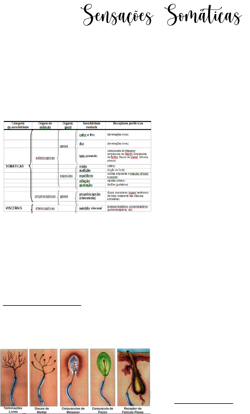 Introdução: As sensações somáticas correspondem aos mecanismos neurais responsáveis pela aquisição de informações sensoriais do que se passa em todo corpo. Classificação dos sentidos somáticos: Receptores Táteis: •Estruturas Biológicas simples ou complicadas •Possuem sensibilidade diferenciada •Modalidade da sensação – tipos de sensações experimentadas •Princípio da linha rotulada: especificidade da fibra nervosa para a transmissão de apenas uma modalidade de sensação. Tipos de receptores táteis: Terminações Nervosas Livres: Encontradas em toda a pele e em muitos outros tecidos, detectam tato e pressão. Corpúsculo de Meissner: Um receptor tátil com grande sensibilidade, terminação de fibra nervosa sensorial mielinizada grossa. Esses corpúsculos estão na pele glabra e são abundantes nas pontas dos dedos, nos lábios e em outras áreas da pele onde a capacidade de discriminar as localizações espaciais das sensações táteis está muito desenvolvida. Discos de Merkel: Esses receptores diferem dos corpúsculos de Meissner por transmitirem sinal inicialmente forte, mas que se adapta parcialmente e, em seguida, sinal mais fraco e contínuo que se adapta lentamente. Assim, eles são responsáveis por detectar os sinais mantidos, o que possibilita que seja percebido com o toque contínuo. Eles são frequentemente agrupados no órgão receptor. Transdução dos Estímulos Sensoriais em Impulsos Nervosos •Estímulo → alteração do potencial de membrana do respectivo receptor →geração do potencial •Amplitude do Receptor (max. 100mV) •Relação potencial receptor e potencial de ação: ⇒Quanto maior a intensidade do potencial receptor → maior a freqüência dos potenciais de ação ⇒Quanto maior a intensidade do estímulo → maior a amplitude do receptor, até dado momento, quando então esta aumenta muito pouco. Adaptação dos receptores •Todos sofrem adaptação, variando o tempo e a intensidade. •Receptores Fásicos: adaptação rápida. Ex:. pressão, olfato ⇒Percepção da velocidade de alteração do estado corporal, possibilitando a previsão do estado corporal daí alguns instantes. •Receptores Tônicos: adaptação lenta.Ex. dor, comp.química ⇒Informam continuamente o estado do corpo e sua relação com o ambiente. •O mecanismo de adaptação varia para cada receptor. •O tipo de fibra de condução do impulso dependerá da função desempenhada •Fibras de condução rápida •Fibras de condução lenta ⇒ O diâmetro da fibra e a velocidade de condução do impulso são diretamente proporcionais Transmissão de sinais com diferentes intensidades nos Feixes Nervosos •Somação Espacial → quanto maior a intensidade do estímulo maior o número de fibras envolvidas na condução do impulso. •Somação temporal → quanto maior a intensidade do estímulo maior a frequência de impulsos conduzidos na mesma fibra. Via Sensorial: •Cadeia de neurônios relacionada a um determinado receptor sensorial. O número de neurônios de via sensorial depende da modalidade. Vias de transmissão dos sinais somáticos para o SNC Via Sistema das Colunas Dorsais Lemenisco Medial: •Composto por fibras nervosas grandes e mielinizadas (30 a 100 m/s) •Elevado grau de orientação das fibras nervosas quanto a sua origem •Informações que exigem fidelidade espacial e temporal e rapidez •Conduzem apenas impulsos originados em mecanoceptores •Única via a transmitir a informação de vibração •Neurônios centrais possuem descarga mais intensa •A cada sinapse (bulbo, tálamo e córtex) ocorre divergência de sinais •Transmissão da discriminação entre dois pontos → a discriminação é Vias de transmissão dos sinais somáticos para o SNC •Via Sistema antero-lateral •Composto por fibras nervosas menores e mielinizadas ( 2 a 40 m/s) •Pequeno grau de orientação das fibras nervosas quanto a sua origem •Transmissão de informações que exigem pouca fidelidade espacial e temporal e rapidez •Conduzem impulsos de várias modalidades Córtex Sômato-Sensorial •Áreas Sômato-sensoriais I e II •Localização: porção anterior do lobo parietal (áreas 1,2 e 3 de Brodman) •A divisão é realizada devido a orientação espacial diferente para cada área do corpo •Área sômato-sensorial I possui representação das diferentes regiões do corpo. A extensão da representação dependerá da quantidade de receptores que cada área •Promove a percepção da localização exata da fonte da informação. •Cada lado do córtex recebe informações sensoriais oriundas exclusivamente do lado oposto do corpo •Área sômato-sensorial II não tem sua função muito bem estabelecida •Área sômato-sensorial II recebe informações oriundas do tronco encefálico, área sômato- sensorial I , áreas visuais e auditivas e outras áreas sensoriais do cérebro OBS: A remoção da Área sômato-sensorial I provoca: - perda da capacidade de localizar o local exato da fonte da informação - Incapacidade de avaliar intensidade diferente de pressão sobre o corpo - Incapacidade de avaliar o peso dos objetos - Incapacidade de reconhecer a forma dos objetos (astereognosia) - Incapacidade de reconhecer a textura dos objetos Área de Associação sômato-sensorial •Localização: porção posterior do lobo parietal (áreas 5 e 7 de Brodman) •Recebe informações oriundas da ASSI, várias regiões do tálamo, do córtex visual e do córtex auditivo •Promove integração e interpretação das sensações ao combinar informações provenientes de múltiplos pontos •Promove o armazenamento de memórias de experiências sensoriais, permitindo o relacionamento destas memórias com as experiências do momento *A remoção desta área pode causar amorfossíntese Camadas do córtex sômato-sensorial e suas funções •Possui 06 camadas, de I a VI, da superfície para a profundidade. Os neurônios de cada camada de