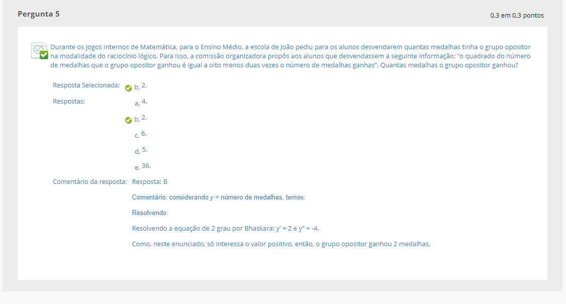 Durante os jogos internos de para Ensino Médio, a escola de João pediu para os alunos desvendarem quantas medalhas tinha grupo opositor na modalidade do raciocínio lógico. Para isso, a comissão organizadora propôs aos alunos que desvendassem a seguinte informação: 'o quadrado do número de medalhas que grupo opositor ganhou é igual a oito menos duas vezes número de medalhas ganhas'. Quantas medalhas grupo opositor ganhou?