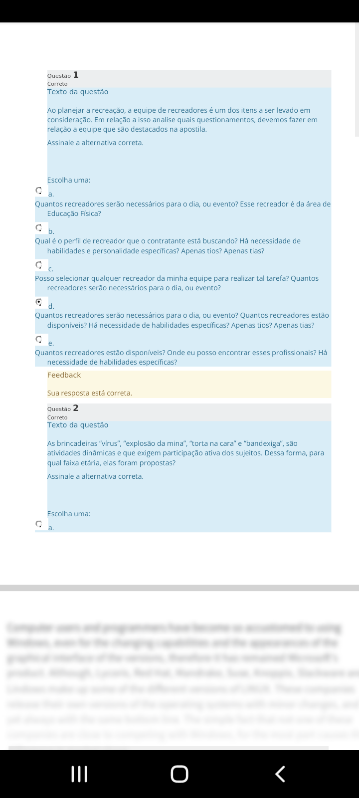 Ao planejar a recreação, a equipe de recreadores é um dos itens a ser levado em consideração. Em relação a isso analise quais questionamentos, devemos fazer em relação a equipe que são destacados na apostila. Assinale a alternativa correta. a. Quantos recreadores serão necessários para dia, ou evento? Esse recreador é da área de Educação Física? b. Qual é o perfil de recreador que contratante está buscando? Há necessidade de habilidades e personalidade específicas? Apenas tios? Apenas tias? Posso selecionar qualquer recreador da minha equipe para realizar tal tarefa? c. Quantos recreadores serão necessários para o dia, ou evento? Quantos recreadores estão disponíveis? Há necessidade de habilidades específicas? Apenas tios? Apenas tias? d. Quantos recreadores estão disponíveis? Onde eu posso encontrar esses profissionais? Há necessidade de habilidades específicas?