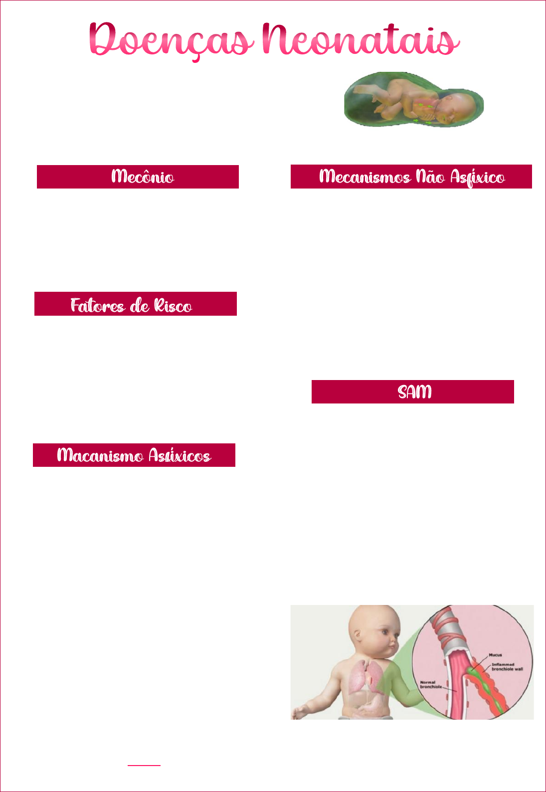 Síndrome de Aspiração de Mecônio • Secreção gastrointestinal produzida na vida intrauterina (primeiras fezes) • Eliminado, em condições normais, após o nascimento • Doenças maternas • Doenças hipertensivas • Diabetes de Melito • Deslocamento de placenta • Compressão do cordão umbilical Asfixia (sofrimento fetal) Aumento do peristaltismo Relaxamento do esfíncter anal Liberação do mecônio Broncoaspiração = SAM • Compressão abdominal do feto durante o trabalho de parto • Compressão do polo encefálico no canal do parto (estímulo vagal) • Como em IG> 42 semanas • A aspiração pode ocorrer antes do nascimento por meio da respiração tipo Gasping ou logo após o nascimento • Obstrução das vias aéreas (pequenas) • Formação de atelectasias (Colabamento das paredes dos alvéolos) • Aprisionamento progressivo de ar • Hiperinsuflação e aumento da CRF • Enfisema intersticial pulmonar, pneumotórax e pneumomediastino • Alteração do surfactante -> Hipertensão pulmonar e pneumonite química • Sintomas de início precoce e progressivo • Ao nascer: impregnação da pele, unhas, cabelos • DR: Taquipneia, gemido expiratório, BAN, retrações e sinal de hiperinsuflação • Cianose • Ausculta pulmonar inespecífica. Geralmente estertoração difusa e MV reduzido • Absorção do mecônio de 5 a 7 dias Afetas todos os campos pulmonares: • Atelectasias em extremidades • Hiperinsuflação • Infiltrada alveolar grosseiro • Condensação lobar • Pneumotórax • Pneumomediastino • Enfisema intersticial • Estratégias ventilatórias adequadas • Melhora da relação V/Q • Frequente intubação orotraqueal (IOT) • Quadro de doença obstrutiva • NO em casos mais graves