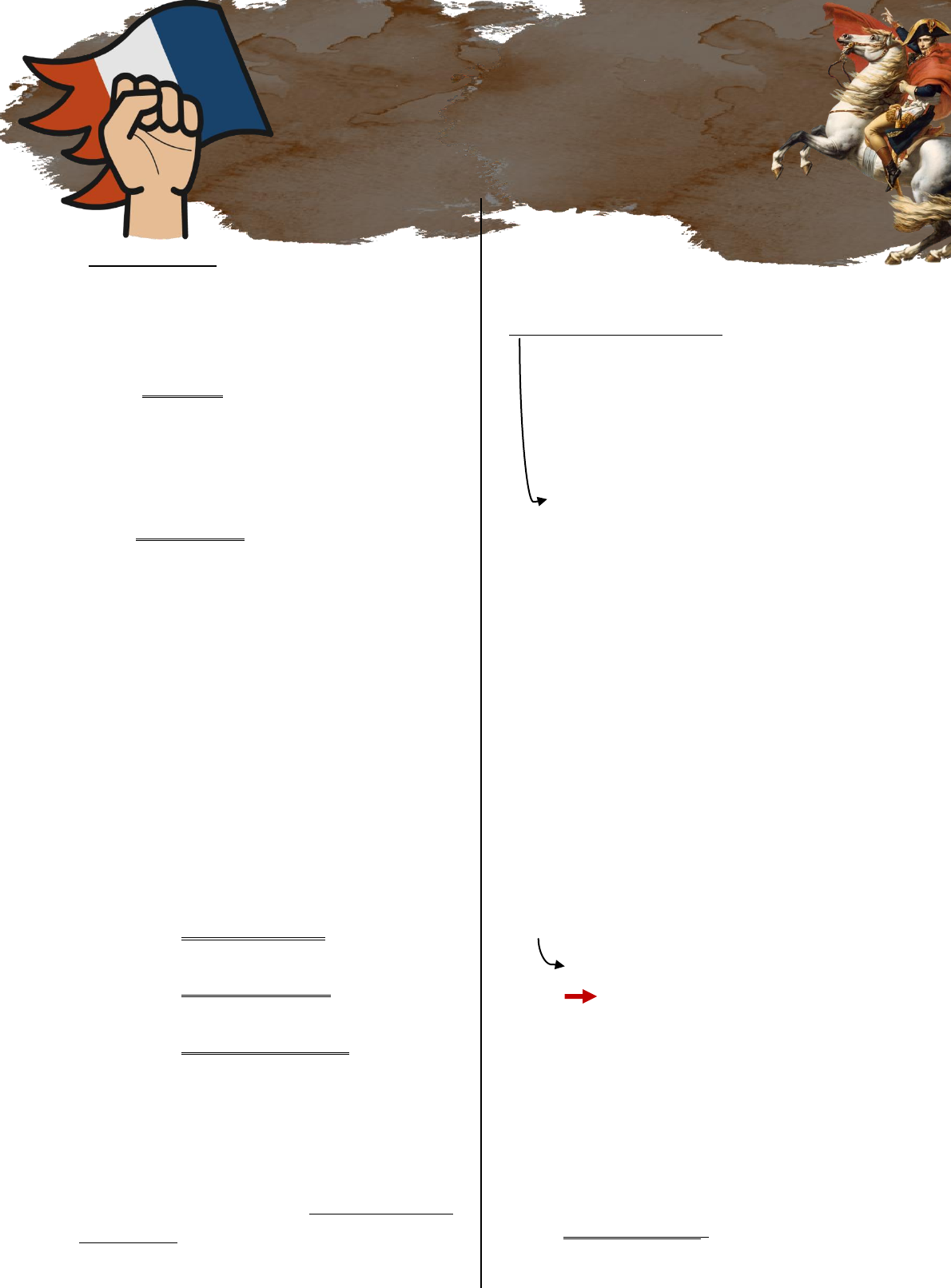 REVOLUÇÃO FRANCESA História Contemporânea das R.I -> Estrutura feudal: dividia os franceses em três grupos chamados de três ordens ou três Estados: Clero (primeiro Estado) – formado por religiosos da Igreja Católica. Se divide entre: Alto Clero: composto especialmente por bispos, de origem nobre que viviam uma vida de luxo e ostentação, boa parte deles vivam na corte e não precisavam pagar impostos. Baixo Clero: vigários de aldeias, recrutados entre o povo, viviam uma vida humilde e partilhavam as mazelas das pessoas pobres. Nobreza (segundo Estado) - privilegiados, não pagavam impostos, obtinham os cargos mais altos do Estado, além de manter direitos feudais. Terceiro Estado - formado pelo povo, representava a maioria esmagadora da população. Todos eles pagavam impostos. Composto por: Alta burguesia: empresários, grandes comerciantes, banqueiros; Média burguesia: burocratas, médicos, advogados; Pequena burguesia: artesões, pequenos lojistas e também pelos trabalhares do campo e das cidades. * Luís XIV foi o grande expoente do absolutismo francês. Durante seu reinado, que durou mais de setenta anos, construiu o Palácio de Versalhes, grande símbolo do absolutismo na França. * Quando assumiu o trono, o país passava por sérios problemas econômicos: Agricultura - entraves ligados as tradições feudais Indústria e comercio - burguesia- entraves ligados à nobreza Para tentar contornar essa situação, os ministros da economia aumentaram os impostos. Ainda, tentaram criar uma arrecadação de impostos sobre as propriedades fundiárias, mas essa idéia foi rechaçada pelo clero e pela alta nobreza, que não estavam dispostos a perder nenhum privilégio. * Luis XIV convoca os Estados Gerais (antigo órgão consultivo da monarquia, constituído pelos três estados: clero, nobreza e povo) cada ordem tinha direito apenas a um voto, de maneira que, frequentemente, o clero e a nobreza se uniam, totalizando dois votos. Assim, o voto do povo se tornava indiferente. Líderes do povo: Votação por cabeça, não Estado Conflito * Terceiro Estado se retira e convoca a Assembleia Nacional, pois queriam que fosse votada uma nova Constituição para o reino. Assim, naquele momento, transformada em Assembleia Constituinte. * Queda da Bastilha em 14 de julho de 1789 – povo invade prisão de Paris onde ficavam encarcerados os inimigos políticos do rei. Tem-se então o começo da Revolução Francesa. Em tempos de revolução nada é mais poderoso do que a queda de símbolos. * Sans-Culottes: faziam parte do terceiro Estado. Tratava-se do proletariado urbano, como artesões, jornaleiros, assalariados em geral que, quando atingidos pela fome, miséria e carestia, se revoltavam contra o governo e sempre eram reprimidos. foram fundamentais, na medida em que radicalizaram todas as ações. Revolução Francesa – 1ª fase Grande Medo: muitos nobres deixaram a França e buscaram abrigo e apoio em outras monarquias absolutistas pela Europa, pois diversas propriedades foram saqueadas e castelos queimados. Criação da Guarda Nacional (1789-1871): consistia numa milícia formada por cidadãos de cada município francês, cuja função era fazer a defesa militar da região num momento de guerra e garantir a ordem em tempo de paz. Assembleia Nacional (1789-1792): aboliu os privilégios feudais e confiscou os bens da Igreja Católica, colocando fim as marcas feudais que ainda permaneciam na sociedade. Promulgação da Declaração dos Direitos do Homem e do Cidadão -> serviu de preambulo à primeira Constituição da Revolução Francesa, que foi aprovada em 1791. 1791 - Primeira Constituição Francesa - não era mais uma país absolutista, agora se tornava uma monarquia constitucional, com divisão dos poderes, isto é, o rei deveria se submeter à Constituição. Luís XVI teve seu poder drasticamente reduzido, o que o levou a conspirar com outros nobres de países absolutistas vizinhos, visando retomar seu poder centralizador. Em 1791 ele tentou fugir para Áustria, mas foi descoberto. Forças políticas divididas: girondinos (nobreza/alta burguesia - direita) e jacobinos (baixo clero/baixa burguesia/ trabalhadores – esquerda = mais radicais) Nobres começam a fugir da França França é invadida por aliados do rei, defensores do Absolutismo (Áustria e Prússia) Revolução Francesa – 2ª fase Fase mais radical Exército popular – comuna comunista – liderados pelos jacobinos Monarquia abolida (1792) Convenção Nacional (1792-95); terror 1793 – Luís XVI é guilhotinado Coligação estrangeira contra a França (Áustria, Prússia, Espanha, Holanda e Inglaterra) Radicalização jacobina Comitê de Salvação Pública (comandava os exércitos e administrava as finanças públicas) Comitê de Salvação Nacional (responsável por conter as revoltas internas) Tribunal Revolucionário (prendia e julgava os traidores da revolução, comandado por Robespierre) Período de terror – guilhotina Convenção Termidora – se utilizou da violência para colocar fim aquele período do terror, assim Robespierre e mais de 70 jacobinos foram guilhotinados. Esse evento sinalizava a retomada do poder pelos girondinos. Revolução Francesa – 3ª fase 1795 - Nova constituição aprovada, menos radical, sob a perspectiva da burguesia, retomando algumas medidas que haviam sido suspensas anteriormente. Tratava-se de uma constituição com características acentuadamente burguesas como o direito à propriedade e ao lucro. Nesta constituição o poder executivo foi transformado num diretório composto por cinco diretores e oito ministros. Nesse momento, a França passou por um período de crise interna e externa, o que levou os girondinos a endurecer o governo. Os jacobinos continuavam disputando o poder. Assim, a burguesia com receio de que os jacobinos tomassem o poder novamente, investiu no fortalecimento do exército. Em 9 de novembro de 1799, conhecido como 18 de Brumário no calendário