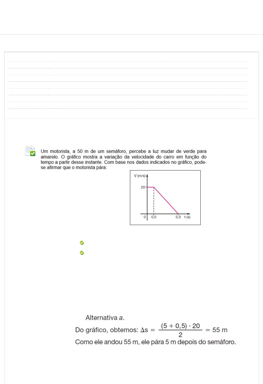 25/05/2023, 20:18 Revisar envio do teste: QUESTIONÁRIO UNIDADE II – FÍSICA... https://ava.ead.unip.br/webapps/assessment/review/review.jsp?attempt_id=_93980623_1&course_id=_286210_1&content_id=_3385849_1&outc… 1/8 Revisar envio do teste: QUESTIONÁRIO UNIDADE IIFÍSICA GERAL 6534-90_15402_R_E1_20231 CONTEÚDO Usuário fabiana.lima138 @aluno.unip.br Curso FÍSICA GERAL Teste QUESTIONÁRIO UNIDADE II Iniciado 01/05/23 10:01 Enviado 01/05/23 11:12 Status Completada Resultado da tentativa 2,5 em 2,5 pontos Tempo decorrido 1 hora, 10 minutos Resultados exibidos Todas as respostas, Respostas enviadas, Respostas corretas, Comentários, Perguntas respondidas incorretamente Pergunta 1 Resposta Selecionada: a. Respostas: a. b. c. d. e. Comentário da resposta: 5 m depois do semáforo. 5 m depois do semáforo. 10 m antes do semáforo. Exatamente sob o semáforo. 5 m antes do semáforo. 10 m depois do semáforo. . UNIP EAD BIBLIOTECAS MURAL DO ALUNO TUTORIAIS LABORATÓRIOSCONTEÚDOS ACADÊMICOS 0,25 em 0,25 pontos http://company.blackboard.com/ https://ava.ead.unip.br/webapps/blackboard/execute/courseMain?course_id=_286210_1 https://ava.ead.unip.br/webapps/blackboard/content/listContent.jsp?course_id=_286210_1&content_id=_3385739_1&mode=reset https://ava.ead.unip.br/webapps/portal/execute/tabs/tabAction?tab_tab_group_id=_10_1 https://ava.ead.unip.br/webapps/portal/execute/tabs/tabAction?tab_tab_group_id=_27_1 https://ava.ead.unip.br/webapps/portal/execute/tabs/tabAction?tab_tab_group_id=_47_1 https://ava.ead.unip.br/webapps/portal/execute/tabs/tabAction?tab_tab_group_id=_29_1 https://ava.ead.unip.br/webapps/portal/execute/tabs/tabAction?tab_tab_group_id=_64_1 https://ava.ead.unip.br/webapps/portal/execute/tabs/tabAction?tab_tab_group_id=_25_1 https://ava.ead.unip.br/webapps/login/?action=logout 25/05/2023, 20:18 Revisar envio do teste: QUESTIONÁRIO UNIDADE II – FÍSICA... https://ava.ead.unip.br/webapps/assessment/review/review.jsp?attempt_id=_93980623_1&course_id=_286210_1&content_id=_3385849_1&outc… 2/8 Pergunta 2 Resposta Selecionada: e. Respostas: a. b. c. d. e. Comentário da resposta: 75 25 50 -25 -50 75 . Pergunta 3 Resposta Selecionada: b. 10 m/s 0,25 em 0,25 pontos 0,25 em 0,25 pontos 25/05/2023, 20:18 Revisar envio do teste: QUESTIONÁRIO UNIDADE II – FÍSICA... https://ava.ead.unip.br/webapps/assessment/review/review.jsp?attempt_id=_93980623_1&course_id=_286210_1&content_id=_3385849_1&outc… 3/8 Respostas: a. b. c. d. e. Comentário da resposta: 20 m/s 10 m/s 30 m/s 40 m/s 50 m/s . Pergunta 4 Resposta Selecionada: d. Respostas: a. b. c. d. e. Comentário da resposta: 30 s 7,8 s 15,6 s 28 s 30 s 60 s . 0,25 em 0,25 pontos 25/05/2023, 20:18 Revisar envio do teste: QUESTIONÁRIO UNIDADE II – FÍSICA... https://ava.ead.unip.br/webapps/assessment/review/review.jsp?attempt_id=_93980623_1&course_id=_286210_1&content_id=_3385849_1&outc… 4/8 Pergunta 5 Resposta Selecionada: e. Respostas: a. b. c. d. e. Comentário da resposta: 7,75 m/s 3 m/s 4,25 m/s 5 m/s 6,25 m/s 7,75 m/s . 0,25 em 0,25 pontos 25/05/2023, 20:18 Revisar envio do teste: QUESTIONÁRIO UNIDADE II – FÍSICA... https://ava.ead.unip.br/webapps/assessment/review/review.jsp?attempt_id=_93980623_1&course_id=_286210_1&content_id=_3385849_1&outc… 5/8 Pergunta 6 Resposta Selecionada: a. Respostas: a. b. c. d. e. Comentário da resposta: 0,50 0,50 4,0 8,0 12,0 16,0 . Pergunta 7 Resposta Selecionada: c. Respostas: a. b. c. Suponha que em uma partida de futebol, o goleiro, ao bater o tiro de meta, chuta a bola, imprimindo-lhe uma velocidade v0 cujo vetor forma, com a horizontal, um ângulo α. Desprezando a resistência do ar, são feitas as seguintes afirmações: I. No ponto mais alto da trajetória, a velocidade vetorial da bola é nula. II. O vetor velocidade inicial pode ser decomposto segundo as direções horizontal e vertical. III. No ponto mais alto da trajetória é nulo o valor da aceleração da gravidade. IV. No ponto mais alto da trajetória é nulo o valor da componente vertical da velocidade. Estão corretas as afirmações: II e IV I, II e III I, III e IV II e IV 0,25 em 0,25 pontos 0,25 em 0,25 pontos 25/05/2023, 20:18 Revisar envio do teste: QUESTIONÁRIO UNIDADE II – FÍSICA... https://ava.ead.unip.br/webapps/assessment/review/review.jsp?attempt_id=_93980623_1&course_id=_286210_1&content_id=_3385849_1&outc… 6/8 d. e. Comentário da resposta: III e IV I e II . Pergunta 8 Resposta Selecionada: b. Respostas: a. b. c. d. e. Comentário da resposta: Uma partícula em movimento retilíneo desloca-se de acordo com a equação v = - 4 + t, em que v representa a velocidade escalar em m/s e t, o tempo em segundos, a partir do instante zero. O deslocamento dessa partícula passados 8 segundos é: zero 24 m zero 2 m 4 m 8 m . Pergunta 9 0,25 em 0,25 pontos 0,25 em 0,25 pontos 25/05/2023, 20:18 Revisar envio do teste: QUESTIONÁRIO UNIDADE II – FÍSICA... https://ava.ead.unip.br/webapps/assessment/review/review.jsp?attempt_id=_93980623_1&course_id=_286210_1&content_id=_3385849_1&outc… 7/8 Resposta Selecionada: a. Respostas: a. b. c. d. e. Comentário da resposta: Uma partícula parte do repouso e em 5 segundos percorre 100 metros. Considerando o movimento retilíneo e uniformemente variado, podemos afirmar que a aceleração da partícula é de: . . . . . Nenhuma das anteriores . Pergunta 10 Resposta Selecionada: c. Respostas: a. b. c. d. e. Uma roda tem 0,4 m de raio e gira com velocidade constante, dando 20 voltas por minuto. Quanto tempo gasta um ponto de sua periferia para percorrer 200 m? 4 min 8 min 12,5 min 4 min 7,5 min NDA. 0,25 em 0,25 pontos 25/05/2023, 20:18 Revisar envio do teste: QUESTIONÁRIO UNIDADE II – FÍSICA... https://ava.ead.unip.br/webapps/assessment/review/review.jsp?attempt_id=_93980623_1&course_id=_286210_1&content_id=_3385849_1&outc… 8/8 Quinta-feira, 25 de Maio de 2023 20h18min42s GMT-03:00 Comentário da resposta: . ← OK