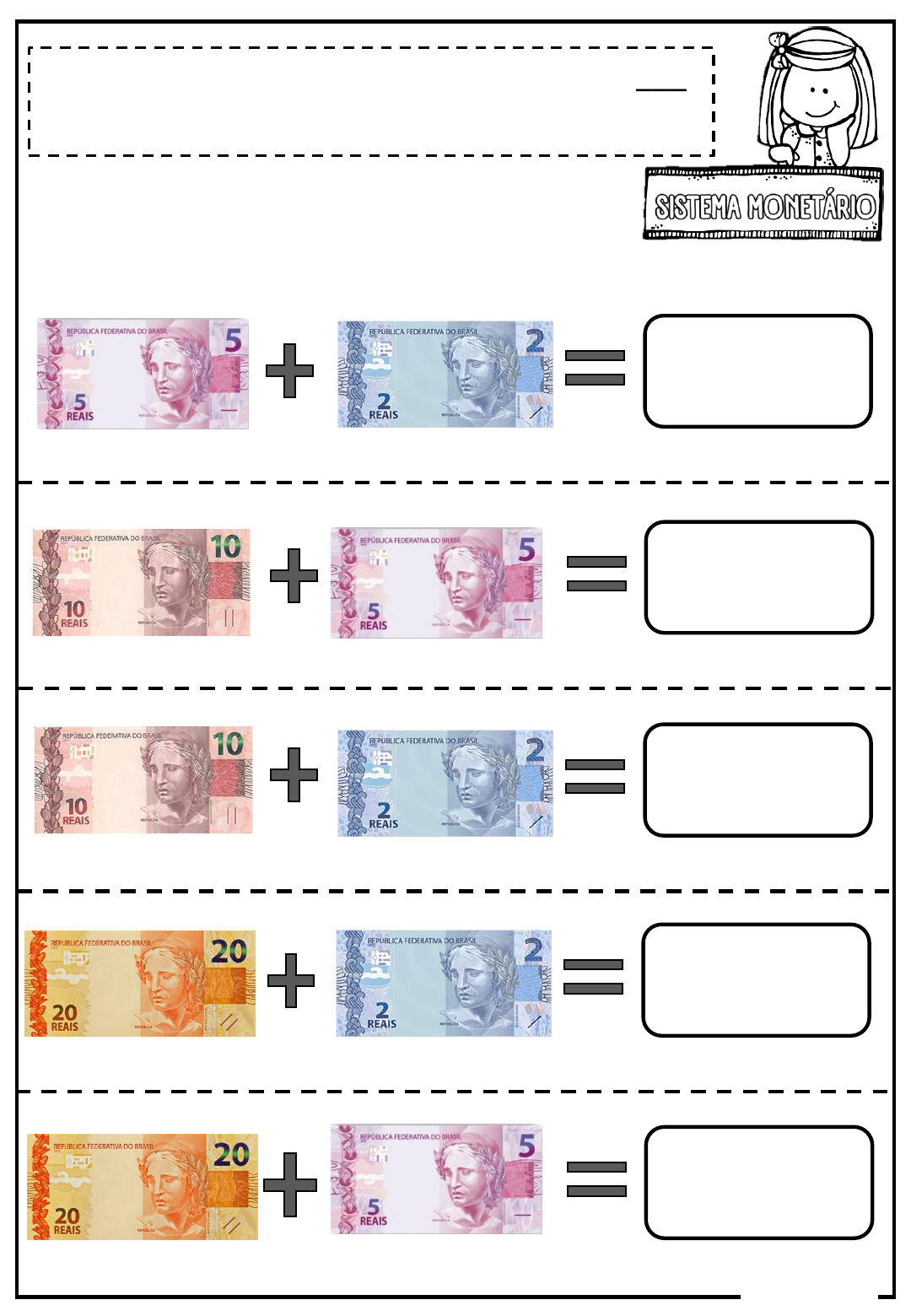 NOME _________________________________ DATA _____/_____/__________ ISRAELA KOTONA REALIZE AS SOMAS E ESCREVA OS RESULTADOS NOME _________________________________ DATA _____/_____/__________ ISRAELA KOTONA REALIZE AS SOMAS E ESCREVA OS RESULTADOS NOME _________________________________ DATA _____/_____/__________ ISRAELA KOTONA REALIZE AS SOMAS E ESCREVA OS RESULTADOS NOME _________________________________ DATA _____/_____/__________ ISRAELA KOTONA REALIZE AS SOMAS E ESCREVA OS RESULTADOS NOME _________________________________ DATA _____/_____/__________ ISRAELA KOTONA REALIZE AS SOMAS E ESCREVA OS RESULTADOS NOME _________________________________ DATA _____/_____/__________ ISRAELA KOTONA REALIZE AS SOMAS E ESCREVA OS RESULTADOS NOME _________________________________ DATA _____/_____/__________ ISRAELA KOTONA REALIZE AS SOMAS E ESCREVA OS RESULTADOS NOME _________________________________ DATA _____/_____/__________ ISRAELA KOTONA REALIZE AS SOMAS E ESCREVA OS RESULTADOS NOME _________________________________ DATA _____/_____/__________ ISRAELA KOTONA REALIZE AS SOMAS E ESCREVA OS RESULTADOS NOME _________________________________ DATA _____/_____/__________ ISRAELA KOTONA REALIZE AS SOMAS E ESCREVA OS RESULTADOS NOME _________________________________ DATA _____/_____/__________ ISRAELA KOTONA VAMOS CALCULAR E REGISTRAR O VALOR EM DINHEIRO QUE CADA CRIANÇA POSSUI? R$ _______ JULIA R$ _______ RODRIGO R$ _______ ANA R$ _______ BETO NOME _________________________________ DATA _____/_____/__________ ISRAELA KOTONA VAMOS CALCULAR E REGISTRAR O VALOR EM DINHEIRO QUE CADA CRIANÇA POSSUI? R$ _______ BRUNO R$ _______ RAFAEL R$ _______ JOANA R$ _______ VANIA NOME _________________________________ DATA _____/_____/__________ ISRAELA KOTONA VAMOS CONTAR? R$ _______ R$ _______ R$ _______ R$ _______ R$ _______ R$ _______ NOME _________________________________ DATA _____/_____/__________ ISRAELA KOTONA VAMOS CONTAR? R$ _______ R$ _______ R$ _______ R$ _______ R$ _______ R$ _______ NOME _________________________________ DATA _____/_____/__________ ISRAELA KOTONA VAMOS CONTAR? R$ _______ R$ _______ R$ _______ R$ _______ R$ _______ R$ _______ NOME _________________________________ DATA _____/_____/__________ ISRAELA KOTONA VAMOS CONTAR? R$ _______ R$ _______ R$ _______ R$ _______ R$ _______ R$ _______ NOME _________________________________ DATA _____/_____/__________ ISRAELA KOTONA OBSERVE AS QUANTIDADES E MARQUE O CERTO. ( ) 10 REAIS ( ) 12 REAIS ( ) 15 REAIS ( ) 7 REAIS ( ) 8 REAIS ( ) 9 REAIS ( ) 5 REAIS ( ) 11 REAIS ( ) 10 REAIS ( ) 14 REAIS ( ) 15 REAIS ( ) 10 REAIS ( ) 12 REAIS ( ) 11 REAIS ( ) 21 REAIS ( ) 19 REAIS ( ) 20 REAIS ( ) 30 REAIS ( ) 5 REAIS ( ) 6 REAIS ( ) 4 REAIS ( ) 13 REAIS ( ) 11 REAIS ( ) 12 REAIS NOME _________________________________ DATA _____/_____/__________ ISRAELA KOTONA OBSERVE AS QUANTIDADES E MARQUE O CERTO. ( ) 30 REAIS ( ) 22 REAIS ( ) 25 REAIS ( ) 22 REAIS ( ) 4 REAIS ( ) 40 REAIS ( ) 5 REAIS ( ) 55 REAIS ( ) 60 REAIS ( ) 20 REAIS ( ) 15 REAIS ( ) 25 REAIS ( ) 120 REAIS ( ) 110 REAIS ( ) 210 REAIS ( ) 60 REAIS ( ) 20 REAIS ( ) 30 REAIS ( ) 53 REAIS ( ) 7 REAIS ( ) 52 REAIS ( ) 14 REAIS ( ) 24 REAIS ( ) 23 REAIS NOME _________________________________ DATA _____/_____/__________ ISRAELA KOTONA OBSERVE AS QUANTIDADES E MARQUE O CERTO. ( ) 10 REAIS ( ) 22 REAIS ( ) 15 REAIS ( ) 14 REAIS ( ) 11 REAIS ( ) 17 REAIS ( ) 35 REAIS ( ) 32 REAIS ( ) 25 REAIS ( ) 25 REAIS ( ) 20 REAIS ( ) 15 REAIS ( ) 40 REAIS ( ) 20 REAIS ( ) 30 REAIS ( ) 52 REAIS ( ) 51 REAIS ( ) 53 REAIS NOME _________________________________ DATA _____/_____/__________ ISRAELA KOTONA OBSERVE AS QUANTIDADES E MARQUE O CERTO. ( ) 10 REAIS ( ) 22 REAIS ( ) 25 REAIS ( ) 34 REAIS ( ) 32 REAIS ( ) 22 REAIS ( ) 35 REAIS ( ) 30 REAIS ( ) 40 REAIS ( ) 63 REAIS ( ) 62 REAIS ( ) 53 REAIS ( ) 40 REAIS ( ) 50 REAIS ( ) 30 REAIS ( ) 120 REAIS ( ) 110 REAIS ( ) 130 REAIS NOME _________________________________ DATA _____/_____/__________ ISRAELA KOTONA ( ) 8 REAIS ( ) 7 REAIS ( ) 9 REAIS ( ) 12 REAIS ( ) 10 REAIS ( ) 15 REAIS 1- OBSERVE AS QUANTIDADES E MARQUE O CERTO. ( ) 22 REAIS ( ) 12 REAIS ( ) 32 REAIS ( ) 10 REAIS ( ) 20 REAIS ( ) 30 REAIS 2- OBSERVE A QUANTIA QUE MARCOS E REBECA TÊM E RESOLVA AS QUESTÕES A SEGUIR. A- QUANTO MARCOS TEM? B- QUANTO REBECA TEM? C- QUEM TEM MAIS? NOME _________________________________ DATA _____/_____/__________ ISRAELA KOTONA 1- OBSERVE A QUANTIA QUE ARTUR E TALITA TÊM E RESOLVA AS QUESTÕES A SEGUIR. A- QUANTO ARTUR TEM? B- QUANTO TALITA TEM? B- QUEM TEM MAIS? C- QUANTO TALITA TEM A MAIS NOME _________________________________ DATA _____/_____/__________ ISRAELA KOTONA 1- LIGUE VINTE E CINCO CENTAVOS DEZ CENTAVOS UM REAL CINCO CENTAVOS CINQUENTA CENTAVOS NOME _________________________________ DATA _____/_____/__________ ISRAELA KOTONA 1- LIGUE CINQUENTA REAIS CEM REAIS CINCO REAIS VINTE REAIS DUZENTOS REAIS DEZ REAIS DOIS REAIS NOME _________________________________ DATA _____/_____/__________ ISRAELA KOTONA HÁ _________ REAIS HÁ _________ REAIS HÁ _________ REAIS HÁ _________ REAIS HÁ _________ REAIS HÁ _________ REAIS HÁ _________ REAIS HÁ _________ REAIS NOME _________________________________ DATA _____/_____/__________ ISRAELA KOTONA HÁ _________ REAIS HÁ _________ REAIS HÁ _________ REAIS HÁ _________ REAIS HÁ _________ REAIS HÁ _________ REAIS HÁ _________ REAIS HÁ _________ REAIS NOME _________________________________ DATA _____/_____/__________ ISRAELA KOTONA HÁ _________ REAIS HÁ _________ REAIS HÁ _________ REAIS HÁ _________ REAIS HÁ _________ REAIS HÁ _________ REAIS HÁ _________ REAIS HÁ _________ REAIS ISRAELA KOTONA É PRECISO TER DINHEIRO PARA COMPRARALGUMA COISA. NO BRASIL A MOEDA QUE USAMOS É O REAL. O SÍMBOLO DO REAL É O R$. OBSERVE AS MOEDAS E SEUS VALORES: CINCO CENTAVOS DEZ CENTAVOS VINTE E CINCO CENTAVOS CINQUENTA CENTAVOS UM REAL AGORA OBSERVE AS CÉDULAS QUE SÃO AS NOTAS: DOIS REAIS CINCO REAIS DEZ REAIS VINTE REAIS CINQUENTA REAIS CEM 