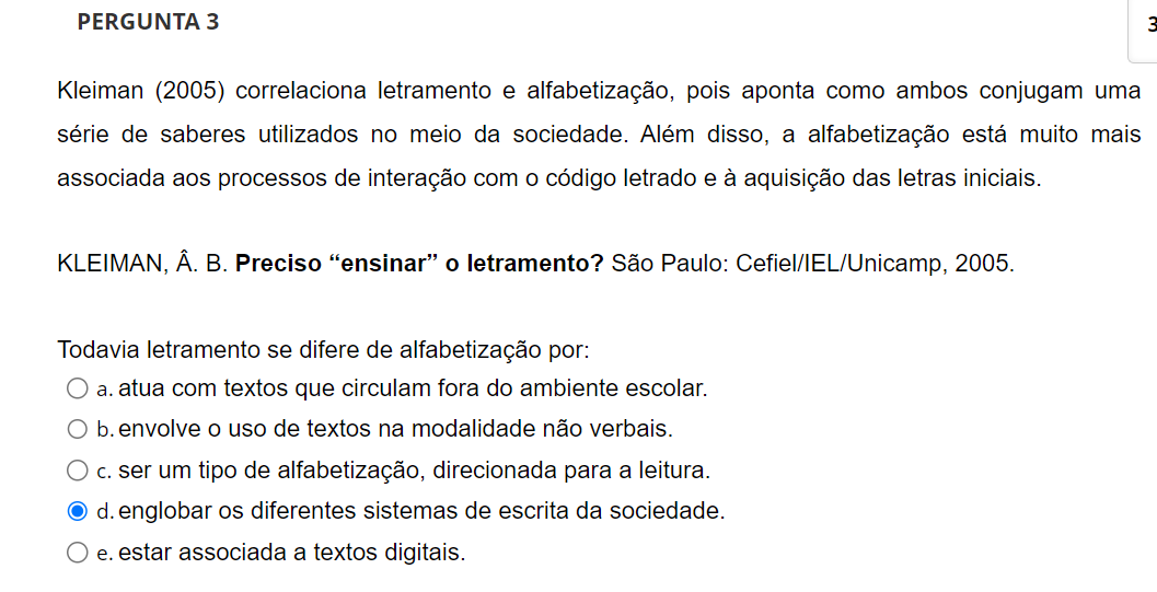 Kleiman (2005) correlaciona letramento e alfabetização, pois aponta como ambos conjugam uma série de saberes utilizados no meio da sociedade. A alfabetização está muito mais associada aos processos de interação com o código letrado e à aquisição das letras iniciais. a. atua com textos que circulam fora do ambiente escolar. b. envolve o uso de textos na modalidade não verbais. c. ser um tipo de alfabetização, direcionada para a leitura. d. englobar os diferentes sistemas de escrita da sociedade. e. estar associada a textos digitais.
