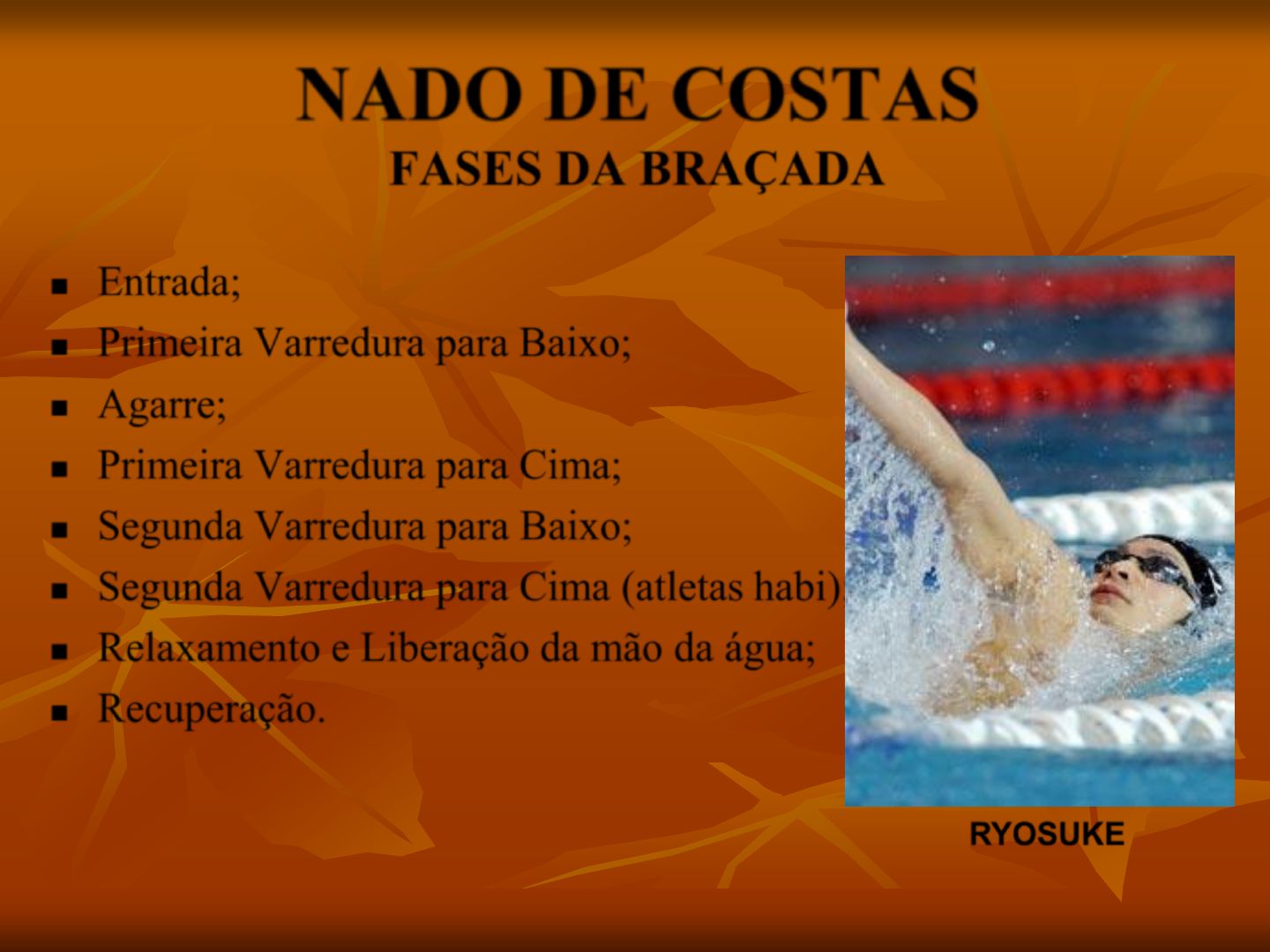 NADO DE COSTAS FASES DA BRAÇADA Entrada; Primeira Varredura para Baixo; Agarre; Primeira Varredura para Cima; Segunda Varredura para Baixo; Segunda Varredura para Cima (atletas habi); Relaxamento e Liberação da mão da água; Recuperação. RYOSUKE TRAJETÓRIA DA BRAÇADA (VISTA LATERAL) REGRA DO NADO COSTAS PERNADA DE COSTAS REGRAS RELACIONADAS À PARTIDA SAÍDA DO NADO DE COSTAS FABÍOLA MOLINA FABÍOLA MOLINA FERNANDA ALVARENGA THIAGO PEREIRA NOVO BLOCO – SAÍDA DE COSTAS VIRADA DE COSTAS Ajuste na aproximação à borda; Mudança de decúbito; Giro; Impulsão; Deslocamento submerso; Alteração da Regra no Congresso Técnico no Mundial do Canadá – 2005. REGRA DA VIRADA APRENDIZADO Posição do corpo e cabeça; Propulsão de pernas; Rolamento; Propulsão de braços; Coordenação do nado; Chegada; Virada simples. APRIMORAMENTO TÉCNICO Propulsão de pernas; Posicionamento de cabeça e corpo; Rolamento; Recuperação da braçada; Entrada da mão; Fases aquáticas da braçada; Coordenação do nado; Saída do bloco de partida; Virada de costas; Chegada.