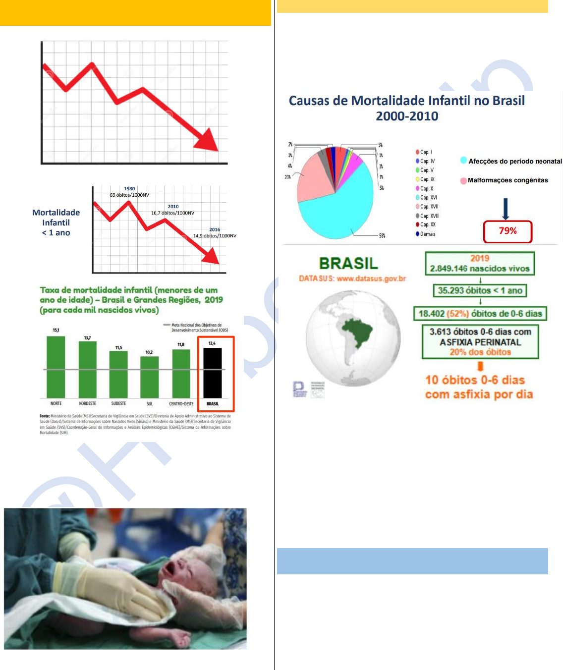 Herbert.sdp10@uni9.edu.br 1 REANIMAÇÃO NEONATAL Reanimação do RN >34 semanas em sala de parto -Mortalidade de < 5 anos: Redução de 78% em 30 anos. -Asfixia perinatal é um importante problema de saúde pública no BR. -Asfixia perinatal é relatado como a 3° ou 4 ° causa de morte na infância, sendo superada apenas por prematuridade e anomalias congênitas. MORTALIDADE PERINATAL: IMPORTÂNCIA ➢ No mundo: 2,5 milhões óbitos RN/Ano ➢ 7000 óbitos RN/Dia ➢ Em 2018: 47% dos óbitos em crianças < 5anos. ➢ 30-35% das mortes neonatais são causadas por asfixia perinatal ➢ 1 Milhão óbitos/Ano -1 em 10 RN necessita de ventilação com pressão positiva para iniciar ou manter movimentos respiratórios efetivos; -1 em cada 1000 requer intubação traqueal, massagem cardíaca e medicações, desde que a ventilação seja aplicada de modo adequado. -A ventilação pulmonar é o procedimento mais importante e efetivo na reanimação em sala de parto e quando necessário, deve ser iniciado no 1 minuto de vida. As intervenções para reduzir a morbidade e a mortalidade neonatal associadas a asfixia perinatal 1) Prevenção primária-Melhora da saúde materna 2) Preparo das maternidades 3) Reanimação neonatal adequada 4) Tratamento das complicações do processo asfíxico Herbert.sdp10@uni9.edu.br 2 Epidemiologia ➢ 2 em cada 10 RN-Não chora ou não respira ➢ 1 em cada 10 RN-Necessita de pressão positiva ➢ 1-2 em cada 100 RN- Necessita de intubação traqueal ➢ 1-3 em cada 1000 RN-Reanimação avançada intubação traqueal + Massagem cardíaca e/ou medicação Estima-se que, no Brasil, a cada ano, ao redor de 500.000 crianças necessitem de ajuda para iniciar e manter a respiração ao nascer. Qual a importância do minuito ouro ? A Importância do minuto ouro é fazer o RN respirar. Transição Cardiorrespiratória Transição cardiorrespiratória para eliminação do líquido pulmonar, tem por finalidade: Eliminação do líquido pulmonar, Vasodilatação pulmonar, e Mudança do padrão de circulação. PREPARO P/ A REANIMAÇÃO ➢ Anamnese (materna) ➢ Preparo do ambiente e material (23-25°C, material testado) ➢ Equipe (Divisão de função de cada membro da equipe) História materna ➢ Intercorrências clínicas ➢ Intercorrências gestacionais ➢ Intercorrências no trabalho de parto a parto ➢ Gestação é de termo? FATORES ANTENATAIS Condições associada à necessidade de reanimação ao nascer • Idade < 16 ou > 35 anos • Diabetes • Sd. Hipertensivas • Doenças Maternas • Infecção materna • Aloimunização ou anemia fetal • Uso de medicações • Uso de drogas ilícitas • Óbito fetal ou neonatal anterior • Cuidado pré-natal • Idade gestacional < 39 ou >41 semana • Gestação múltipla • Rotura precoce de membranas • Polidrâmnio ou Oligoâmnio • Diminuição da atividade fetal • Sangramento no 2° ou 3° trimestre • Discrepância entre IG e peso • Hidropisia Fetal • Malformação fetal #RN baixo peso e baixa IG há mais chance de haver uma reanimação. FATORES RELACIONADOS AO PARTO? • Parto cesáreo • Uso de fórceps ou extração a vácuo • Apresentação não cefálica • Trabalho de parto prematuro • Parto taquitócico • Corioamnionite • Rotura de membras >18H • Segundo estágio do trabalho de parto >2H • Alteração da FC fetal • Anestesia geral • Hipertonia uterina • Líquido amniótico meconial • Prolapso ou rotura de cordão • Nó verdade de cordão • Uso de opioides 4H anteriores • Descolamento prematura de placenta • Placenta prévia • Sangramento intraparto #Parto cesáreo, entre 37-39 semanas , mesmo sem fatores de risco antenatais para asfixia, eleva a chance de que a ventilação ao nascer seja necessária. -SBP= Recomenda um profissional habilitado p/ fazer Reanimação. EQUIPAMENTOS 1) Fonte de calor radiante 2) Fontes de O2 e vácuo 3) Material para aspiração 4) Material para ventilação 5) Oxímetro (Blender) 6) Monitor cardíaco 7) Material para intubação 8) Medicações -Medicações-Adrenalina e soro -Todo material deve ser preparado, testado e estar disponível, em local fácil acesso, antes do nascimento. Herbert.sdp10@uni9.edu.br 3 1°saber se é maior ou igual a 34 semanas. Portanto, são necessárias perguntas sobre: 1. >/= 34 semanas? 2. Tônus? flexão? 3. Se chorou? Se for ‘’SIM’’, para essas 3 perguntas não precisa de reanimação, e significa que o RN apresenta boa vitalidade, independente das características do líquido amniótico. Agora, se for ‘’Não’’ para algumas delas, deve iniciar a REANIMAÇÃO. -Mecônio é um sinal de asfixia. -Logo após a extração completa do concepto da cavidade uterina, avalia-se se o RN começou a respirar ou chorar e se o tônus muscular está em flexão. -FC o principal norteador da decisão de indicar as diversas manobras de reanimação. CLAMPEMENTO DO CORDÃO UMBILICAL RN >34 SEMANAS -No nascimento se o RN é termo, está respirando ou chorando, com tônus muscular em flexão, independentemente do aspecto do líquido amniótico, ele não necessita de nenhuma manobra de reanimação. Nesse caso, deixa ele com mãe. -Deixar junto com mãe, o RN na posição de barriga com barriga ou no seio da mãe. -Deixa o cordão junto da mãe, por 1-3 min, isso se chama clampeamento tardio. -Deve-se cortar o cordão umbilical quando ele parar de pulsar. Assim, passa mais hemácias da placenta para o RN (hemácias com tipagem sanguínea do próprio bebê). Qual a vantagem do clampeamento tardio? R: Aumenta o vínculo materno e melhora o índice hematimétrico. -Melhor concentração de ferritina nos primeiros 3 a 6 meses Desvantagem= Possível icterícia. CLAMPEAMENTO DO CORDÃO UMBILICAL Circulação placentária não intacta (DPP, Placenta prévia, Rotura, Prolapso ou nó verdadeiro de cordão) Ausência de choro ou respiração regular Tônus muscular flácido CLAMPEMENTO IMEDIATO! Quando fazer o cl