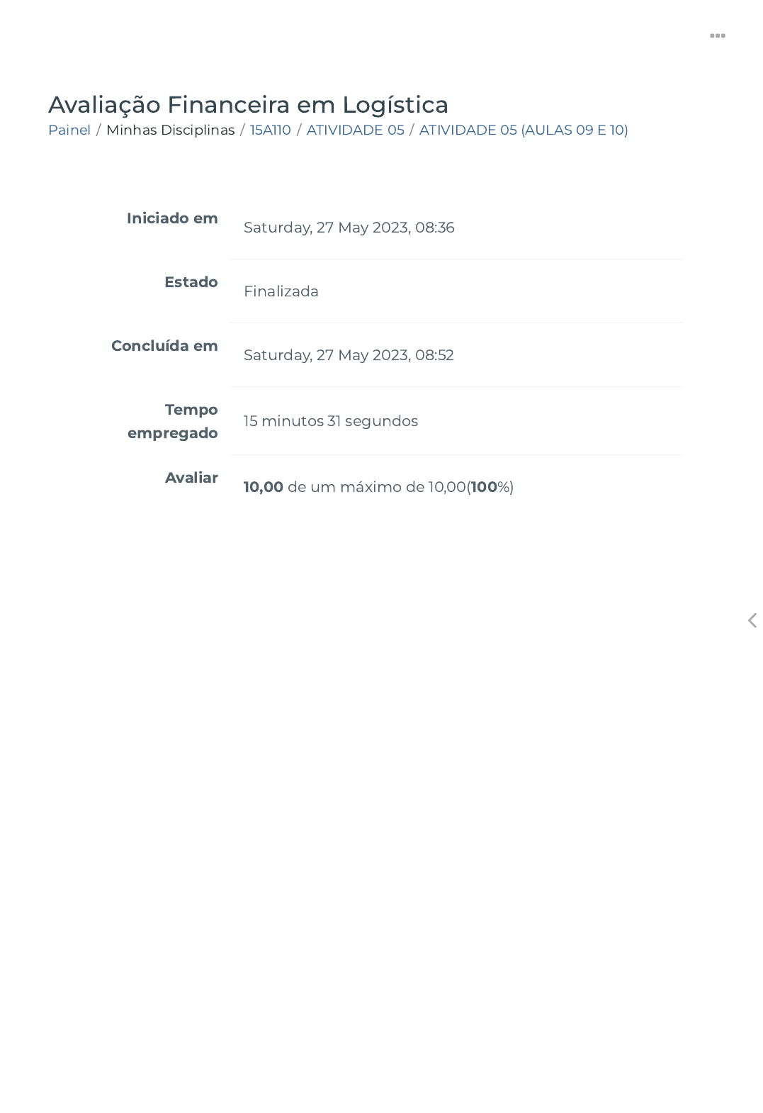27/05/2023, 08:52 ATIVIDADE 05 (AULAS 09 E 10) https://ava.politecnicabr.com.br/mod/quiz/review.php?attempt=4949560 1/9 Painel / Minhas Disciplinas / 15A110 / ATIVIDADE 05 / ATIVIDADE 05 (AULAS 09 E 10) Avaliação Financeira em Logística Iniciado em Saturday, 27 May 2023, 08:36 Estado Finalizada Concluída em Saturday, 27 May 2023, 08:52 Tempo empregado 15 minutos 31 segundos Avaliar 10,00 de um máximo de 10,00(100%) https://ava.politecnicabr.com.br/my/ https://ava.politecnicabr.com.br/course/view.php?id=869 https://ava.politecnicabr.com.br/course/view.php?id=869#section-16 https://ava.politecnicabr.com.br/mod/quiz/view.php?id=35326 https://ava.politecnicabr.com.br/ 27/05/2023, 08:52 ATIVIDADE 05 (AULAS 09 E 10) https://ava.politecnicabr.com.br/mod/quiz/review.php?attempt=4949560 2/9 Questão 1 Correto Atingiu 1,50 de 1,50 Marque a opção correta conforme a�rmativa a seguir. É também conhecido como dispêndio, ocorre no momento da compra de um produto, serviço ou direito, e deve gerar um sacrifício �nanceiro para a entidade, representado por entrega ou promessa de entrega de ativos, normalmente dinheiro. Trata-se de: Escolha uma opção: Questão 2 Correto Atingiu 1,00 de 1,00 Podemos a�rmar que Lucratividade x Produtividade é = Rentabilidade Escolha uma opção: a. Desembolso b. Gasto c. Investimento d. Despesa e. Custo Verdadeiro Falso https://ava.politecnicabr.com.br/ 27/05/2023, 08:52 ATIVIDADE 05 (AULAS 09 E 10) https://ava.politecnicabr.com.br/mod/quiz/review.php?attempt=4949560 3/9 Questão 3 Correto Atingiu 1,00 de 1,00 Podemos a�rmar que o custo também pode ser classi�cado quanto ao seu comportamento em relação ao volume de produção, posicionando os custos conforme a sua relação com o volume consumido, e dividem-se em: custos constantes e custos inconstantes . Escolha uma opção: Verdadeiro Falso https://ava.politecnicabr.com.br/ 27/05/2023, 08:52 ATIVIDADE 05 (AULAS 09 E 10) https://ava.politecnicabr.com.br/mod/quiz/review.php?attempt=4949560 4/9 Questão 4 Correto Atingiu 1,50 de 1,50 Não é um exemplo de informações para tomada de decisão com base na separação dos custos em �xos e variáveis a opção: Escolha uma opção: a. Per�l de estrutura de custos, medido pela proporção dos custos �xos e dos variáveis em relação ao custo total, re�etindo o nível de risco operacional. b. Ponto de equilíbrio, margem de segurança e grau de alavancagem. c. Planejamento e simulação de variações no custo total com base na variação de nível de atividade. d. Relacionar a uma determinada entidade objeto de custeio e. Identi�cação, utilização e compreensão dos métodos de custeio. https://ava.politecnicabr.com.br/ 27/05/2023, 08:52 ATIVIDADE 05 (AULAS 09 E 10) https://ava.politecnicabr.com.br/mod/quiz/review.php?attempt=4949560 5/9 Questão 5 Correto Atingiu 1,50 de 1,50 Marque a opção correspondente a a�rmação a seguir: É uma medida de e�ciência que demonstra o valor trazido para empresa com base no valor de sua venda. Trata-se de: Escolha uma opção: a. Lucratividade b. Rentabilidade c. Margem bruta d. Margem líquida e. Margem de contribuição https://ava.politecnicabr.com.br/ 27/05/2023, 08:52 ATIVIDADE 05 (AULAS 09 E 10) https://ava.politecnicabr.com.br/mod/quiz/review.php?attempt=4949560 6/9 Questão 6 Correto Atingiu 1,00 de 1,00 É um método de custeio também conhecido como RKW (abreviação de Reichskuratorium für Wirtschaftlichtkeit). Atribui às entidades objeto de custeio todos os custos e despesas. A medida de lucratividade associada é a margem operacional. Trata-se de: Escolha uma opção: a. Overhead b. Custeio Baseado em Atividades – ABC c. Custeio pleno d. Custeio por absorção https://ava.politecnicabr.com.br/ 27/05/2023, 08:52 ATIVIDADE 05 (AULAS 09 E 10) https://ava.politecnicabr.com.br/mod/quiz/review.php?attempt=4949560 7/9 Questão 7 Correto Atingiu 1,00 de 1,00 É uma medida de e�ciência que está relacionada com o retorno que um investimento fornece para o investidor. Podendo-se dizer que é determinada quando se compara o montante de centavos ganhos por real investido. A a�rmação acima trata-se de: Escolha uma opção: a. Margem bruta b. Rentabilidade c. Margem de contribuição d. Lucratividade e. Margem líquida https://ava.politecnicabr.com.br/ 27/05/2023, 08:52 ATIVIDADE 05 (AULAS 09 E 10) https://ava.politecnicabr.com.br/mod/quiz/review.php?attempt=4949560 8/9 Questão 8 Correto Atingiu 1,50 de 1,50 Marque a opção correspondente. É o próprio pagamento, ou seja, o desembolso ocorre em uma empresa no momento em que é descontado um cheque, ocorre uma transferência eletrônica, se realiza uma transação com cartão de débito etc. Escolha uma opção: a. Investimento b. Gasto c. Despesa d. Custo e. Desembolso Entre em Contato https://www.politecnicabr.com.br 0800 084 2627 0800 084 2627 Links Úteis Dicas da nossa Diretora Acadêmica Planner de Estudos Declaração de Matrícula Orientações do AVA Abertura de Ticket Fale com o Tutor Cronograma de Estudos Manual de Estágio Manual de Competência https://www.politecnicabr.com.br/ https://soundcloud.com/user-501638417/sets/escola-politecnica-brasileira https://storage.googleapis.com/sirius-pubstore/semestre_plannerdeestudo%20poli.pdf https://storage.googleapis.com/sirius-pubstore/declaracao_matricula.pdf https://storage.googleapis.com/sirius-pubstore/orientacoes_ava.pdf https://storage.googleapis.com/sirius-pubstore/abertura_ticket.pdf https://storage.googleapis.com/sirius-pubstore/fale_com_tutor.pdf https://storage.googleapis.com/sirius-pubstore/cronograma_estudos.pdf https://storage.googleapis.com/sirius-pubstore/manual_estagio.pdf https://storage.googleapis.com/sirius-pubstore/manual_competencia.pdf https://ava.politecnicabr.com.br/ 27/05/2023, 08:52 ATIVIDADE 05 (AULAS 09 E 10) https://ava.politecnicabr.com.br/mod/quiz/review.php?attempt=4949560 9/9 © 2022 - Escola Politécnica Brasileira Siga-nos nas redes sociais https