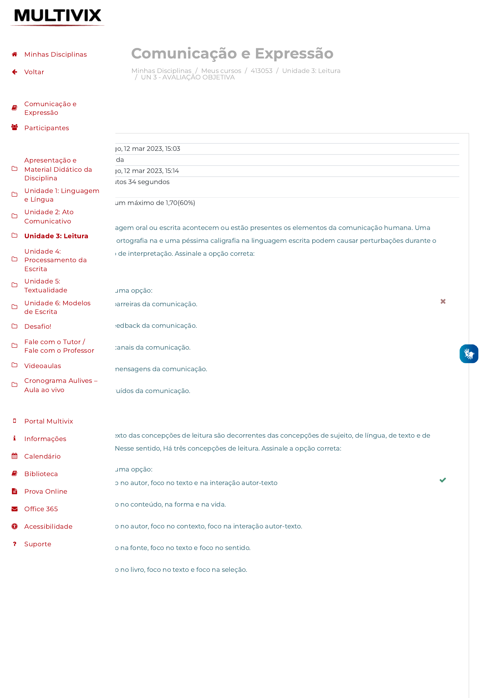 27/05/2023, 09:21 UN 3 - AVALIAÇÃO OBJETIVA: Revisão da tentativa https://avap.multivix.edu.br/mod/quiz/review.php?attempt=2541375&cmid=1311116 1/3 Minhas Disciplinas / Meus cursos / 413053 / Unidade 3: Leitura / UN 3 - AVALIAÇÃO OBJETIVA Comunicação e Expressão Questão 1 Incorreto Atingiu 0,00 de 0,34 Questão 2 Correto Atingiu 0,34 de 0,34 Iniciado em domingo, 12 mar 2023, 15:03 Estado Finalizada Concluída em domingo, 12 mar 2023, 15:14 Tempo empregado 10 minutos 34 segundos Avaliar 1,02 de um máximo de 1,70(60%) Na linguagem oral ou escrita acontecem ou estão presentes os elementos da comunicação humana. Uma péssima ortogra�a na e uma péssima caligra�a na linguagem escrita podem causar perturbações durante o processo de interpretação. Assinale a opção correta: Escolha uma opção: As barreiras da comunicação. O feedback da comunicação. Os canais da comunicação. As mensagens da comunicação. Os ruídos da comunicação. No contexto das concepções de leitura são decorrentes das concepções de sujeito, de língua, de texto e de sentido. Nesse sentido, Há três concepções de leitura. Assinale a opção correta: Escolha uma opção: Foco no autor, foco no texto e na interação autor-texto Foco no conteúdo, na forma e na vida. Foco no autor, foco no contexto, foco na interação autor-texto. Foco na fonte, foco no texto e foco no sentido. Foco no livro, foco no texto e foco na seleção. Minhas Disciplinas Voltar Comunicação e Expressão Participantes Apresentação e Material Didático da Disciplina Unidade 1: Linguagem e Língua Unidade 2: Ato Comunicativo Unidade 3: Leitura Unidade 4: Processamento da Escrita Unidade 5: Textualidade Unidade 6: Modelos de Escrita Desafio! Fale com o Tutor / Fale com o Professor Videoaulas Cronograma Aulives – Aula ao vivo Portal Multivix Informações Calendário Biblioteca Prova Online Office 365 Acessibilidade Suporte https://avap.multivix.edu.br/my/ https://avap.multivix.edu.br/course/view.php?id=20057 https://avap.multivix.edu.br/course/view.php?id=20057§ion=4 https://avap.multivix.edu.br/mod/quiz/view.php?id=1311116 https://avap.multivix.edu.br/my/ https://avap.multivix.edu.br/course/view.php?id=20057 https://avap.multivix.edu.br/user/index.php?id=20057 https://avap.multivix.edu.br/course/view.php?id=20057§ion=1 https://avap.multivix.edu.br/course/view.php?id=20057§ion=2 https://avap.multivix.edu.br/course/view.php?id=20057§ion=3 https://avap.multivix.edu.br/course/view.php?id=20057§ion=4 https://avap.multivix.edu.br/course/view.php?id=20057§ion=5 https://avap.multivix.edu.br/course/view.php?id=20057§ion=6 https://avap.multivix.edu.br/course/view.php?id=20057§ion=7 https://avap.multivix.edu.br/course/view.php?id=20057§ion=8 https://avap.multivix.edu.br/course/view.php?id=20057§ion=9 https://avap.multivix.edu.br/course/view.php?id=20057§ion=10 https://avap.multivix.edu.br/course/view.php?id=20057§ion=11 https://avap.multivix.edu.br/hooks/portal/ https://avap.multivix.edu.br/mod/page/view.php?id=1252%2F%22%20target%3D%22_blank https://avap.multivix.edu.br/calendar/view.php/ https://avap.multivix.edu.br/local/staticpage/view.php?page=biblioteca https://portalweb.multivix.edu.br/gabaritos/login.aspx https://multivix.edu.br/office-365/ https://multivix.edu.br/acessibilidade/ https://avap.multivix.edu.br/mod/page/view.php?id=7%2F%22%20target%3D%22_blank https://avap.multivix.edu.br/ 27/05/2023, 09:21 UN 3 - AVALIAÇÃO OBJETIVA: Revisão da tentativa https://avap.multivix.edu.br/mod/quiz/review.php?attempt=2541375&cmid=1311116 2/3 Questão 3 Correto Atingiu 0,34 de 0,34 Questão 4 Incorreto Atingiu 0,00 de 0,34 Questão 5 Correto Atingiu 0,34 de 0,34 No contexto da leitura. Como a leitura é fundamental, todo leitor competente tem estratégias de leitura. Estratégias de leitura também podem ser consideradas planos �exíveis que apresentam grande adaptação às mais diversas situações comunicativas presentes nos textos, facilitando a compreensão dos leitores. A estratégia de leitura quando o leitor comprova ou refuta todas as suas antecipações e inferências. Assinale a opção correta: Escolha uma opção: Seleção. Coerência. Veri�cação. Inferência. Antecipação. Como a leitura é fundamental, todo leitor competente tem estratégias de leitura. Estratégias de leitura também podem ser consideradas planos �exíveis que apresentam grande adaptação às mais diversas situações comunicativas presentes nos textos, facilitando a compreensão dos leitores. Assinale abaixo a estratégia de leitura em que o leitor cria uma ponte de sentido com o texto lido, gerando uma nova informação anteriormente não existente no texto nem no leitor (MENEGASSI, 2005) Escolha uma opção: Antecipação Indução Veri�cação Inferência Seleção Nesta etapa da análise do texto, o aluno deve __________ uma sequência de ideias ou acontecimentos que estão implícitos no texto. O aluno não encontrará facilmente as respostas no texto se não o compreendeu, pois apenas com uma boa compreensão conseguirá __________ sentidos do texto que não estão escritos literalmente. Assinale a opção cuja palavra preencha corretamente as lacunas na ordem em que estão dispostas no texto. Escolha uma opção: a. Interpretar b. Reter c. Prever d. Decodi�car e. Compreender ◄ Conteúdo Online Seguir para... Conteúdo Online ► Minhas Disciplinas Voltar Comunicação e Expressão Participantes Apresentação e Material Didático da Disciplina Unidade 1: Linguagem e Língua Unidade 2: Ato Comunicativo Unidade 3: Leitura Unidade 4: Processamento da Escrita Unidade 5: Textualidade Unidade 6: Modelos de Escrita Desafio! Fale com o Tutor / Fale com o Professor Videoaulas Cronograma Aulives – Aula ao vivo Portal Multivix Informações Calendário Biblioteca Prova Online Office 365 Acessibilidade Suporte https://avap.multivix.edu.br/mod/scorm/view.php?id=1311115&forceview=1 https://avap.multivix.edu.br/mod/s