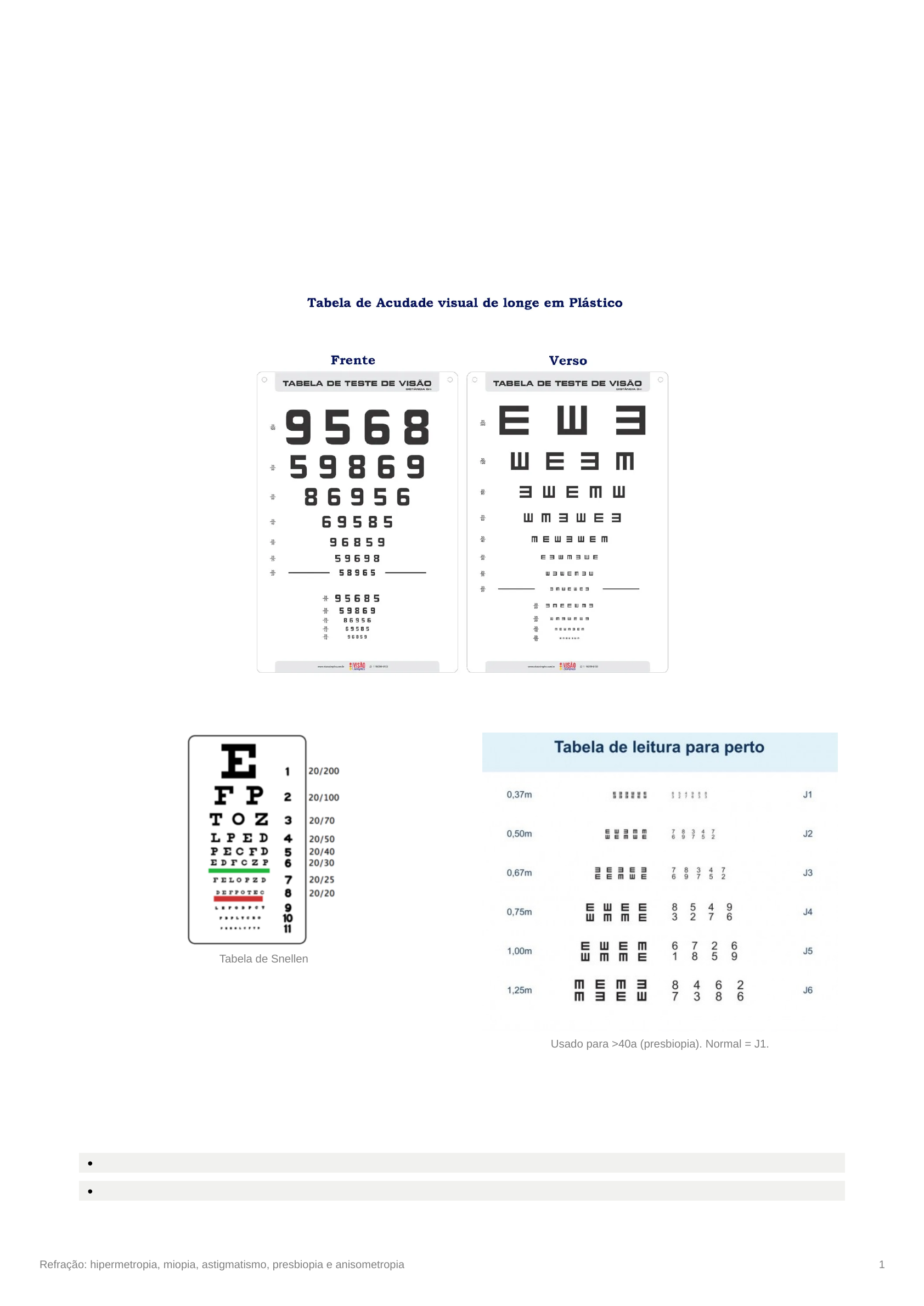 Refração: hipermetropia, miopia, astigmatismo, presbiopia e anisometropia 1 Refração: hipermetropia, miopia, astigmatismo, presbiopia e anisometropia Medida da acuidade visual Sempre testar os 2 olhos, começando com o direito. obs.: se 20/200, indicar a quantos metros consegue 20/200. Se não conseguir, CD → CDFF → MM → PL → SPL (irreversível, sem indicação cirúrgica). Caso o paciente não consiga fazer a leitura das tabelas, avalia-se: CD = conta dedos CDFF = conta dedos frente a face Tabela de Snellen Usado para >40a (presbiopia). Normal = J1. Refração: hipermetropia, miopia, astigmatismo, presbiopia e anisometropia 2 MM = movimento de mãos PL = percepção luminosa SPL = sem percepção luminosa (irreversível) Estima-se que a visão 20/20 seja alcançada com 5 anos. A partir dos 60a, ocorre um declínio da acuidade, mesmo sem comprometimento macular. Teste para crianças: Erros refracionais Impacto das ametropias Os erros refracionais ou ametropias são as causas mais comuns de deficiência visual. Quando não corrigidos, 153mi de deficientes visuais. Principal causa de deficiência visual nas crianças. PODE CAUSAR → estrabismo, ambliopia, repetência escolar, acidentes de trabalho, diminuição de produtividade e perda da qualidade de vida. Sinais e sintomas Em casos acentuados de erros refracionais → baixa visual. Pequenos erros refracionais → sintomas visuais de fadiga e cefaleia (esforço da musculatura ocular para superar a deficiência). obs.: queixa mais comum associada ao esforço visual → cefaleia, na região ocular, frontal e temporal, agravada por fadiga e má iluminação. Surge no decorrer do dia, com pior progressiva. ❗ATENÇÃO → crianças comumente não se queixam; aferir acuidade visual e avaliar distúrbios da musculatura ocular extrínseca. Conjunto de sintomas oculares = astenopia (desconforto, cansaço visual, dor ocular, discreta hiperemia conjuntival). Cartões de Teller - criança olha para as listras, com preferência do olhar para direção com listras. Sem preferência = baixa acuidade. Refração: hipermetropia, miopia, astigmatismo, presbiopia e anisometropia 3 Hipermetropia Foco de luz se posteriormente à retina - “olho curto” (pelo tamanho do olho ou cristalino alterado). Problema com distâncias mais próximas (perto). Se hipermetropia elevada e acomodação insuficiente, pode ter sintoma para perto e longe. Pacientes jovens com boa acomodação e graus moderados podem não perceber alteração, devido à boa acomodação (contração do m. ciliar) - criança consegue acomodar até +4° (>10a = +3°; >15a = +2°; >35a = +1°). Com o avançar da idade e declínio da capacidade acomodativa, fica mais evidente. Debilidades físicas e tensão emocional podem precipitar. Agravamento em atividades prolongadas e contínuas (leitura e costura) → “descanso” para recuperação do m. ciliar. obs.: alta hipermetropia pode levar ao estrabismo e à ambliopia. TTO → lente convergente (esférica) positiva - correção considera a capacidade de acomodação da idade. Miopia Raramente ocorre ao nascimento. Os raios paralelos incidentes chegam a um foco anterior à retina. Aumento do diâmetro anteroposterior (”olho comprido” - tamanho do olho ou grande poder refrativo). Poder de refração excessivo (alterações da curvatura da córnea ou do cristalino). Além de 6-8 dioptrias, pode cursar com lesões retinianas. Paciente pode fechar as pálpebras para reduzir a incidência de luz nas porções mais curvas da córnea = fenda estenopeica. SINAIS E SINTOMAS: Baixa visual para longe. Tentativa de fechar as pálpebras para melhorar visão de longe. Crianças com desinteresse e introspectivas. Cefaleia rara, pois não requer esforço de acomodação. Graus discretos → na meia idade, o míope passa a dispensar o óculos para leitura. Demora mais para presbiopia do que hipermétrope. Miopia patológica (degenerativa) → proptose (exoftalmia), turvações e opacidades vítreas (moscas volantes), catarata, glaucoma, degenerações retinianas e predisposição ao descolamento de retina. obs.: retina + fina = grande chance de lesão (degenerações retinianas) em altos míopes. TTO → lente divergente (esférica) negativa. A. Normal / B. Miopia / C. Hipermetropia / D. Astigmatismo Refração: hipermetropia, miopia, astigmatismo, presbiopia e anisometropia 4 Astigmatismo Diminuição da acuidade visual, pois ponto de luz fica borrado = não forma foco. Dificuldade tanto para longe, quanto para perto → tentativa de apertar os olhos (fenda estenopeica). Queixa de astenopia é a mais comum. Pode ter cefaleias, tonturas, irritabilidade e fadiga. TTO → lente cilíndrica, com valores negativos (-1.00 -0.5 a 90°) - posição importa Presbiopia Perda da capacidade de acomodação por enrijecimento do cristalino. Foco de luz se posteriormente à retina - redução fisiológica, lenta, gradativa da amplitude de acomodação por volta dos 40-45 anos. Insuficiência de acomodação, com afastamento dos braços. Desconforto pelo esforço acomodativo, cefaleia e lacrimejamento. TTO → lente convergente (esférica) positiva. Deve-se avaliar o grau → 40a = 1° / 45a = 1,5° / 50a = 2° / 55a = 2,5° / 60a = 3° (máximo). Óculos deve conter grau para os 2 (lentes bifocais - miopia embaixo na bifocal) - deve-se somar (ex.: miopia 0,5 e 45a = 0,5 + 1,5 = 2°). Em lentes multifocais/progressiva, aumento gradual na lente - ensinar movimentação da cabeça. Anisometropia É a diferença refrativa entre os 2 olhos → imagens muitos diferentes, com dificuldade de fundir imagen. Na prática clínica, interessam as diferenças com valores que podem causar supressão e ambliopia: 0-2 D (baixa) → tolera bem 2,01-6,00 D (alta) → não consegue obter binocularidade = lente de contato ou cirurgia >6,00 D (muito alta) → sem sintomas, devido supressão cortical Materiais ópticos Material Índice de refração (n) Resistência Risco Abbe Vidro