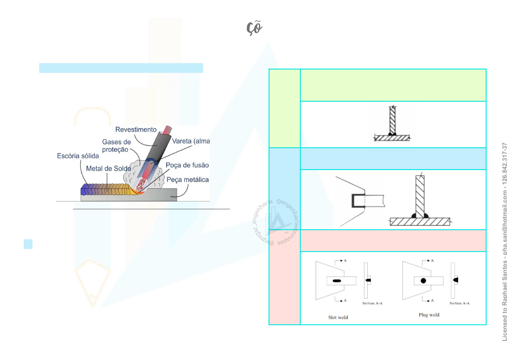 ESTRUTURAS METÁLICAS Estruturas metálicas Liga es soldadas As soldas mais empregadas na indústria de construção são as de energia elétrica – nelas, a fusão do aço é provada pelo calor produzido por arco voltaico. Nos tipos mais usuais, o arco voltaico se dá entre um eletrodo metálico e o aço a soldar, havendo deposição do eletrodo (PFeil & PFeil). Na figura abaixo, um detalhe da solda com eletrodo manual revestido. Fonte da imagem: https://blog.binzel-abicor.com/pt/entenda-a-soldagem-com-eletrodo-revestido OBS: Soldabilidade dos aços estruturais se refere a maior ou menor facilidade de se obter uma solda resistente e sem fraturas. Os principais tipos de solda de eletrodo quanto à posição do material de solo em relação ao material-base são: Soldas de entalhe Metal de solda é colocado diretamente entre as peças metálicas, em geral dentro de chanfros – podendo ser solda de penetração parcial ou total. Soldas de filete O material de solda é depositado nas faces laterais dos elementos ligados Soldas de orifício ou tampão O material é depositado em orifícios circulares ou alongados feitos em uma das chapas do material base. Referências: Estruturas de Aço. PFeil & PFeil. L ic en se d t o R ap h ae l S an to s - p h a. sa n @ h o tm ai l.c o m - 1 26 .8 42 .3 17 -3 7 https://blog.binzel-abicor.com/pt/entenda-a-soldagem-com-eletrodo-revestido ESTRUTURAS METÁLICAS Estruturas metálicas Liga es soldadas Simbologia de solda Contra- solda Filete Tampão Entalhe Sem chanfro V Bisel U J Chapa de espera Solda em toda a volta Solda de campo Acabamento Plano Convexo SÍMBOLO DE SOLDA EM CAMPO SÍMBOLO DE SOLDA EM TODA A VOLTA EXTREMIDADE DA SETA INDICA O LOCAL DA SOLDA LINHA DE REFERÊNCIA ESPECIFICAÇÕES S L - P PASSO (ESPAÇAMENTO CENTRO A CENTRO DAS SOLDAS) COMPRIMENTO DO CORDÃO DIMENSÃO SÍMBOLO BÁSICO DA SOLDA OU REFERÊNCIA DE DETALHES R C A ABERTURA DA RAIZ TIPO DE ACABAMENTO ÂNGULO DE CHANFRO SÍMBOLO DO ACABAMENTO 5 50 E60 1 2 3 4 Solda de filete, de oficina, ao longo das faces 1-3 e 2-4; as soldas têm 50 mm de comprimento e 5 mm de perna; o eletrodo usado é o E60. AM BO S OS L AD OS LA DO DIS TA NT E LA DO PR ÓX IM O Referências: Estruturas de Aço. PFeil & PFeil. M L ic en se d t o R ap h ae l S an to s - p h a. sa n @ h o tm ai l.c o m - 1 26 .8 42 .3 17 -3 7 CEBRASPE, 2010 Julgue o item a seguir, no que concerne à simbologia gráfica adotada para solda. A figura abaixo representa a simbologia adotada para uma solda de filete, intermitente e alternada, com dimensão igual a 5 mm, 40 mm de comprimento, passo igual a 120 mm e eletrodo do tipo E60. ( ) CERTO ( ) ERRADO Gabarito: Certo. FEPESE, 2018 Os elementos estruturais de aço são conectados entre si por ligações realizadas por processos de solda ou por conectores. Neste contexto, as figuras abaixo apresentam duas chapas conectadas por processo de solda: Assinale a alternativa que contém as corretas nomenclaturas para cada uma das situações: a) 1. solda dupla • 2. solda simples • 3. solda múltipla b) 1. solda de filete • 2. solda de entalhe • 3. solda tampão c) 1. solda horizontal plana • 2. solda horizontal com bisel • 3. solda ponteada d) 1. solda de filete reta • 2. solda de filete com bisel • 3. solda tampão e) 1. solda de transpasse • 2. solda de topo • 3. solda ponteada Gabarito: Letra b. ESTRUTURAS METÁLICAS Estruturas metálicas Liga es soldadas FGV, 2019 A figura a seguir ilustra uma ligação soldada de duas barras chatas, a respectiva simbologia e descrições. Essa ligação consiste em solda: a) de entalhe em bisel de um só lado; b) de entalhe de dois lados com chanfro em bisel a 45º; c) de filete de campo com comprimento de 5 dm; d) de filete de oficina com perna de 5 mm; e) com eletrodo tubular sem revestimento. Gabarito: Letra d L ic en se d t o R ap h ae l S an to s - p h a. sa n @ h o tm ai l.c o m - 1 26 .8 42 .3 17 -3 7