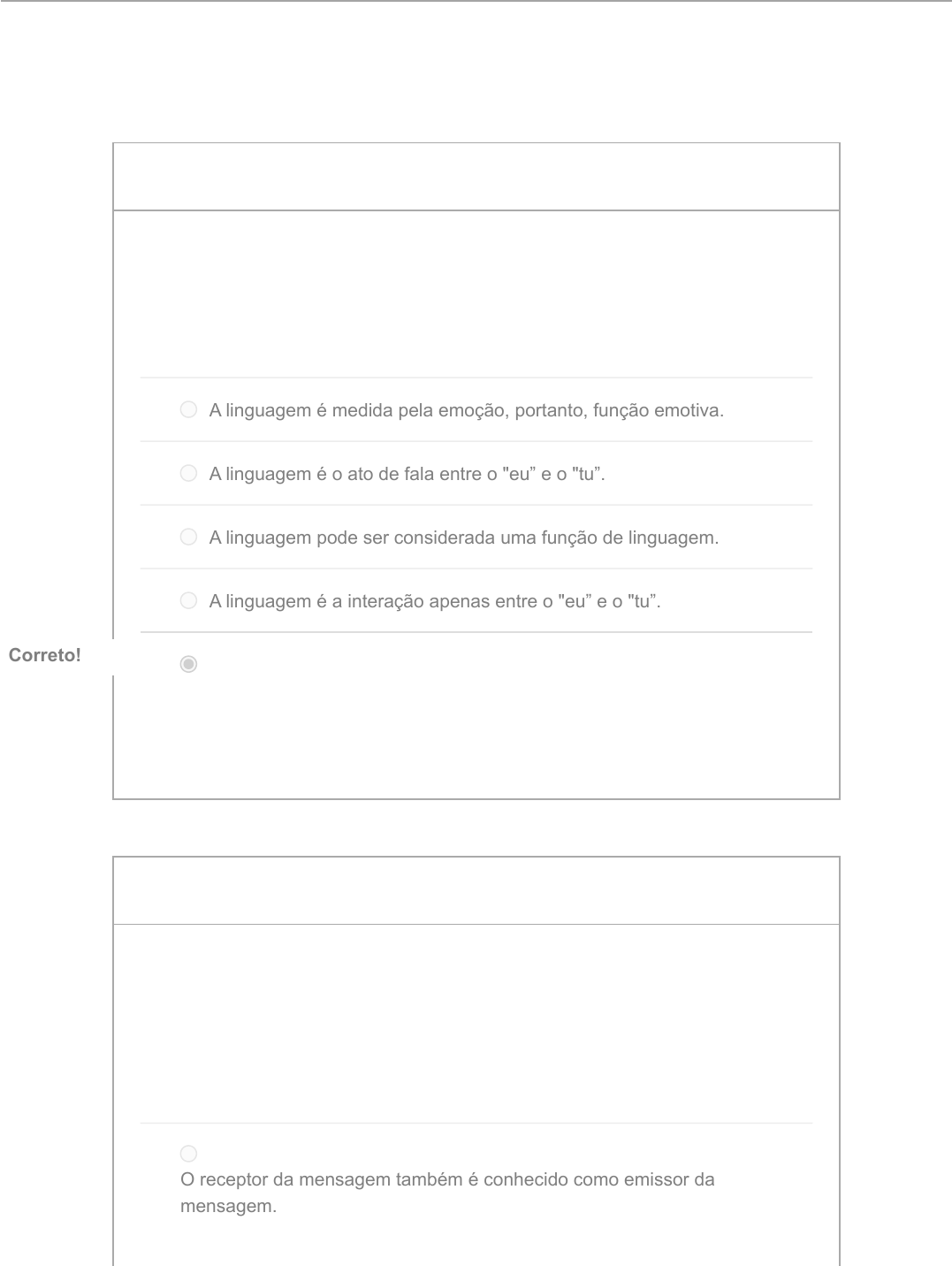 Questões Objetivas Resultados para Layhana Vitoria Gonçalves Dos Santos Pontuação desta tentativa: 10 de 10 Enviado 19 mai em 23:50 Esta tentativa levou 1 minuto. 2 / 2 ptsPergunta 1 Koch (1997) apresenta que é por meio da linguagem que interagimos e que sempre haverá um objetivo a ser atingido por meio dela. A partir das afirmações de Koch (1997), assinale a alternativa CORRETA: A linguagem é medida pela emoção, portanto, função emotiva. A linguagem é o ato de fala entre o "eu” e o "tu”. A linguagem pode ser considerada uma função de linguagem. A linguagem é a interação apenas entre o "eu” e o "tu”. A linguagem é uma relação que se estabelece caracterizada pela ação social. Correto!Correto! 2 / 2 ptsPergunta 2 Sabemos que é por meio da linguagem que nos comunicamos, pois é nosso veículo de comunicação e, portanto, interação. A partir dessa proposição, assinale a alternativa CORRETA sobre os elementos da comunicação, segundo Jakobson (1974): O receptor da mensagem também é conhecido como emissor da mensagem. A mensagem é tudo aquilo que o interlocutor envia para o receptor, podendo ser verbal ou não verbal. O canal da mensagem representa todo o assunto transmitido pela mensagem. O emissor pode tornar-se o interlocutor da mensagem em algum momento da interação. Correto!Correto! O emissor é aquele que recebe a mensagem, podendo ser em primeira pessoa do singular (eu) ou do plural (nós). 2 / 2 ptsPergunta 3 Nas palavras, são expressas as emoções que brotam, muitas vezes, de associações de relações que se fazem e, por isso, não devem ser reduzidas à rigidez da estrutura formal que as normas gramaticais impõem. A partir dessa proposição, assinale a alternativa CORRETA sobre conotação e denotação: A denotação é muito encontrada na literatura, que utiliza diversos recursos expressivos para realçar um elaborado trabalho com a linguagem. A denotação é empregada em uma linguagem específica, objetiva ou literal. Tanto por meio da conotação quanto da denotação, podemos expressar os mais profundos sentimentos, revelações e observação do mundo que nos rodeia. Correto!Correto! A linguagem figurada é considerada denotativa. Nos textos informativos, por exemplo, a denotação dá lugar à conotação. 2 / 2 ptsPergunta 4 As funções da linguagem são determinadas pelos elementos da comunicação e as condições de produção. Estas também influenciam no desenvolvimento dos objetivos comunicacionais. Sobre as funções da linguagem, assinale a alternativa CORRETA: A função emotiva é a linguagem centrada na mensagem. Quando chama a atenção para a seleção e a combinação especial dos signos que a compõem, a linguagem é predominantemente poética. É a mensagem literária, poética, artística. A função conativa tem por finalidade estabelecer, prolongar ou interromper a comunicação. É aplicada em situações em que o mais importante não é o que se fala, nem como se fala, mas sim o contato entre o emissor e o receptor. A função fática é linguagem voltada ao código. Ocorre quando a linguagem é usada para falar dela mesma. A função emotiva trata-se de mensagens em que um "eu” expressa seus desejos, suas emoções, seus conhecimentos, suas experiências. Correto!Correto! A função metalinguística é a mensagem objetiva, muito comum nos textos científicos, por exemplo. O que indica que a linguagem de uma mensagem é predominantemente referencial são os verbos marcados pela terceira pessoa. 2 / 2 ptsPergunta 5 Jakobson (1974) apresenta os elementos da comunicação e as funções da linguagem que envolvem o processo de interação entre os falantes, no qual, dependendo da finalidade, destacam-se tais elementos e funções. A partir dessa afirmação, assinale a alternativa CORRETA sobre o código da mensagem: O código pode ser considerado um signo linguístico. Correto!Correto! A oralidade deixa de ser considerada um código. O código representa a situação e realidade da comunicação. O rádio, a televisão e os livros são bons exemplos de código da mensagem. Os gestos podem ser considerados por meio do contexto e não código. Pontuação do teste: 10 de 10