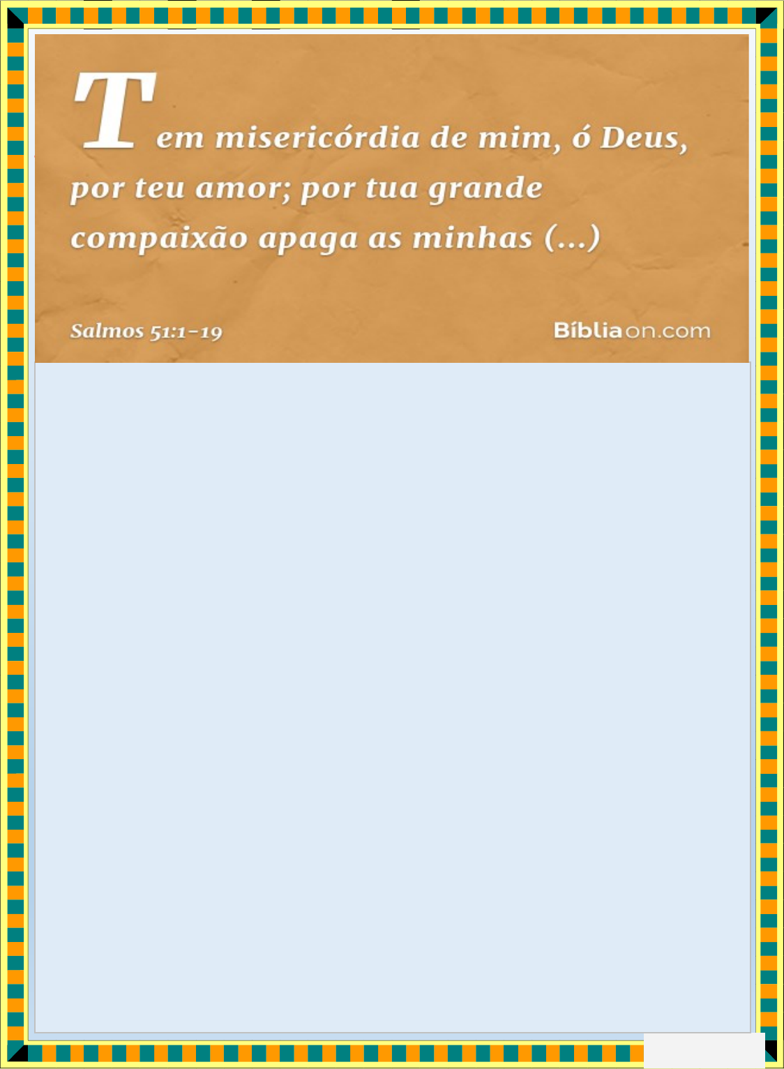 21Jan2023 MaurícioSaramago Versículos: 1-6-O salmista pede misericórdia, confessa e humilde- mente lamenta-se por causa do seu pecado; 7-15-Pede perdão pa- ra que a gloria de Deus seja promovida, e os pecadores se con- vertam; 16-19-O agrado de Deus por um coração contrito; uma oração a favor da prosperidade de Sião. O salmo ilustra o verdadeiro arrependimento, em que se compre- endem a compunção, confissão, tristeza, súplica de misericórdia, e a resolução de emendar-se, acompanhado de fé viva. Um Grito de Perdão-Oração por perdão e purificação. Este salmo está associado a uma das experiências mais difíceis da vida de Davi, o seu caso com Bate-Seba. O relato do pecado de Davi e a censura de Natã estão em 2Sm11 e 12. A estrutura do poema e a seguinte: 1) apelo à misericórdia de Deus, no contexto da confissão de Davi; 2) reconhecimento de que o pecado de Davi fora contra o Senhor; 3) confissão de Davi de que o pecado permeava o seu ser; 4) uma série de pedidos de perdão; 5) voto de louvor pelo pecador perdoado; 6) declaração sobre o sentido da adoração verdadeira; 7) pedido a Deus para que restaure a sorte de Seu povo. Em tudo daremos graças.