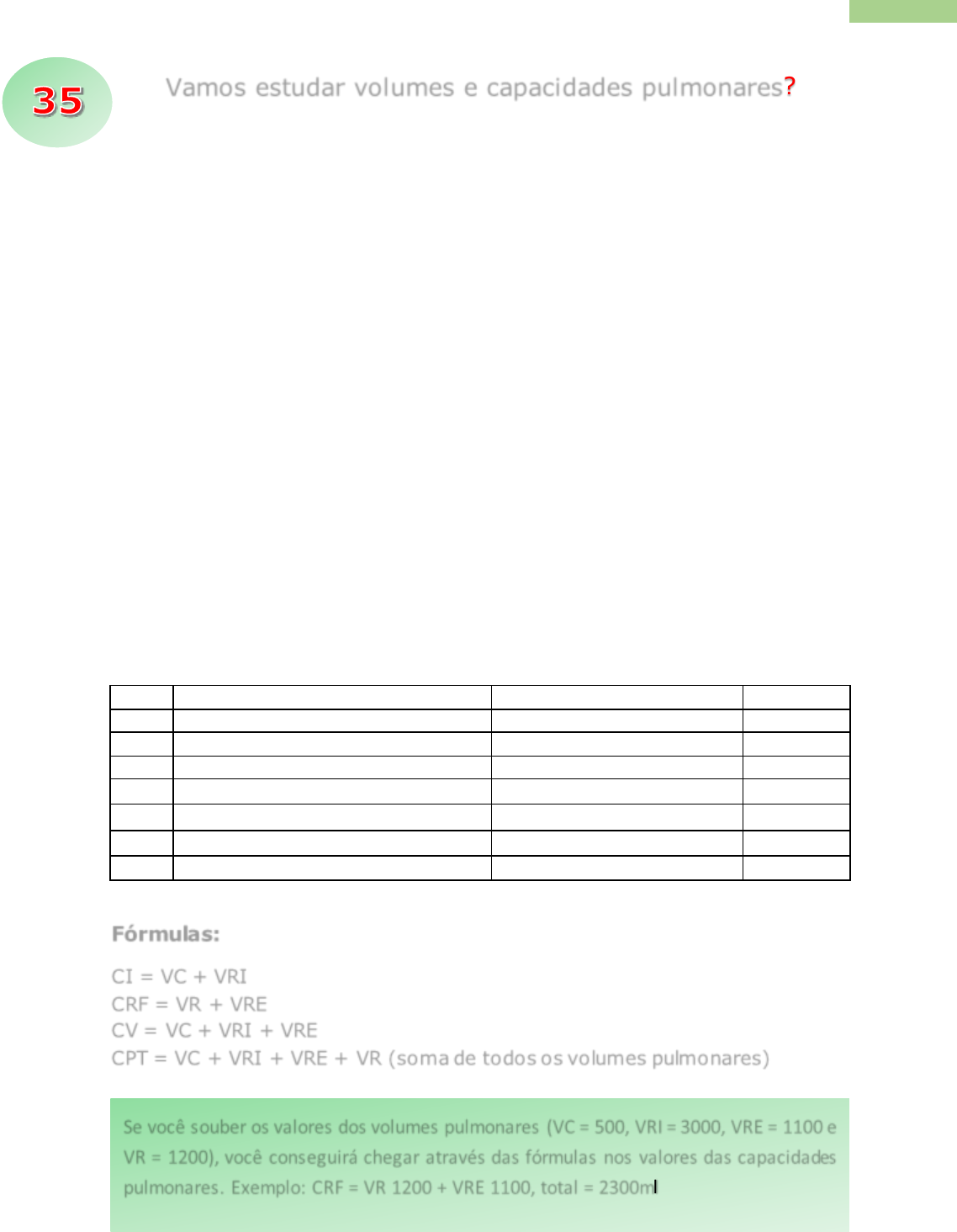 38 REIS DOS CONCURSOS Liana Antonucci Reis Vamos estudar volumes e capacidades pulmonares? DICA: Guarde as palavras em vermelho. Volume corrente (VC): é o volume de ar inspirado e expirado em cada respiração normal. Já a Capacidade vital (VC): é o volume de ar mobilizado entre uma inspiração e expiração máxima. Volume de reserva inspiratório (VRI): é o volume máximo de ar que pode ser inspirado após uma inspiração basal, espontânea. Já a Capacidade inspiratória (CI): é o volume máximo de ar que pode ser inspirado após uma expiração espontânea. Volume de reserva expiratório (VRE): é o volume máximo de ar que pode ser expirado após uma expiração basal, espontânea. Volume residual (VR): é o volume de ar que ainda permanece no pulmão após um expiração forçada. (Residual é aquilo que sempre permanece nos pulmões). Na Capacidade residual funcional (CRF), o volume de ar permanece nos pulmões após uma expiração basal. Capacidade pulmonar total (CPT): é o volume de ar contido nos pulmões após uma inspiração máxima, profunda. VC Inspiração e expiração Normal 500 ml CV Inspiração e expiração Máxima 4600ml VRI Inspiração Inspiração espontânea 3000ml CI Inspiração Expiração espontânea 3500ml VRE Expiração Expiração espontânea 1100ml VR Permanece no pulmão Expiração máxima 1200ml CRF Permanece no pulmão Expiração basal 2300ml CPT Contido no pulmão Inspiração máxima 5800ml Fórmulas: CI = VC + VRI CRF = VR + VRE CV = VC + VRI + VRE CPT = VC + VRI + VRE + VR (soma de todos os volumes pulmonares) Se você souber os valores dos volumes pulmonares (VC = 500, VRI = 3000, VRE = 1100 e VR = 1200), você conseguirá chegar através das fórmulas nos valores das capacidades pulmonares. Exemplo: CRF = VR 1200 + VRE 1100, total = 2300ml