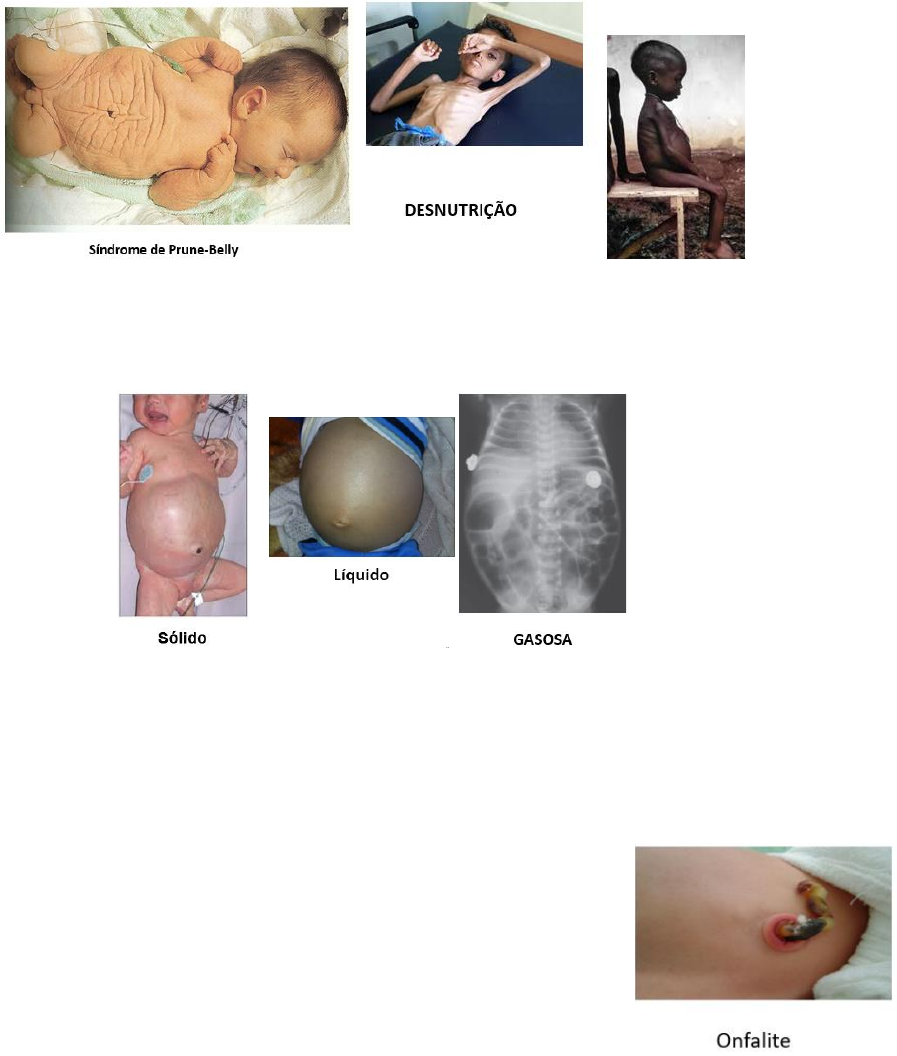 PAPM V João Vitor P. Gama – MED 103 UV _______________________________________________________________________________________ SEMIOLOGIA DO ABDOME Inspeção • Alterações de forma e volume: na criança pequena, o abdome é maior que o tórax o Síndrome de Prune-Belly: ausência do músculo reto do abdome o Desnutrição: abdome escavado (marasmo, paciente consome muita gordura), globoso com membros magros (Kwashiorkor, paciente tem deficiência de proteínas) • Abaulamentos e depressões o Distensões/abaulamentos: diástase do reto abdominal, distensão por sólido (obstrução intestinal, tumor), líquido, gás • Aspectos da pele e alterações cutâneas • Circulação colateral o Veia cava inferior: parte inferolateral do abdome o Veia cava superior: parte superior do tórax o Veia porta: parte superior do abdome, geralmente por atresia de vias biliares extra-hepáticas • Movimentos respiratórios • Ondas peristálticas • Umbigo o Hérnia umbilical o Onfalocele o Gastrosquise o Onfalite Palpação: faz-se antes da ausculta e da percussão, pois é a parte do exame que dá mais detalhes. Se fizer ausculta e percussão antes, a criança pode ficar irritada. • Mãos espalmadas, posicionadas horizontalmente. PAPM V João Vitor P. Gama – MED 103 UV _______________________________________________________________________________________ • Exploração com as polpas digitais • A criança deve estar confortável e, preferencialmente, sem travesseiros • Desviar a atenção da criança e observar a fisionomia durante o exame • Não utilizar perguntas como “dói aqui?” • Palpação superficial o Sensibilidade: hiperestesias (irritação peritoneal) o Espessura da parede o Tumefações anormais o Continuidade: ausência de continuidade (hérnia, diástase) o Tensão: resistência à mão apoiada sobre o abdome. Aumento de tensão (ascite, pneumoperitônio, meteorismo, massas inflamatórias, apendicite) o Piparote: presente em coleções líquidas, grandes volumes • Palpação profunda o Vísceras o Consistência o Massas o Tumores o Parede abdominal: deve estar elástica, depressível e indolor o Espessura e turgor (pinçamento dos dedos polegar e indicador) o Contratura ou espasmo permanente (apendicite ou peritonite) o Dor à descompressão brusca (processo inflamatório subjacente) o Defesa muscular (músculo correspondente a área inflamada) • Palpação do fígado o Bordo superior na 5ª ou 6ª costela, bordo inferior a 2-3cm da margem costal (lactente) ou a 1-2 cm (pré-escolares). Espera-se que seja palpável até os 2-3 anos o Palpação bimanual o Avaliar superfície, consistência, borda inferior e sensibilidade • Palpação do baço o Espera-se que não seja palpável, exceto em crianças pequenas (é possível sentir a ponta) o Palpação bimanual o O paciente precisa estar relaxado. Entre um choro e outro faz-se a palpação PAPM V João Vitor P. Gama – MED 103 UV _______________________________________________________________________________________ Percussão • Espera-se um som timpânico • Aumento do timpanismo: obstrução intestinal, aerofagia com meteorismo, pneumoperitônio • Espaço de Traube: entre 6ª e 10ª costelas. o Deve ser timpânico. o Macicez: ↑baço, massas • Macicez: vísceras sólidas, vísceras ocas repletas de líquidos nas fezes, contratura da musculatura Ausculta • Espera-se encontrar leves ruídos pela passagem de gases e líquidos pelas dobras intestinais (borborigmos intestinais) • Peristaltismo de luta: obstrução intestinal • ↑peristaltismo: diarreia, início de peritonite • ↓peristaltismo: fase posterior de peritonite, íleo paralítico, fase final de obstrução intestinal