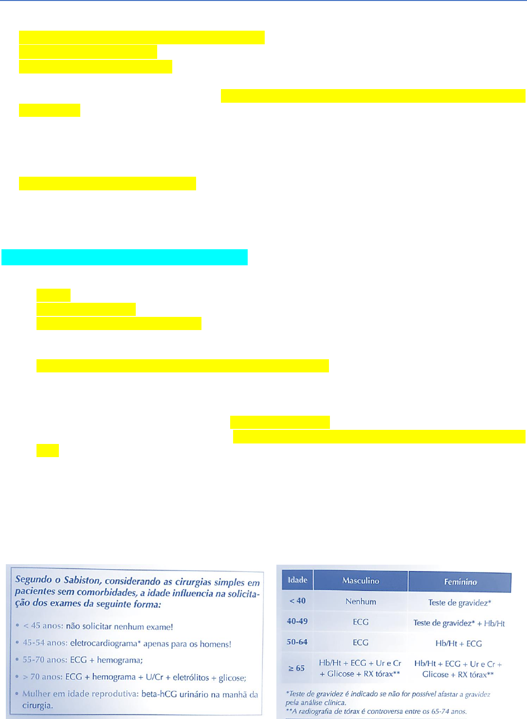 VITÓRIA CORREIA MOURA – T4C Cuidados Perioperatórios Tentativa de diminuir morbidade e mortalidade. Depende de diagnósticos estabelecidos antes da cirurgia. Determinação do risco cirúrgico Avaliar o risco do procedimento: baixo, médio ou alto Redução de possíveis complicações. Diminuição de mortalidade, sequelas, tempo de internação e período de afastamento. Objetivo não é diagnóstico de doenças, é identificar e quantificar comorbidades que possam influenciar no procedimento. Técnica anestésica planejada. Localização pós-operatória do paciente: Ambulatorial, Enfermaria ou UTI. Em resumo: a avaliação pré-operatória tem como objetivo principal identificar e quantificar qualquer comorbidade que tenha impacto na evolução cirúrgica do paciente. Calculadora do risco cirúrgico ACS NSQIP: Usa 21 preditores do paciente (variáveis clínicas e exames subsidiários, quando indicados); Risco de complicação nos primeiros 30 dias pós-operatório. 1) Passos da avaliação perioperatória Anamnese cuidadosa e Exame físico História: dor precordial, dispneia, tosse. Antecedentes pessoais: comorbidades, uso de medicações e de substâncias ilícitas, alergia a fármacos. Antecedentes cirúrgicos e anestésicos. Solicitação adequada de exames complementares Exames solicitados sem indicação clínica não beneficiam o paciente. Sugestões de exame pré operatório adulto: ECG, Hemograma completo + plaquetas, Eletrólitos, Glicose, Parasitológico, Cálcio, TTPA / TPA, Urina 1, Rx de tórax. Paciente SEM comorbidades com < 40 anos: Hb, Ht e coagulograma. Pacientes SEM comorbidades com > 40 anos: ECG, creatinina, glicemia, Na, K, hemograma, coagulograma e RX de tórax. Paciente diabético: ECG, creatinina e glicemia. Paciente obeso: ECG e glicemia. Paciente hipertenso, nefropata ou com IC: ECG, creatinina, Na e K. Paciente hepatopata: creatinina, coagulograma, hemograma, bilirrubinas e albumina. Paciente em uso de anticoagulante: coagulograma, hemograma e creatinina. Paciente com história de sangramento: coagulograma e hemograma. Paciente tabagista ou com DPOC: RX de tórax. VITÓRIA CORREIA MOURA – T4C Avaliação de risco geral Avaliação de risco cardíaco Complicações de origem cardiovascular: responsáveis por grande parte da morbi mortalidade perioperatória. Maioria dos eventos ocorre até o 2º dia pós-operatório. 6,6% dos pacientes apresenta uma complicação cardíaca, podendo ser: Crise hipertensiva, IAM, Angina instável, Edema agudo de pulmão, Arritmias graves com instabilidade hemodinâmica (fibrilação ventricular). IM pós-operatório: Mortalidade 15 a 25%; risco aumentado de morte e evento cardiovascular nos primeiros 6 meses após a cirurgia. Angina estável = ASA III Angina instável = ASA IV VITÓRIA CORREIA MOURA – T4C Avaliação de risco pulmonar Complicações mais comuns: pneumonia e insuficiência respiratória. Avaliação de função pulmonar apenas em cirurgias de tórax e abdome superior. Avaliação de risco de TEV, TVP e TEP Os fatores de risco para eventos tromboembólicos em pacientes cirúrgicos são: idade > 40 anos, obesidade, tabagismo, cateterização venosa central, tromboembolismo prévio, imobilização (restrição ao leito), neoplasias, quimioterapia, IC, traumas, fraturas, varizes de membro inferior, gestação, uso de ACO, AVE. Avaliação de risco renal, hepatobiliar, endócrino, hematológico e de delirium. Cirurgias ortopédicas são grande risco de TEV, principalmente artroplastia de quadril ou joelho! VITÓRIA CORREIA MOURA – T4C Manejo de doenças crônicas e medicações no perioperatório Compensar comorbidades. Orientar uso de medicações no perioperatório: HAS e DM. MANTER O USO, INCLUSIVE NO DIA DA CIRURGIA Drogas cardiovasculares (betabloqueadores, IECA, bloqueadores do receptor de angiotensina II, bloqueadores de canais de cálcio), Broncodilatadores, Anticonvulsivantes, Drogas psiquiátricas, Levotiroxina. AINH: suspender o uso 1 a 3 dias antes da cirurgia. Antiagregantes plaquetários (AAS e Clopidogrel): quando possível, suspender 7-10 dias antes da cirurgia. O uso de estrogênio e tamoxifeno tem sido associado a um aumento do risco de tromboembolismo, e provavelmente devem ser interrompidos por um período de quatro semanas anteriormente à operação. Anticoagulantes VO: - Varfarina: suspender 5 dias antes, iniciando HBPM em dose terapêutica. - Dabigatrana, rivaroxabana e apixabana: suspender 1-2 dias antes. Controle glicêmico: - Monitorar glicemia a cada 6 horas (hipoglicemiantes orais) ou a cada 4 horas (insulina). - O objetivo é manter glicemia entre 100 e 180mg/dL. - Se Hb glicada > 9% = considerar adiar a cirurgia. - Antidiabéticos VO e injetáveis que não a insulina: mantidos até a véspera e suspensos na manhã da cirurgia . - Insulina NPH, Detemir e Glargina: manter a dose noturna (2/3 da dose); na manhã da cirurgia administrar 1/2 da dose. VITÓRIA CORREIA MOURA – T4C Estratégias protetoras Para cada risco identificado existe uma estratégia protetora. VITÓRIA CORREIA MOURA – T4C Avaliação do risco/benefício da cirurgia PROFILAXIA DE TEP VITÓRIA CORREIA MOURA – T4C Lista de verificação pré-operatória Documentar em prontuário. Indicação. Termo de consentimento. Necessidade de betabloqueador, profilaxia de TVP, antibiótico profilático. Entregar ao paciente orientações sobre - Jejum (pelo risco de broncoaspiração): sólidos 8 a 6h e líquidos sem resíduos 2h. - Preparo intestinal. - Uso de medicamentos. 2) Intra-operatório Respostas orgânicas ao trauma: Ativação dos mecanismo de coagulação. Desvio de líquido do intravascular para o extravascular. Redistribuição do fluxo sanguíneo. Manutenção do equilíbrio ácido-básico e eletrolítico. Mobilização de leucócitos, produção de macrófagos e linfócitos T. Aumento do débito cardíaco. Lipólise e proteólise. Aumento da glicogenólise e da gliconeogênese. Resposta neuroendócrina