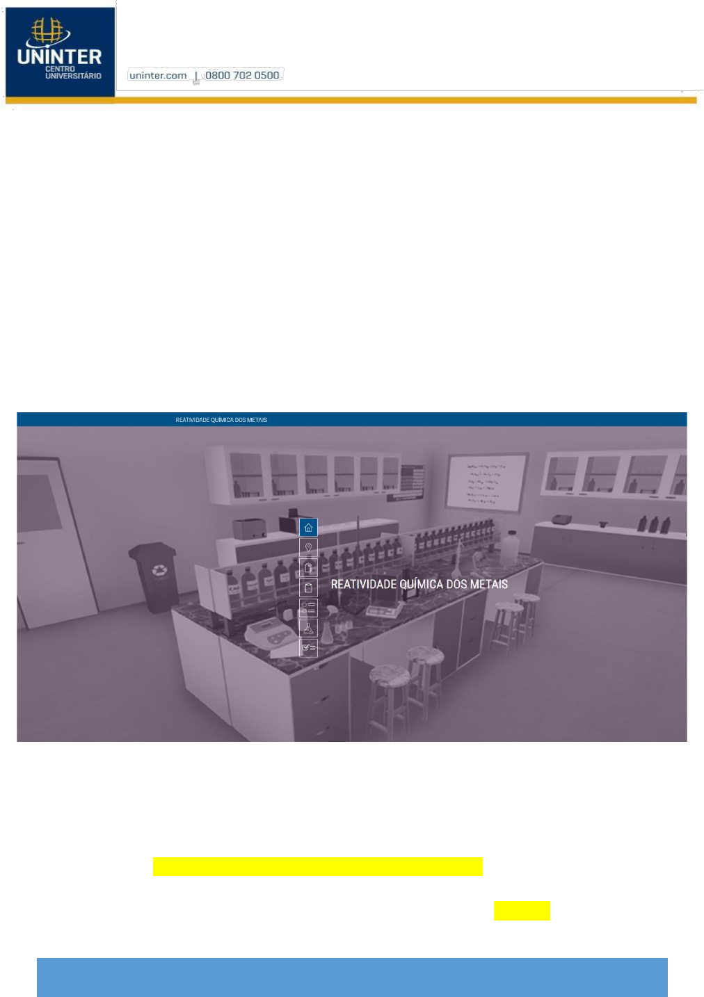 27/10/2021 1 Disciplina: Química Geral Orientações para prática com Laboratório Virtual de Química Prof. Guilherme Barrachina Stocco ATIVIDADE PRÁTICA (Simulador) – Química Geral OBJETIVO Nesta atividade iremos realizar duas atividades, utilizando alguns conceitos da disciplina. Iremos realizar um experimento onde iremos verificar as reações formadas entre metais e dois tipos de ácidos. MATERIAL UTILIZADO Para realizar a primeira atividade, você irá utilizar um Laboratório Virtual de Química, o qual você irá acessar a partir do link disponibilizado na Aula 10. A tela inicial do laboratório virtual encontra-se abaixo. INSTRUÇÕES O experimento a ser realizado chama-se: Reatividade Química dos Metais. Ele estará disponível durante as 6 semanas de duração da fase. A tela deste experimento encontra-se a seguir. Você pode encontrar a explicação do acesso aos ícones, assim como do início do experimento, em um vídeo explicativo localizado na Aula 10. 27/10/2021 2 Disciplina: Química Geral Orientações para prática com Laboratório Virtual de Química Prof. Guilherme Barrachina Stocco A partir desta tela, inicie sua atividade lendo o material contido na Apresentação e no Sumário Teórico, o qual contêm a teoria envolvida neste experimento. Em seguida, realize o Pré-teste, com o objetivo de verificar seu conhecimento antes da realização do experimento. Acesse, então, o Roteiro do experimento. É interessante que você imprima este roteiro ou o mantenha aberto em uma nova guia do seu navegador para consulta durante a realização do experimento. Com o roteiro “em mãos”, acesse o experimento no Modo Experimento e realize todos os passos conforme o roteiro. Não deixe de anotar todas as suas observações. Registre a execução do experimento com fotos ou “prints” da tela. Finalize esta etapa do seu estudo realizando o Pós-teste. Utilize o arquivo com o modelo de relatório, anexado em Trabalhos e na Aula 10, para responder as questões propostas. Posteriormente, você deve utilizar o documento em WORD, chamado modelo de relatório e incluir seu nome, RU, responder as perguntas dos experimentos, e incluir as fotos de evidências de todas as realizações, postando esse documento no AVA no link TRABALHOS, até a data limite, informada na agenda semanal da fase.