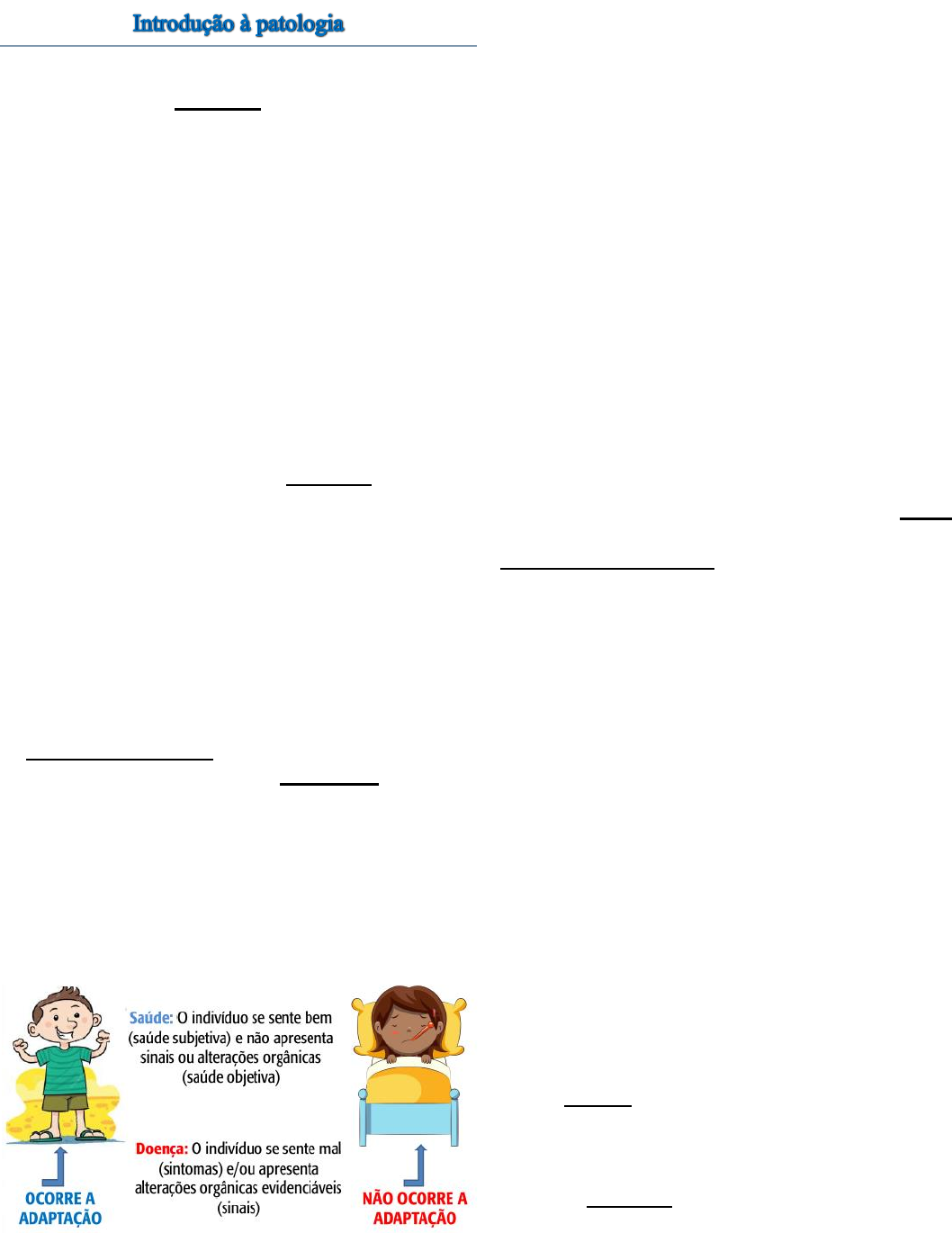 Unidade I - Patologia 3º período - Farmácia 1 Conceitos e definições A palavra Patologia, se origina do grego “pathos”, que significa doença, e “logos”, que significa estudo, ou seja, o estudo da doença. Porém, esta ciência abrange também tudo o que está ligado às doenças, como por exemplo, a avaliação das modificações que elas interferem nas células, tecidos, órgãos e sistemas corporal humano. O conceito de patologia não compreende todos os aspectos das doenças, que são muito numerosos e poderiam confundir a patologia humana com a medicina. Esta, sim, aborda todos elementos ou componentes das doenças e sua relação com os doentes. Na verdade, a medicina é a arte e a ciência de promover a saúde e de prevenir, minorar ou curar os sofrimentos produzidos pelas doenças. De modo prático, a patologia pode ser conceituada como ciência que estuda as causas das doenças, os mecanismos que as produzem, as sedes e as alterações morfológicas e funcionais que apresentam. A patologia estuda alterações estruturais, bioquímicas e funcionais de células, tecidos, órgãos e sistemas, com o objetivo de explicar os mecanismos por meio dos quais surgem os sintomas e sinais das doenças. Os conceitos de patologia e de medicina convergem para um elemento comum, que é a doença. A definição de doença relaciona-se com o conceito biológico de adaptação. Adaptação é uma propriedade geral dos seres vivos que se traduz pela capacidade de ser sensível às variações do meio ambiente (irritabilidade) capazes de adaptá-los. Essa capacidade é variável em diferentes espécies animais e em diferentes indivíduos de uma mesma espécie, pois depende de mecanismos moleculares vinculados, direta ou indiretamente, ao patrimônio genético. Como acontece o processo de adaptação? A patologia é vista como a base científica da medicina com o objetivo de explicar os fatores que levam ao progresso de sintomas e sinais de uma doença. Saúde O termo “saúde” pode ser definido quando o organismo está adaptado ao ambiente físico, psíquico ou social no meio que se vive, sem alterações orgânicas evidentes. Portanto, saúde não significa apenas ausência de doenças. Pode-se considerar saúde também como um perfeito estado de equilíbrio dinâmico entre o organismo humano e o ambiente em que se vive. Pode se entender saúde também, como um estado de adaptação do organismo ao ambiente físico, psíquico ou social em que vive, de modo que o indivíduo se sinta bem (saúde subjetiva) e não apresenta sinais ou alterações orgânicas evidentes (saúde objetiva). Entenda que “saúde” e “normalidade” não possuem o mesmo significado. A palavra saúde é utilizada em relação ao indivíduo, enquanto o termo normalidade (normal) é utilizado em relação a parâmetros de parte estrutural ou funcional do organismo. O normal (ou a normalidade) é estabelecido a partir da média de várias observações de determinado parâmetro, utilizando-se para seu cálculo, métodos estatísticos. Os valores normais para descrever parâmetros do organismo (peso dos órgãos, número de batimentos cardíacos, pressão arterial sistólica e diastólica, etc.), são estabelecidos a partir de observações de populações homogêneas, de mesma raça, vivendo em ambientes. Doença Já o termo “doença”, pode ser definido quando ocorre a falta de adaptação ao ambiente físico, psíquico ou social, onde o individuo se sinta mal e mostre alterações orgânicas evidenciáveis. Diversos são os agentes que causam as doenças, como os microrganismos patogênicos, genética, hereditariedade, acidentes, o ambiente externo, dentre vários outros. Doença é um estado de falta de adaptação ao ambiente físico, psíquico ou social, no qual o individuo sente-se mal (sintomas) e/ou apresenta alterações orgânicas evidenciáveis (sinais). A patologia é dividida em Patologia Geral e Patologia Especial ou Sistêmica, abaixo, explico para você uma breve descrição de cada um dos ramos desta ciência: Unidade I - Patologia 3º período - Farmácia 2 Patologia Geral A patologia geral estuda aspectos comuns a todas as doenças, como as causas das doenças, assim como mecanismos que as produzem, suas características, lesões estruturais, e alterações nas funções, etc. A patologia geral está envolvida com as reações básicas das células e tecidos (como o epitelial) a estímulos provocados por doenças. Resumindo para você, é o estudo das reações aos estímulos anormais que ocorrem em todas as células e tecidos do seu corpo. Patologia Sistêmica Em contrapartida, a patologia especial, também chamada de sistêmica, tem como foco examinar respostas mais específicas de tecidos e órgãos (coração, por exemplo), especializados a uma agressão ou estímulos definidos. Ela estuda doenças específicas de cada órgão. A patologia é dividida em dois grandes grupos: a geral, que estuda os comuns aspectos às diferentes doenças (causas, mecanismos patogênicos, lesões estruturais e alterações da função), e a especial ou sistêmica se ocupa das doenças de um determinado órgão ou sistema ou doenças agrupadas por causas. Patologia anatômica Também chamada de anatomia patológica, realiza diagnósticos de diversas doenças, geralmente por meio do microscópio utilizando amostras de células ou tecido material obtido por aspirações, esfregaços, biopsias e cirurgias. Patologia clínica e molecular A patologia clínica se relaciona com a execução e interpretação de alguns exames que envolvem a análise laboratorial de líquidos do corpo (sangue, e urina, por exemplo). A patologia molecular estuda o diagnóstico de doenças, examinando moléculas de órgãos, tecidos e fluidos corporais. É uma área bem mais específica e nova, da patologia. Os elementos de uma doença proporcionam as divisões da Patologia Etiologia A etiologia estuda as causas das doenças, ou se