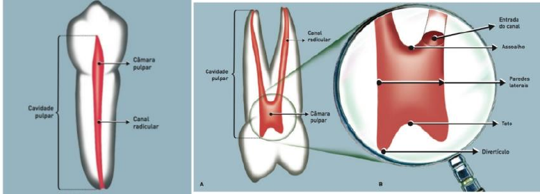 Aula 1- Endodontia Anatomia dental interna Tratamento endodôntico – controle radiográfico. Radiografia – visão bidimensional. Adequada interversão endodôntica – conhecimento detalhado de configuração dental interna. Livro – Soares e Goldberg – Capitulo de morfologia interna e externa e cirurgia interna. O que é a cavidade pulpar? A cavidade pulpar é o espaço existente no interior do dente composto por dentina exato junto ao forame. Está dividida em duas partes: câmara pulpar e canal radicular. A câmara pulpar é a porção coronária da cavidade pulpar, posicionada no centro da coroa. Sempre única acompanhando a forma externa da coroa, é volumosa e aloja a polpa coronária. • Teto: parede oclusal ou incisal. Forma côncava voltada para a oclusal ou para a borda incisal e proeminências dirigidas para as pontas dos divertículos (onde esta os cornos pulpares) • Assoalho ou parede cervical – é a face oposta ao teto. Forma convexa; é onde se localiza as entradas dos canais, mas não está presente nos unirradiculares pois há uma continuidade natural entre câmara e canal radicular. • Paredes laterais circundantes – faces voltadas para vestibular, lingual ou palatal, mesial ou distal) • Canal radicular ou conduto radicular – corresponde a porção radicular dos dentes. Tem forma cônica, base maior voltada para o assoalho e a menor para apical. Divididos em: cervical, médio e apical. O assoalho e convexo. O teto é CONCAVO. Limite CDC- cemento-dentina-canal. Com o passar dos anos, ou das agressões, a cavidade pulpar vai reduzindo seu tamanho por causa da deposição de dentina ou por formação de nódulos e agulhas cálcicas. Canais radiculares – características: • Colateral – paralelo ao canal principal e com menor diâmetro, pode terminar em forame único ou separadamente. • Lateral ou adventício – terço médio ou cervical da raiz. Sai do periodonto principal e alcança o periodonto lateral. • Segundário – Terço apical, saí da raiz do canal principal e alcança o periodonto lateral. • Acessório – ramificação do acessório, alcança a superfície externa do cemento apical. • Interconduto – união de dois canais entre si • Recorrente – Sai do canal principal, percorre parte da dentina e volta ao principal sem se exteriorizar • Delta apical – múltiplas terminações do canal principal que originam o aparecimento de vários forames. • Canal dentinário – cônico e menor diâmetro voltado para o ápice, e maior voltado para a coroa • Canal cementário – maior voltado para o ápice e menor voltado para a coroa. – MUITO CURTO (1mm- 1,5mm) o comprimento aumenta com a idade. Por conta da deposição de dentina apical. (0,5mm em jovens) O forame apical fica após o canal cementário. Ele é PARA-apical (não para no ápice apical do dente radiográfico, fica ‘’levemente’’ tortinho) Incisivo Central Superior – Dente de fácil acesso, fácil tratamento endodôntico. • Tamanho médio: 22,6 cm • Inclinação na arcada – 3º M-D e 15º V-P • Câmara pulpar alargada no sentido M-D bastante estreito no sentido V-P • Divertículos (ou cornos pulpares) – apresentam-se bem pronunciados. É preciso remover bem para não deixar sangue ou restos necróticos. Causa escurecimento do elemento. Pode apresentar canais laterais secundários. • Canal radicular único, amplo e reto. Triangular(cervical), ovoide(médio), circular (ápice). Incisivo Lateral superior - Igual ao Central, mas com uma leve dilaceração no terço apical no sentido Disto-palatal, e aumenta a sua inclinação para 22º • 22,1 cm em média • 2 divertículos bem pronunciados • Raramente 2 canais (V e P) que se unem no terço apical para terminarem em um único forame. • Canal radicular único. Triangular(cervical), ovoide(médio), circular (ápice). Incisivo Central Inferior – menor dente da arcada • Tamanho: 21,0 mm • Inclinação da arcada - 0º M-D e 15º V-P • Canal radicular bastante achatado no sentido M-D e acentuado no V-L. Forma 2 canais, formando um Vestibular e um lingual, separados por um istmo de dentina. • Como saber que tem 2 canais: quando é apenas 1 canal, o cabo fica reto no longo eixo do dente. Quando tem 2 canais, o cabo fica inclinado. • Formato do Canal radicular: Elipsoide em todos os seus terços. • Quase 26,6% dos dentes apresentam 2 canais. Incisivo Lateral Inferior – Comprimento um pouco maior que o ICI • Tamanho médio – 22 mm • Inclinação: 0º MD 10º VP • Raízes achatadas. • Divertículos pouco nítidos quase aparentes. • Canal de pequenas dimensões quase sempre único, achatado no sentido MD • Pode apresentar 2 canais • Formato do Canal radicular: Elipsoide em todos os seus terços. Canino Superior – Coroa pentagonal, fácil tratamento endodôntico. • Tamanho: 27,2 mm • Câmara que reproduz a sua forma externa. • Divertículo Único. • Formato do Canal radicular: Triangular(cervical), ovoide(médio), circular (ápice) Canino inferior – Menor que o superior • Tamanho: 25mm • Pode ter 2 raizes, (V e L) 6%. • Possui divertículo • Pode ter 12% de canal radicular duplo. • Formato do Canal radicular: Ovoide(cervical), ovoide(médio), circular (ápice – forte achatamento). Cirurgia de Acesso - Abertura coronária - Esvaziamento da câmara pulpar - Localização e preparo da entrada do canal - Preparo do terço cervical. Objetivo: Acesso a câmara pulpar, acesso ao canal radicular, Acesso ao terço apical. Ponto de eleição: Local onde a abertura deve ser iniciada. da broca para abertura. Aproximadamente 2mm do cíngulo em direção ao bordo incisal. Forma de conveniência ou forma de contorno: Movimento de tração de dentro para fora para dar a forma desejada (Forma triangular). Base voltada para a incisal e vértice para o cíngulo. Esvaziamento da câmara pulpar: A- com cureta. B- câmara pulpar vazia Podemos usar uma cureta ou a pr