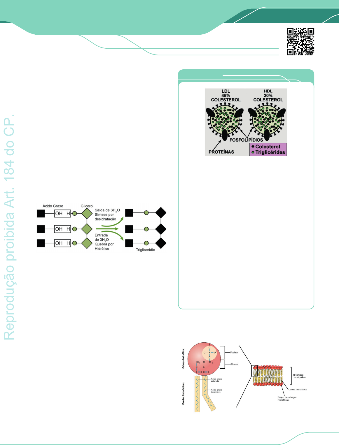 BIOLOGIA I PRÉ-VESTIBULAR 19PROENEM.COM.BR 03 LIPÍDIOS E VITAMINAS LIPÍDIOS São as substâncias popularmente conhecidas como gorduras. São principalmente caracterizadas pela insolubilidade em água. São solúveis em solventes orgânicos (álcool, benzeno, éter e clorofórmio). Isso ocorre pelo fato de os lipídios serem moléculas apolares, não formando polos positivos e nem negativos, como acontece com a água que é uma molécula polar. Quimicamente, os lipídios mais típicos são associações entre moléculas de ácidos graxos e álcool, formando com essa união, um grupo químico chamado éster. CLASSIFICAÇÃO DOS LIPÍDIOS GLICERÍDIOS São a forma mais conhecida dos lipídios e se apresentam na forma de óleo e gorduras produzidas tanto por células animais quanto vegetais. Estas substâncias são responsáveis por formarem o importante grupo fornecedor de energia para os organismos vivos. Eles chegam a fornecer duas vezes mais energia que a mesma quantidade de glicídios. Síntese de Triglicerídeo CERÍDIOS Também são conhecidos por ceras e são muito parecidos com o grupo anterior. A única diferença está no tamanho da molécula de álcool que ele possui (extremamente longa). As ceras são altamente insolúveis em água, fazendo com que várias formas de vida se aproveitem dessa propriedade para a impermeabilização de algumas de suas estruturas. Exemplo: Cera da Carnaúba, cera da abelha. ESTEROIDES É um grupo extremamente importante pelas suas funções biológicas. Esse grupo é responsável: • pela síntese dos hormônios sexuais (testosterona e estrogênio) graças a um tipo de esteroide chamado colesterol; • pela síntese dos hormônios corticosteroides; • pela participação da composição dos sais biliares do fígado; • precursor da formação da vitamina D, através do ergosterol (esteroide produzido pelos vegetais ativado pela ação dos raios ultravioleta). O colesterol é uma substância extremamente importante, pois também atua na composição química das membranas celulares das células animais. Mas também pode ser extremamente perigoso pois pode se acumular na pa rede interna dos vasos sanguíneos, endurecendo-a e diminuindo a efi ciência da passagem do sangue, o que caracteriza a doença chamada arteriosclerose. O colesterol é encontrado em alimentos de origem animal, já que os vegetais não podem sintetizá-lo. Tipos básicos de colesterol: • H.D.L. (High Density Lipoprotein = Lipoproteína de Alta Densidade) - “Bom” colesterol. • L.D.L. (Low Density Lipoprotein = Lipoproteína de Baixa Densidade) - “Mau”colesterol. O colesterol não “anda” sozinho no sangue. Ele se liga a uma proteína e, dessa forma, é transportado. Há dois tipos principais de combinações: o HDL, que é o bom colesterol, e o LDL, que é o mau colesterol. O LDL transporta colesterol para os diversos tecidos e também para as artérias, onde é depositado, daí a denominação mau colesterol. Já o HDL faz exatamente o contrário, isto é, ele transporta o colesterol das artérias, principalmente, para o fígado onde ele é inativo. PROEXPLICA FOSFOLIPÍDIOS São lipídios que pertencem a um grupo especial, pois apresentam, além das substâncias típicas dos lipídios, um grupo fosfato.R ep ro du çã o pr oi bi da A rt. 1 84 d o C P. PRÉ-VESTIBULARPROENEM.COM.BR20 BIOLOGIA I 03 LIPÍDIOS E VITAMINAS São extremamente importantes porque eles atuam como principal constituinte das membranas celulares. Um dos mais importantes fosfolipídios encontrados na membrana da célula é a lecitina. Essa molécula possui uma região polar (com cargas elétricas) que se mistura bem com água e uma região apolar (sem cargas) que se mistura bem com óleos e gorduras. Graças a este arranjo natural, a formação de membranas com duas camadas de lipídios dispostas como o desenho abaixo é devido a uma diferenciação de cargas elétricas. Isto possibilita a interação dos fosfolipídeos de membrana com a água presente dentro e fora da célula, ainda que estabeleça um envoltório para a mesma. Além disso, essa camada dupla de lipídios se apresenta de maneira fluida, permitindo a movimentação de moléculas na membrana. VITAMINAS Vitamina: São compostos orgânicos presentes em pequenas quantidades nos organismos que, desta forma, atuam como elementos reguladores, possibilitando a ocorrência de diferentes tipos de reações químicas cruciais à nossa sobrevivência. As vitaminas também participam da formação de hormônios, células sanguíneas, substâncias químicas do sistema nervoso central e material genético. As 13 vitaminas identifi cadas são classifi cadas de acordo com sua capacidade de dissolução em gordura ou em água. As vitaminas lipossolúveis A, D, E e K são ingeridas junto com alimentos que contêm gordura e, como podem fi car armazenadas na gordura do corpo, não precisam ser consumidas todos os dias. As vitaminas hidrossolúveis, as oito do complexo B e a vitamina C, não podem ser armazenadas, portanto, devem ser consumidas com frequência, de preferência todos os dias. O corpo só pode produzir vitamina D; todas as outras devem ser ingeridas através da alimentação. A ingestão ou produção insufi ciente de algumas vitaminas é caracterizado pela manifestação de sintomas bastante comuns em algumas populações. Estas doenças, as hipovitaminoses, costumam ser revertidas através de modifi cações alimentares ou pelo uso de suplementação indicada por profi ssional qualifi cado. A cegueira noturna é um exemplo de hipovitaminose, sendo causada pela baixa ingestão de vitamina A. Quando ingerida em níveis adequados, esta molécula participa da síntese de pigmentos localizados em nossos olhos, mais especifi camente, na retina. A doença não costuma se manifestar em ambientes bem iluminados ou durante o dia. Em ambientes escuros, notoriamente à noite, a captação da luz pelo sistema sensorial é comprometida, difi cu