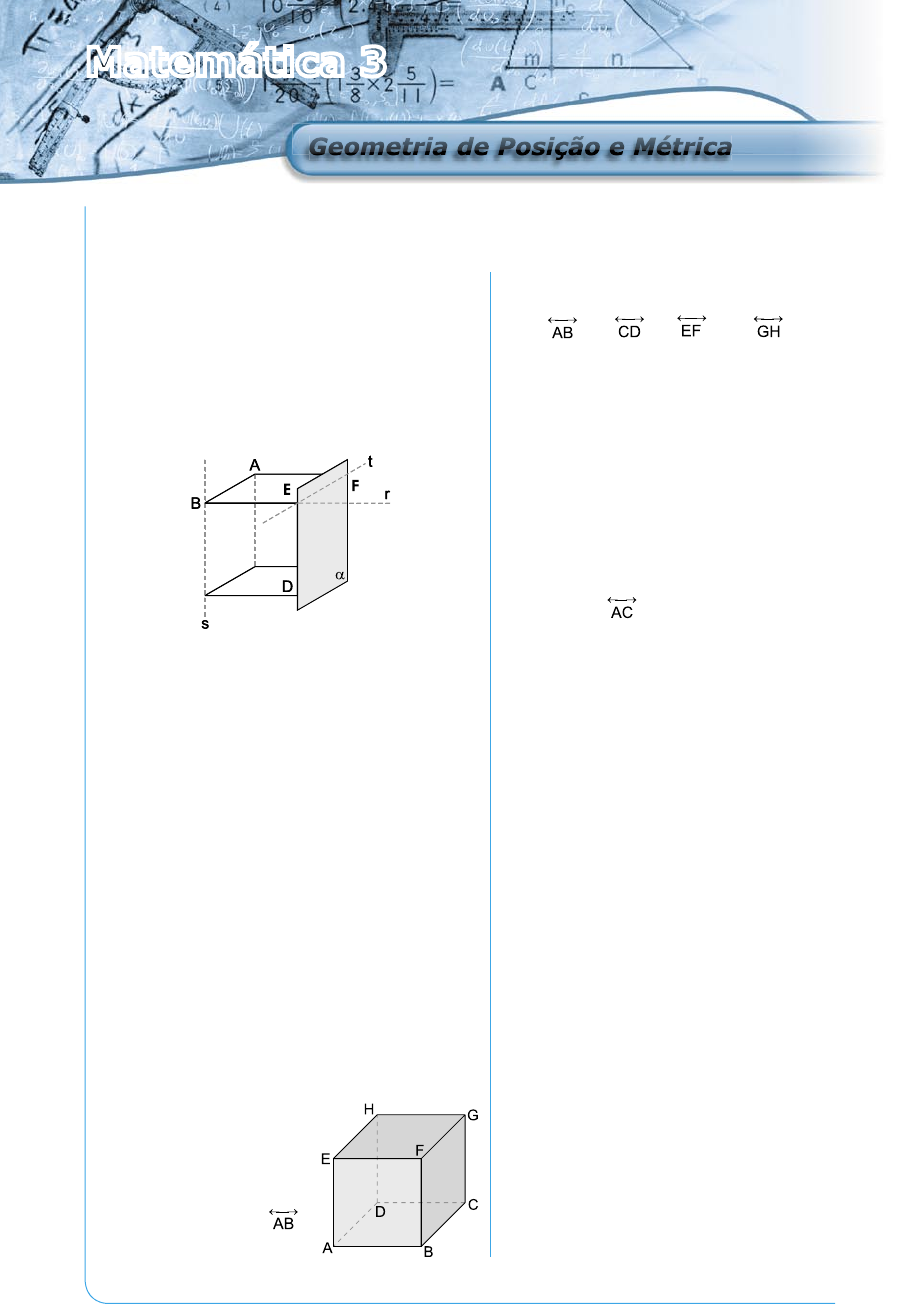73 PV 2 D -0 6 -M A T- 3 4 Matemática 3 Geometria de Posição e MétricaGeometria de Posição e Métrica Capítulo 1 10. Quantos são os planos determinados pelas retas parale- las r = , s = , t = e u = ? Quais são? 11. Fuvest-SP Os segmentos VA, VB e VC são arestas de um cubo. Um plano α, paralelo ao plano ABC, divide esse cubo em duas partes iguais. A intersecção do plano α com o cubo é um: a) triângulo. d) pentágono. b) quadrado. e) hexágono. c) retângulo. 12. Quantos dos planos determinados pelos oito vértices contêm a reta ? Quais são esses planos? 13. Assinale verdadeiro (V) ou falso (F). ( ) Três pontos distintos sempre determinam três retas distintas. ( ) Três pontos colineares e distintos dois a dois determinam uma única reta. ( ) Três pontos distintos determinam um único plano. ( ) Três pontos não colineares determinam um único plano. 14. Assinale verdadeiro (V) ou falso (F). ( ) Três pontos sempre são colineares. ( ) Três pontos sempre são coplanares. ( ) Quatro pontos coplanares determinam um único plano. ( ) Se o ponto P de uma reta r pertence a um plano α, então a reta r está contida em α. 15. FEI-SP Na determinação de um plano, são sufi cientes os seguintes elementos: a) duas retas distintas b) uma reta e um ponto c) duas retas reversas d) duas retas paralelas e) duas retas concorrentes 01. Quais são os entes primitivos na geometria? Como são representados? 02. Explique a diferença entre postulado e teorema? Use a fi gura a seguir para responder às questões de 03 a 07. 03. Quais pontos pertencem a reta r? 0 4. Quais pontos pertencem ao plano α ? 0 5. Qual ponto pertence a r ∩ s ? 0 6. Qual ponto pertence a r ∩ t ? 0 7. Qual reta está contida no plano α ? 0 8. Um ponto P que pertence a uma reta r, divide-a em duas semi-retas opostas. O ponto P é origem de ambas as semi-retas. Se A e B são dois pontos de r, distintos de P, sob que condição podemos afi rmar que o ponto P pertence ao segmento de reta AB? 0 9. Considere o cubo represen- tado ao lado. Os pontos A, B, C, D, E, F, G e H determinam quantos pla- nos que contêm a reta ? Quais são estes planos? 74 16. Marque três pontos distintos A, B e C numa reta r e um ponto D fora de r. Quantas retas ficam determinadas por estes pontos? 17. Sejam M, N e P pontos médios dos lados de um triân- gulo ABC. Quantas são as retas determinadas pelos 6 pontos A, B, C, M, N e P? 18. Num cubo duas faces opostas são ABCD e EFGH. Considere todas as retas que passam por dois dos pontos A, B, C, D, E, F, G e H. Responda: a) Quantas retas passam por A? b) Quantas retas ligam pontos de faces opostas? 19. Considere a pirâmide de base ABCD e vértice V. a) Quantas retas ficam determinadas pelos pontos A, B, C, D e V? b) Quantos planos ficam determinados pelos pontos A, B, C, D e V? 20. Considerando os planos determinados pelos oito vértices de um cubo: a) quantos contém exatamente 4 dos vértices? b) quantos contém exatamente 3 dos vértices? c) qual é o total de planos? 21. Unicamp-SP É comum encontrarmos mesas com 4 pernas que mesmo apoiadas em um piso plano, balançam e nos obrigam a colocar um calço em uma das pernas se a quisermos firme. Explique, usando argumentos de geometria, porque isso não acontece com uma mesa de 3 pernas. 22. FEI-SP Assinale a alternativa falsa: a) Dados dois pontos distintos A e B, existe um plano que os contém. b) Por um ponto fora de uma reta existe uma única paralela a reta dada. c) Existe um e um só plano que contém um triângulo dado. d) Duas retas não coplanares são reversas. e) Três pontos distintos determinam um e um só plano. 23. Assinale verdadeiro (V) ou falso (F). ( ) Três retas, duas a duas concorrentes, são copla- nares. ( ) Três retas, duas a duas paralelas distintas deter- minam três planos. ( ) Três retas, duas a duas concorrentes em pontos distintos, são coplanares. ( ) Duas retas distintas determinam um plano. ( ) Uma reta e dois pontos distintos fora dela deter- minam dois planos. 24. FCC-SP Quatro pontos distintos e não coplanares determinam exatamente: a) 1 plano. d) 4 planos. b) 2 planos. e) 5 planos. c) 3 planos. 25. ITA-SP Qual das afirmações abaixo é verdadeira? a) Três pontos, distintos dois a dois, determinam um plano. b) Um ponto e uma reta determinam um plano. c) Se dois planos distintos têm um ponto em comum, tal ponto é único. d) Se uma reta é paralela a um plano e não está con- tida neste plano, então ela é paralela a qualquer reta desse plano. e) Se a é o plano determinado por duas retas concor- rentes r e s, então toda reta m desse plano, que é paralela à r, não será paralela à reta s. 26. Assinale verdadeiro (V) ou falso (F). ( ) Duas retas reversas são sempre distintas. ( ) Duas retas que não têm ponto em comum são paralelas. ( ) Duas retas que não têm ponto em comum são reversas. ( ) Duas retas distintas ou são reversas, ou são pa- ralelas, ou são concorrentes. ( ) Duas retas de um mesmo plano são sempre pa- ralelas ou concorrentes. ( ) Duas retas que têm um ponto em comum são concorrentes. 27. Assinale verdadeiro (V) ou falso (F). ( ) Duas retas perpendiculares são concorrentes. ( ) Duas retas paralelas podem ser ortogonais. ( ) A medida do ângulo entre duas retas é 90°; logo, elas são perpendiculares ou ortogonais. ( ) Duas retas reversas formam ângulo de 90°; logo, elas são ortogonais. ( ) Duas retas concorrentes são perpendiculares. 28. Assinale verdadeiro (V) ou falso (F). ( ) Três pontos distintos determinam um só plano. ( ) Por um ponto fora de um plano passa uma única reta pararela a esse plano. ( ) Quatro pontos nunca são coplanares. ( ) Se duas retas não têm ponto comum, então elas são paralelas. ( ) Se duas retas não são coplanares, então elas são reversas. 75 PV 2 D -0 6 -M A T- 3 4 29. Unimontes-MG Sejam r, s e t três retas no espaço. Analise as seguintes afirmações: ( ) Se r e s são paralelas, então existe um plano que as contém