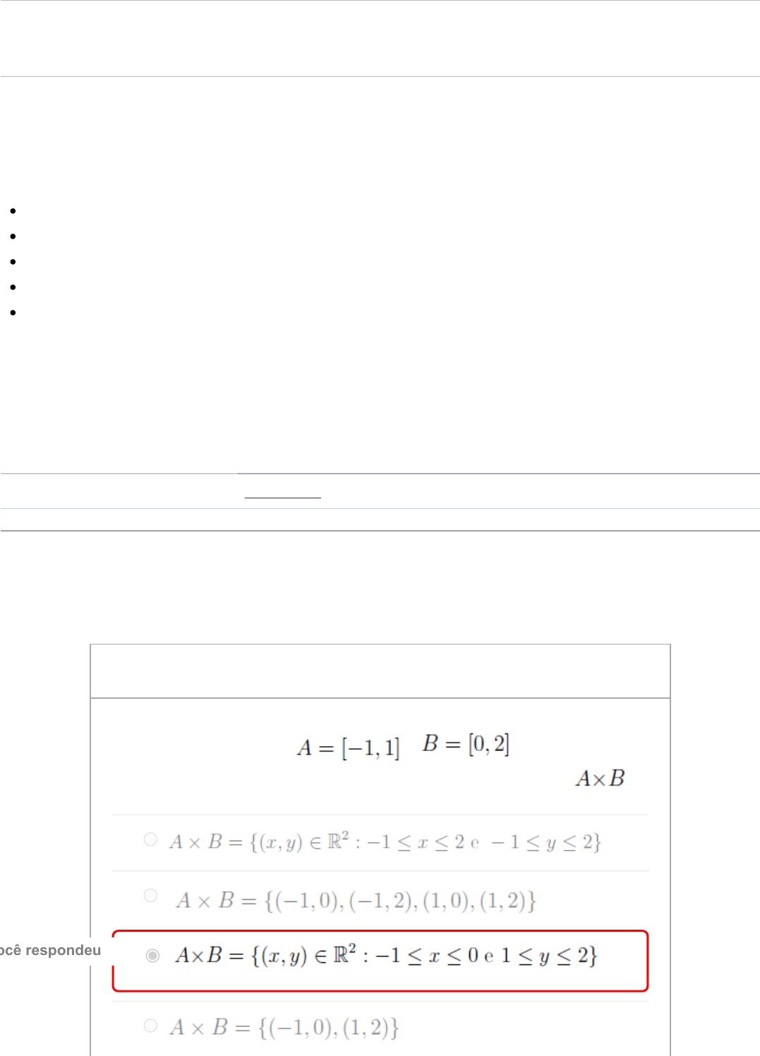 22/05/2023, 22:48 Clique aqui para iniciar a AP2: (UNIGRANRIO - EAD) FUNDAMENTOS DE MATEMATICA ELEMENTAR GRD-0163 (Turma… https://afya.instructure.com/courses/58496/quizzes/193717 1/10 Clique aqui para iniciar a AP2 Entrega 31 mai em 23:59 Pontos 25 Perguntas 10 Disponível 22 mai em 0:00 - 25 jun em 23:59 Limite de tempo Nenhum Instruções Histórico de tentativas Tentativa Tempo Pontuação MAIS RECENTE Tentativa 1 25 minutos 17,5 de 25 Pontuação deste teste: 17,5 de 25 Enviado 22 mai em 22:46 Esta tentativa levou 25 minutos. Veja abaixo, algumas instruções para sua realização. Instruções: Estude todo o conteúdo indicado pelo professor On-line Clique no botão Acessar para realizar a Prova On-line Leia atentamente todas as questões e marque sua resposta Confira as questões respondidas antes de finalizar a prova Para finalizar a realização da prova, clique no botão “Enviar” Fique atento ao prazo de realização da Prova On-line informado no calendário da disciplina. 0 / 2,5 ptsPergunta 1 Considere os conjuntos e . Assinale a alternativa que apresenta corretamente o produto cartesiano . ocê respondeuocê respondeu https://afya.instructure.com/courses/58496/quizzes/193717/history?version=1 22/05/2023, 22:48 Clique aqui para iniciar a AP2: (UNIGRANRIO - EAD) FUNDAMENTOS DE MATEMATICA ELEMENTAR GRD-0163 (Turma… https://afya.instructure.com/courses/58496/quizzes/193717 2/10 esposta corretaesposta correta O produto cartesiano de dois conjuntos é formado pelos pontos cuja primeira coordenada pertence ao primeiro conjunto e a segunda coordenada pertence ao segundo conjunto. Releia a Seção 1.1. Produto Cartesiano, do livro didático. 0 / 2,5 ptsPergunta 2 Considere o gráfico abaixo, que descreve um movimento retilíneo uniforme de um carro, com o tempo dado em segundos e o deslocamento, em metros. Avalie as seguintes asserções e a relação proposta entre elas. A função que descreve a posição em função do tempo é e . PORTANTO A velocidade do carro, no instante , é maior do que a velocidade no instante . 22/05/2023, 22:48 Clique aqui para iniciar a AP2: (UNIGRANRIO - EAD) FUNDAMENTOS DE MATEMATICA ELEMENTAR GRD-0163 (Turma… https://afya.instructure.com/courses/58496/quizzes/193717 3/10 Sobre as asserções, é correto afirmar que: A primeira asserção é verdadeira e a segunda, é falsa. esposta corretaesposta correta As duas asserções são verdadeiras e a segunda é uma consequência correta da primeira. As duas asserções são falsas. As duas asserções são verdadeiras, mas a segunda não é uma consequência correta da primeira. ocê respondeuocê respondeu A segunda asserção é verdadeira e a primeira é falsa. Trata-se de um movimento retilíneo uniforme e, portanto, a velocidade é constante. Releia a Seção 2.3. Aplicações, do livro didático. 2,5 / 2,5 ptsPergunta 3 Considere e . Atribua V (verdadeiro) ou F (falso) para as seguintes igualdades sobre propriedades das funções exponenciais. ( ) , se ; ( ) ; ( ) ; ( ) . 22/05/2023, 22:48 Clique aqui para iniciar a AP2: (UNIGRANRIO - EAD) FUNDAMENTOS DE MATEMATICA ELEMENTAR GRD-0163 (Turma… https://afya.instructure.com/courses/58496/quizzes/193717 4/10 Assinale a alternativa que apresenta, de cima para baixo, a sequência correta. V, V, F, V. Correto!Correto! V, V, V, F. V, F, V, F. V, V, F, F. F, V, F, V. Na verdade, vale que . Releia a Seção 4.1. Gráfico da Função Exponencial, do livro didático. 2,5 / 2,5 ptsPergunta 4 Assinale a única alternativa que apresenta uma equação envolvendo uma função exponencial. . . .Correto!Correto! . . 22/05/2023, 22:48 Clique aqui para iniciar a AP2: (UNIGRANRIO - EAD) FUNDAMENTOS DE MATEMATICA ELEMENTAR GRD-0163 (Turma… https://afya.instructure.com/courses/58496/quizzes/193717 5/10 Uma função é exponencial se é da forma , em que é a variável. Releia a Seção 4.1. Gráfico da Função Exponencial, do livro didático. 2,5 / 2,5 ptsPergunta 5 Considerando a função polinomial do 1º grau , dada por , analise as seguintes afirmações: I. O gráfico da função é decrescente porque o coeficiente angular é negativo. II. é o zero de . III. O ponto pertence ao gráfico da função . IV. O coeficiente linear de é igual a zero. É correto o que se afirma em: I e IV, apenas. I, III e IV, apenas. I, II e IV, apenas. Correto!Correto! I e III, apenas. II, III e IV, apenas. 22/05/2023, 22:48 Clique aqui para iniciar a AP2: (UNIGRANRIO - EAD) FUNDAMENTOS DE MATEMATICA ELEMENTAR GRD-0163 (Turma… https://afya.instructure.com/courses/58496/quizzes/193717 6/10 Na verdade, temos que . Releia a Seção 2.1 – Zero da Função Polinomial do 1º Grau, e a Seção 2.2 – Gráfico da Função Polinomial do 1º Grau, do livro didático. 2,5 / 2,5 ptsPergunta 6 Considere o gráfico da função quadrática , apresentado a seguir. Sobre a função , avalie as seguintes asserções e a relação proposta entre elas. O coeficiente que acompanha o termo quadrático de é positivo. PORQUE Uma raiz é negativa e a outra é igual a zero. Sobre as asserções acima, é correto afirmar que: A primeira asserção é verdadeira e a segunda é falsa. 22/05/2023, 22:48 Clique aqui para iniciar a AP2: (UNIGRANRIO - EAD) FUNDAMENTOS DE MATEMATICA ELEMENTAR GRD-0163 (Turma… https://afya.instructure.com/courses/58496/quizzes/193717 7/10 As duas asserções são falsas. A segunda asserção é verdadeira e a primeira é falsa. As duas asserções são corretas, mas a segunda não é uma justificativa correta da primeira. Correto!Correto! As duas asserções são corretas e a segunda é uma justificativa correta da primeira. O fato de as raízes serem positivas, negativas ou iguais a zero não influencia a determinação da concavidade de uma função. Releia a Seção 3.2. Gráfico da Função Quadrática, do livro didático. 0 / 2,5 ptsPergunta 7 Considere a função quadrática , dada por . Assinale a alternativa que apresenta, corretamente, o vértice da parábola d
