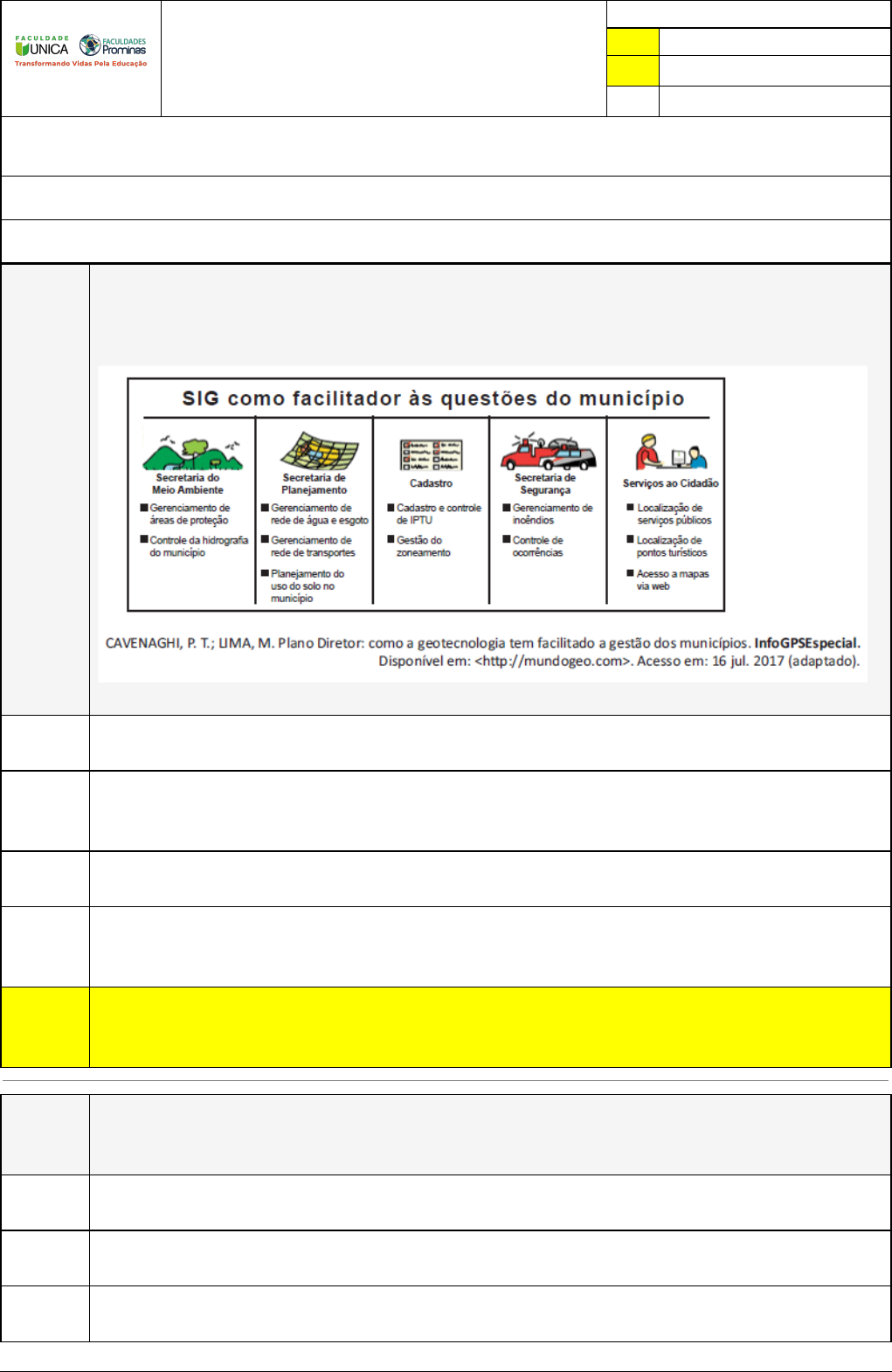 Pincel Atômico - 26/04/2023 13:52:33 1/5 RAFAEL WESTPFAL Exercício Caminho do Conhecimento - Etapa 21 (20480) Atividade finalizada em 26/04/2023 13:51:56 (667944 / 1) LEGENDA Resposta correta na questão # Resposta correta - Questão Anulada X Resposta selecionada pelo Aluno Disciplina: PESQUISA E PRÁTICA INTERDISCIPLINAR: CARTOGRAFIA, GEOGRAFIA URBANA E DA POPULAÇÃO [788771] - Avaliação com 8 questões, com o peso total de 1,67 pontos [capítulos - 4] Turma: Segunda Graduação: Segunda Graduação 6 meses - Licenciatura em Geografia - Grupo: FPD-FEV2022 - SGegu0A050123 [81248] Aluno(a): 91411341 - RAFAEL WESTPFAL - Respondeu 7 questões corretas, obtendo um total de 1,46 pontos como nota [359610_1425 01] Questão 001 (ENADE 2017) O Sistema de Informações Geográficas (SIG) tem sido uma ferramenta eficaz nas ações vinculadas ao planejamento, à gestão, ao monitoramento, à caracterização dos espaços urbanos, possibilitando aos gestores uma visão mais abrangente sobre os municípios, auxiliando nas tomadas de decisões. Sobre o SIG e sua aplicação no espaço urbano, assinale a opção correta. X O banco de dados do SIG, criado para caracterizar os municípios, contém imagens de satélites e mapas temáticos, que são representações vetoriais do espaço urbano. A Lei n. 10.257/2001, Estatuto da Cidade, tornou o SIG uma ferramenta oficial exigida na elaboração dos planos diretores, obrigatórios para cidades de mais de 20 mil habitantes. O banco de dados do SIG utiliza os mesmos parâmetros de análise espacial da cartografia assistida por computador. O uso do SIG como ferramenta de análise espacial popularizou-se na década de 1960, período em que o geógrafo era o principal responsável pela elaboração do planejamento urbano. O SIG pode ser aplicado em zoneamentos diversos, monitoramento de áreas de risco e de proteção ambiental, adequação tarifária de impostos e estruturação de redes de infraestrutura. [359609_1458 29] Questão 002 (UFPA – adaptado) No estudo das interações da sociedade com o meio físico devem- se considerar fatores sociais, econômicos, tecnológicos e culturais que influenciam na expansão do espaço urbano. Deste modo, pode-se concluir que: os aspectos da poluição das águas e descarte irregular dos resíduos sólidos em áreas periféricas são de responsabilidade da população local. as formas de organização e expansão do espaço urbano consideram a dinâmica natural das áreas de várzeas e de terra firme. o modo de vida ribeirinho apresenta resistência diante da pressão da expansão e modernização urbana. Pincel Atômico - 26/04/2023 13:52:33 2/5 X o contraste das diferentes habitações revela as desiguais condições de vida da população que reside em bairros periféricos de uma cidade. a favela é um bom indicador da falta de políticas públicas em habitações no qual reside a maioria da população que emigrou do campo e que tem dificuldades para obter moradias de boa qualidade. [359609_1424 95] Questão 003 (FUNCAB 2013) As cidades e aglomerações urbanas estão constantemente em transformação através de reestruturações, segregações habitacionais, ampliação dos espaços construídos, entre outros fatores. O fenômeno da conurbação faz parte de um processo de transformação e é de importante identificação, pois cria, na maioria das vezes, a necessidade de uma atenção particularizada para possíveis consequências dele decorrentes. A conurbação é um fenômeno que pode ser definido como X o encontro e junção dos tecidos urbanos de dois ou mais municípios, formando uma única mancha urbana. o fluxo diário entre trabalhadores residentes em cidades localizadas afastadas das regiões metropolitanas. transformação de um pequeno núcleo urbano em uma região metropolitana em função do investimento direto do poder público. a produção de uma urbanização verticalizada nas áreas centrais das cidades pequenas e médias. a ação das diferentes unidades da federação na criação e definição de suas próprias regiões metropolitanas. [359609_1458 25] Questão 004 Considerando a discussão em relação aos conceitos discutidos nesta unidade, analise os itens a seguir. I. A metropolização é um fenômeno que ocorre com a expansão das áreas rurais de diversas metrópoles e grande adensamento em áreas centrais. II. As zonas de transição entre o espaço urbano e rural, onde ocorre um aumento populacional, são denominadas de áreas periurbanas. III. A diminuição dos espaços verdes e a expansão física das áreas urbanas que interliga cidades vizinhas ficou conhecido como periferização. É correto o que se afirma somente em: X II. I e II. I e III. I. III. Pincel Atômico - 26/04/2023 13:52:33 3/5 [359609_1424 96] Questão 005 (ENADE 2017) O século XX foi dominado por duas angústias: o medo da hiperconcentração de pessoas nas megacidades e o pavor do desaparecimento da cidade, dissolvida por territórios cada vez mais amplos, extensos e fragmentados. SECCHI, B. A cidade do século vinte. São Paulo: Perspectiva, 2009 (adaptado). O paradigma da cidade dispersa retrata uma realidade que não se restringe ao contexto brasileiro ou latino-americano; é global. Segundo estudo do New Climate Economy, realizado em 2015, cidades dispersas custam à economia americana US$ 1 trilhão por ano. A análise indica que a dispersão garante muitos benefícios (aumenta a renda per capita de terreno urbanizado e o desenvolvimento de infraestrutura, por exemplo), direcionados às pessoas que lá vivem, mas gera muitos custos ao restante da sociedade (maiores distâncias a serem percorridas, necessidade de mais quilômetros de infraestruturas para saneamento, iluminação, etc.). A figura a seguir apresenta dois modelos de cidades: o de cidade dispersa e o de cidade compacta. No que se refere às cidades dispersas, avalie as asserções a seguir e a relação proposta entre elas: I. Em uma ci