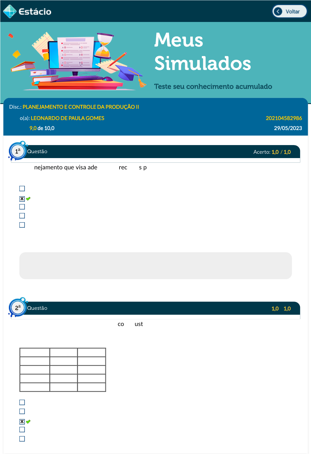29/05/23, 18:33 Estácio: Alunos https://simulado.estacio.br/alunos/ 1/5 Meus Simulados Teste seu conhecimento acumulado Disc.: PLANEJAMENTO E CONTROLE DA PRODUÇÃO II Aluno(a): LEONARDO DE PAULA GOMES 202104582986 Acertos: 9,0 de 10,0 29/05/2023 Acerto: 1,0 / 1,0 O Planejamento que visa adequar os recursos produtivos com a demanda agregada, num horizonte de médio prazo é chamado de: Planejamento Estratégico Planejamento Agregado de Vendas e Operações Planejamento de Capacidade Planejamento dos Recursos Empresariais Planejamento Mestre de Produção Respondido em 29/05/2023 17:49:39 Explicação: A resposta correta é: Planejamento Agregado de Vendas e Operações Acerto: 1,0 / 1,0 Na estratégia de produção constante com ajustes através de estoques apresentado abaixo, caso o estoque inicial em setembro seja de 900 unidades, qual será o estoque planejado para o �nal de dezembro? Mês Produção Demanda Setembro 300 400 Outubro 300 500 Novembro 300 600 Dezembro 300 400 100 unidades 400 unidades 200 unidades. 500 unidades 300 unidades Respondido em 29/05/2023 17:52:40 Questão1 a Questão2 a https://simulado.estacio.br/alunos/inicio.asp javascript:voltar(); 29/05/23, 18:33 Estácio: Alunos https://simulado.estacio.br/alunos/ 2/5 Explicação: A resposta correta é: 200 unidades Acerto: 1,0 / 1,0 Calcule a quantidade mínima a ser produzida/vendida de forma a que a empresa não tenha prejuízo, considerando os seus Custos Fixos Mensais de R$500.000,00 e o Custo Variável Unitário de R$ 100,00 por unidade. O Preço de Venda do produto no mercado é de R$ 200,00 por unidade. 5.000 unidades 6.000 unidades 3.500 unidades 8.000 unidades 4.500 unidades Respondido em 29/05/2023 17:54:05 Explicação: A resposta correta é: 5.000 unidades Acerto: 1,0 / 1,0 Na Política de Acompanhamento da Demanda, os ajustes podem ser efetuados através das ações estabelecidas abaixo, EXCETO: Ajustes na demanda Terceirização de serviços Horas Extras Deslocamento de funcionários para outras atividades Contratação de mão de obra temporária Respondido em 29/05/2023 17:54:49 Explicação: A resposta correta é: Ajustes na demanda Acerto: 1,0 / 1,0 O MRP (Material Requirements Planning ¿ Planejamento das Necessidades de Materiais) é uma ferramenta que permite que as empresas efetuem o planejamento de todos os seus materiais. O sistema no qual é feito o apontamento de produção realizada pela fábrica, alimentando online o banco de dados do sistema responsável pela atualização dos estoques em tempo real é: Módulo de engenharia. Módulo de cadastro de itens. Questão3 a Questão4 a Questão5 a 29/05/23, 18:33 Estácio: Alunos https://simulado.estacio.br/alunos/ 3/5 Módulo de capacidade. Módulo de estoque. Módulo de controle de chão de fábrica. Respondido em 29/05/2023 17:58:16 Explicação: No Módulo de controle de chão de fábrica é feito o apontamento de produção realizada pela fábrica, alimentando online o banco de dados do sistema responsável pela atualização dos estoques em tempo real. Acerto: 1,0 / 1,0 OS Sistemas de Planejamento dos Recursos de Masnufatura são conhecidos pela sigla: MRP MRP II ECR CRM ERP Respondido em 29/05/2023 18:00:22 Explicação: A resposta correta é: MRP II Acerto: 0,0 / 1,0 No Planejamento Detalhado da Produção os gargalos são identi�cados durante a etapa de: Administração de Materiais Sequenciamento da Produção Carregamento dos Centros de Trabalho Liberação de Ordens Emissão de Ordens Respondido em 29/05/2023 18:18:23 Explicação: A resposta correta é: Carregamento dos Centros de Trabalho Acerto: 1,0 / 1,0 O PERT (Program Evaluation and Review Technique ou Técnica de Avaliação e Revisão de Programas), quando usado no planejamento operacional de atividades de produção, constitui um plano relacionado com: Questão6 a Questão7 a Questão8 a 29/05/23, 18:33 Estácio: Alunos https://simulado.estacio.br/alunos/ 4/5 os métodos a serem empregados nas linhas de produção o tempo a ser empregado na execução das tarefas dinheiro a ser dispendido o comportamento dos integrantes na linha de produção a atribuição de cargos Respondido em 29/05/2023 18:25:40 Explicação: A resposta correta é: o tempo a ser empregado na execução das tarefas Acerto: 1,0 / 1,0 Com relação as a�rmativas abaixo, assinale a opção VERDADEIRA: I - Na produção enxuta, a movimentação de pessoas e o transporte de materiais são considerados desperdícios. II - Na produção enxuta, as inspeções de produtos são considerados desperdícios. III - Na produção enxuta, processamentos inadequados são considerados desperdícios. Todas as a�rmativas estão corretas Apenas as a�rmativas II e III estão corretas Apenas a a�rmativa I está correta Apenas as a�rmativas I e II estão corretas Apenas as a�rmativas I e III estão corretas Respondido em 29/05/2023 18:03:16 Explicação: A resposta correta é: Todas as a�rmativas estão corretas. Acerto: 1,0 / 1,0 Uma empresa faturou R$ 2 milhões no mês de abril, com 150 funcionários que trabalham, cada um, 180 horas por mês. A sua produtividade foi de: R$ 1.200,00 /Hh R$ 52,00 /Hh R$ 148,00 /Hh R$ 74,00 /Hh R$ 1.330,00 /Hh Respondido em 29/05/2023 18:27:02 Explicação: 2.000.000 / (150 X 180) = 2.000.000 / 27.000 = 74 reais por Homem - hora Questão9 a Questão10 a 29/05/23, 18:33 Estácio: Alunos https://simulado.estacio.br/alunos/ 5/5