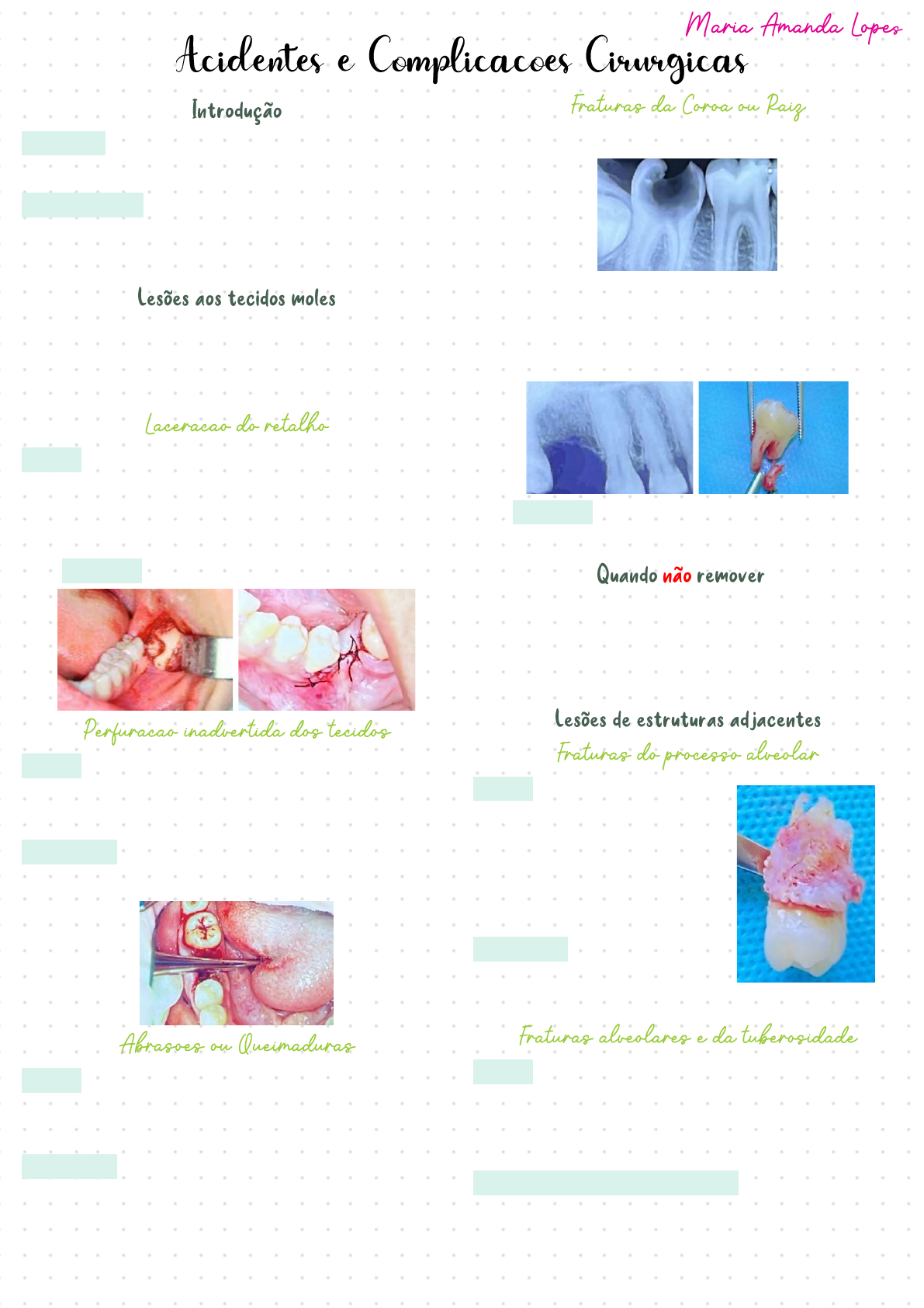 ACIDENTES: situações que ocorrem no transoperatório EX: fratura dentária, fratura mandibular COMPLICAÇÕES: Situações que acontecem no período pós-operatório EX: alveolite, parestesia - Laceração do retalho - Perfuração inadvertida dos tecidos - Abrasões ou queimadoras nos lábios CAUSAS: ▪ Tamanho inadequado ▪ Tracionamento excessivo ▪ Deslocamento inadequado Para tratamento reposiciona o tecido e sutura CAUSAS: ▪ Uso inadvertido de força ▪ Falta de apoio com os dedos (alavanca) TRATAMENTO: ▪ Evitar infecção e promover cicatrização CAUSAS: ▪ Uso de afastadores inadequados ou ressecados ▪ Queimaduras com brocas TRATAMENTO: ▪ Uso de pomadas ou umedecimento da área Fraturas coronárias – cáries extensas Fraturas radiculares − Força excessiva − Adelgaçamentos. Dilacerações ou hipercementose − Osso compacto Para prevenção, é indicado realizar odontosecção e evitar forças excessivas ? Fragmento de até 3mm Impossibilidade de visualização Os prejuízos excedem os benefícios Ausência de lesões associadas CAUSAS: ▪ Uso do fórceps ▪ Aplicação de forças excessivas ▪ Caninos e molares superiores TRATAMENTO: ▪ Separação de osso-dente ▪ Remoção e sutura CAUSAS: ▪ Uso de fórceps ▪ Forças excessivas ▪ Principalmente em molares superiores CONDIÇÕES FAVORÁVEIS À FRATURA: ▪ Pacientes idosos ▪ Dentes isolados ▪ Pneumatização excessiva do seio maxilar “O CD que apoia o dedo no processo alveolar durante a fratura (se o osso permanecer aderido ao periósteo) deve ter cuidados extremos para assegurar a vitalidade daquele segmento” TRATAMENTO: ▪ Separação do dente a ser extraído do osso fraturado ▪ Contenção do segmento fraturado e exodontia aberta após 6-8 semanas (em grandes porções de tuberosidade) ▪ Remoção do segmento e sutura CAUSA: força inadequada em fórceps ou alavancas PREVENÇÃO: direção e força adequada nos movimentos de luxação e extração TRATAMENTO: confecção de uma restauração provisória e informar ao paciente CAUSA: falta de atenção no planejamento PREVENÇÃO: planejamento pré-operatório criterioso TRATAMENTO: reposicionamento imediato do dente extraído, contenção semirrígida por 14 dias CAVIDADE BUCAL: ▪ Tecidos altamente vascularizados ▪ Ferida aberta – tecidos moles ▪ Língua ▪ Movimento de sucção PREVENÇÃO: ▪ Histórico cuidadoso do paciente Substancias em uso: a.aceltilsalicilico, anticoagulantes, antibióticos de largo espectro (vitamina K), álcool e anticancerígenos e quimioterápicos − Cirurgias atraumáticas − Incisões únicas − Cuidados com tecidos moles − Remoção de todo tecido de granulação dos alvéolos − Ligadura ou compressão de vasos lesionados − Contenção de sangramento ósseo − Uso de substancias hemostáticas − Identificação da causa − Compressão − Intervenção cirúrgica: ✓ Limpeza ✓ Ligadura de vasos ✓ Uso de substancias hemostáticas ✓ Sutura − Identificação de desordens sanguíneas Caracterizado pelo sangramento trans e pós operatório para dentro dos tecidos adjacentes. PREVENÇÃO: cirurgia atraumática TRATAMENTO: aplicação de calor úmido ▪ Esquimose – sangue entre a células da pele, sem elevação de volume ▪ Hematoma – sangue entre osso e pele, forma espaço Inflamação no alvéolo, se o paciente não tem dor, não é alveolite Fatores contribuintes ▪ Má higiene bucal ▪ Isquemia (vasoconstritores) ▪ Deslocamento do coágulo (bochechos) ▪ Má circulação alveolar (idade, doenças) ▪ Falhas de biossegurança ▪ Exposição óssea ▪ Presença de restos dentários ou de materiais irritantes no alvéolo ▪ Doença sistêmica (imunodepressão) Aparece no 4º dia, dor latejante ALVEOLITE ÚMIDA ALVEOLITE SECA Dor ** Dor *** Alvéolo parcialmente preenchido Alvéolo vazio Presença de coagulo em desarranjo Ausência de coagulo Odor fétido Odor fétido Presença de corpos estranhos Ausência de corpos estranhos Coloração róseo-avermelhado Coloração acinzentada TRATAMENTO: ▪ Radiografia para checar presença de corpo estranhos ▪ Anestesia regional de preferencia ▪ Irrigação com soro fisiológico 0,9% ▪ Escarificação do tecido mole (não curetar osso necrótico) ▪ Analgésicos ▪ Antibióticos (em sinais de infecção Estimulação para formação de novo coagulo Para o espaço infratemporal Para o espaço submandibular Para o espaço sublingual PREVENÇÃO: ▪ Aplicação judiciosa de força durante a exodontia ▪ Aplicação de técnicas abertas envolvendo osteotomia e odontossecção A fistula é sempre maior do que aparenta ser ▪ O tratamento é fechamento imediato CAUSA: Cirurgias com o paciente deitado e/ou sob impacto dos movimentos intempestivos do paciente ou excesso de força pelo profissional TRATAMENTO: Recomenda-se ao paciente a ingestão abundante de alimentos a base de massa e cereais Introdução do dente na traqueia, que se aloja, geralmente nos brônquios CAUSA: força excessiva, movimentos intempestivos e trabalhos com paciente deitado Deve conduzir o paciente imediatamente para o hospital, para realização de broncoscopia ou outros procedimentos Tem que pedir radiografia de tórax e abdômen