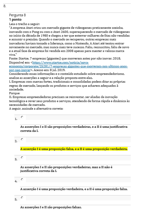 Considerando essas informações e o conteúdo estudado sobre analise as asserções a seguir e a relação proposta entre elas. I. Empresas com marcas tradicionais e consolidadas podem ditar as regras de mercado, lançando os produtos e serviços que acharem adequados à Porque: II. Empresas empreendedoras precisam se reinventar, ser aliadas da inovação tecnológica e rever seus produtos e serviços, atendendo de forma rápida e às necessidades de mercado. A seguir, assinale a alternativa o 1. As asserções I e II são proposições verdadeiras, e a II é uma justificativa correta da I. 2. A asserção I é uma proposição e a II é uma proposição 3. As asserções I e II são proposições verdadeiras, mas a II não é justificativa correta da 4. A asserção I é uma proposição verdadeira, e a II é uma proposição 5. As asserções I e II são proposições falsas.