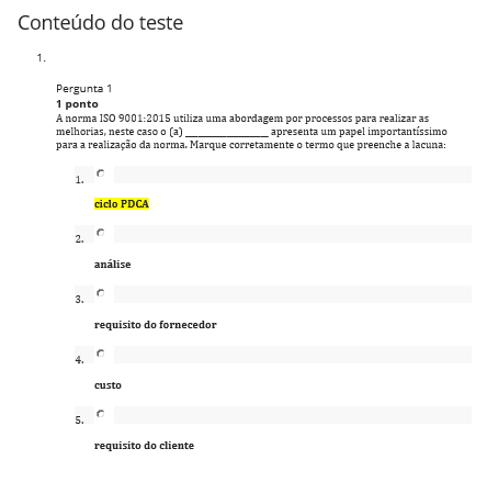 1. ciclo PDCA 2. analise 3. requisito do fornecedor 4. custo 5. requisito do cliente