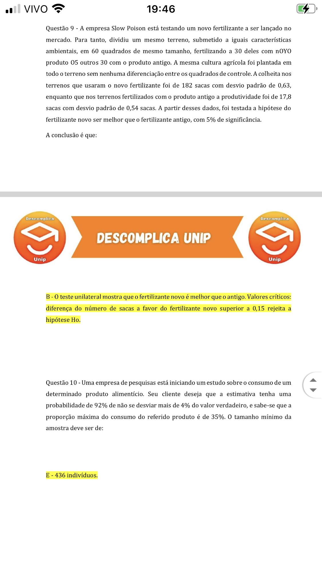 A empresa Slow Poison está testando um novo fertilizante a ser lançado no mercado. Para tanto, dividiu um mesmo terreno, submetido a iguais características ambientais, em 60 quadrados de mesmo tamanho, fertilizando a 30 deles com nOYO produto 05 outros 30 com o produto antigo. A mesma cultura agrícola foi plantada em todo o terreno sem nenhuma diferenciação entre os quadrados de controle. A colheita nos terrenos que usaram o novo fertilizante foi de 182 sacas com desvio padrão de 0,63, enquanto que nos terrenos fertilizados com o produto antigo a produtividade foi de 17,8 sacas com desvio padrão de 0,54 sacas. A partir desses dados, foi testada a hipótese do fertilizante novo ser melhor que o fertilizante antigo, com 5% de significância. A conclusão é que: Descomplica Descomplica DESCOMPLICA UNIP Unip Unip B o teste unilateral mostra que o fertilizante novo é melhor que o antigo. Valores críticos: diferença do número de sacas a favor do fertilizante novo superior a 0,15 rejeita a hipótese Ho.