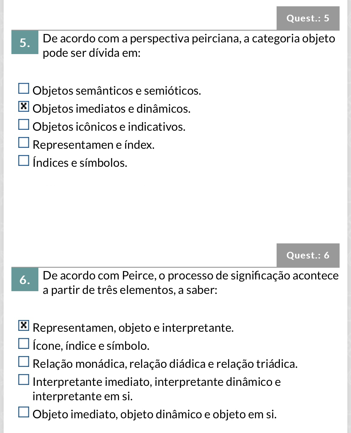 Representamen, objeto e interpretante. Índice e símbolo. Relação monádica, relação diádica e relação triádica. Interpretante imediato, interpretante dinâmico e interpretante em si. Objeto imediato, objeto dinâmico e objeto em si. a) I, II e III estão corretas. b) II, III e IV estão corretas. c) I, III e V estão corretas. d) I, IV e V estão corretas. e) II, IV e V estão corretas.