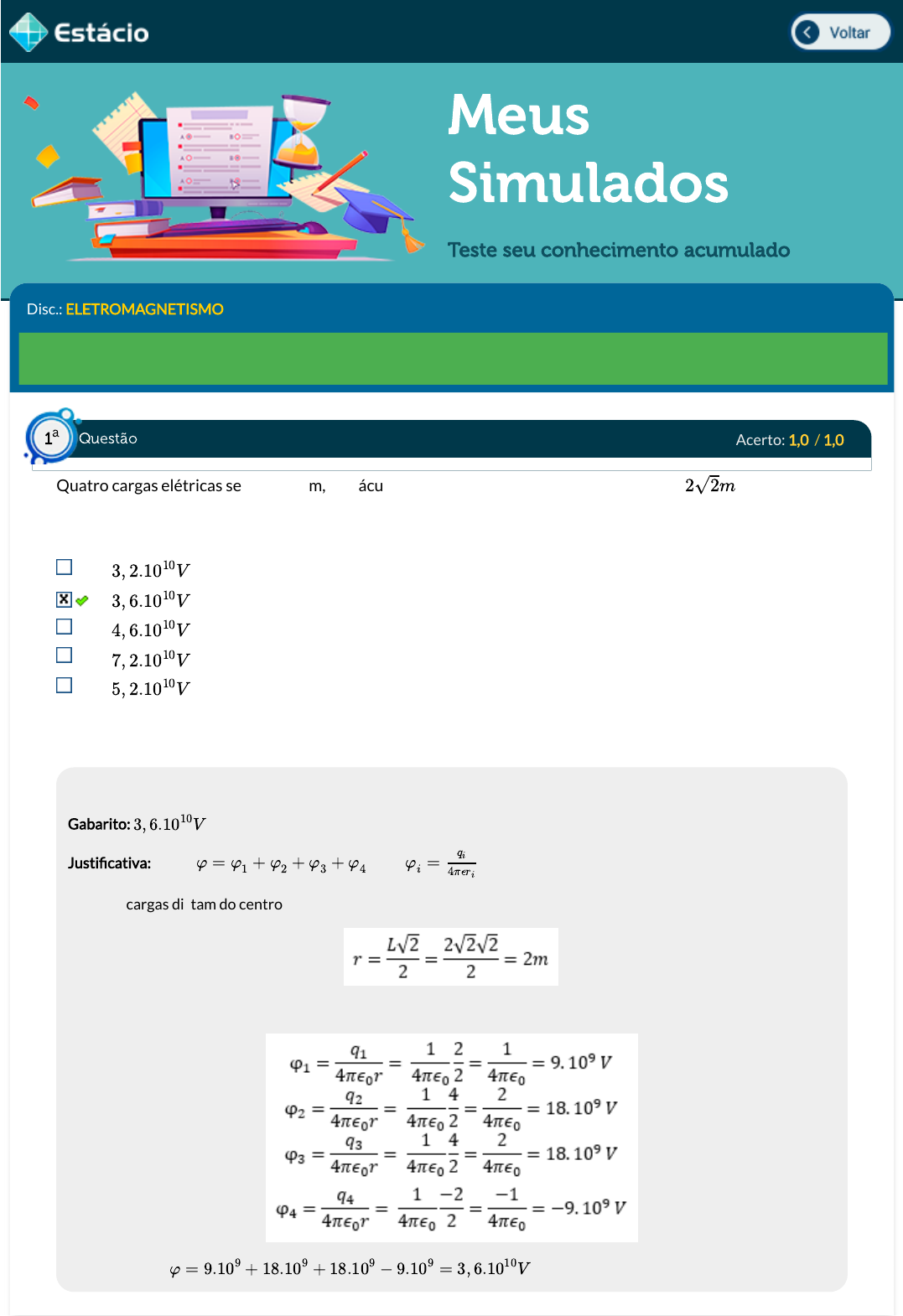 30/05/2023, 11:50 Estácio: Alunos https://simulado.estacio.br/alunos/ 1/10 Meus Simulados Teste seu conhecimento acumulado Disc.: ELETROMAGNETISMO Aluno(a): LUAN GABRIEL LIMA CRUZ DE ANDRADE 202007071964 Acertos: 3,0 de 10,0 30/05/2023 Acerto: 1,0 / 1,0 Quatro cargas elétricas se encontram, no vácuo, nos quatros vértices de um quadrado de de lado. As cargas apresentam valores de 2C, 4C, 4C e -2C. Determine o potencial elétrico gerado por esta distribuição de carga no centro do quadrado. Considere como referencial o potencial zero no in�nito. Respondido em 30/05/2023 10:35:47 Explicação: Gabarito: Justi�cativa: Assim onde Todas as cargas distam do centro o mesmo valor que será a metade da diagonal do quadrado Então Portanto assim 2√2m 3, 2.1010V 3, 6.1010V 4, 6.1010V 7, 2.1010V 5, 2.1010V 3, 6.1010V φ = φ1 + φ2 + φ3 + φ4 φi = qi 4πϵri φ = 9.109 + 18.109 + 18.109 − 9.109 = 3, 6.1010V Questão1 a https://simulado.estacio.br/alunos/inicio.asp javascript:voltar(); 30/05/2023, 11:50 Estácio: Alunos https://simulado.estacio.br/alunos/ 2/10 Acerto: 0,0 / 1,0 Um capacitor de placas paralelas apresenta um dielétrico entre suas placas com permissividade elétrica relativa igual a 4. Este dielétrico apresenta uma densidade volumétrica de cargas . As duas placas estão conectadas a uma fonte de tensão constante e apresentam uma distância entre si. Determine a distribuição do potencial elétrico dentro do capacitor. Considere a placa ligada no polo positivo da bateria localizada em e a placa ligada no polo negativo da bateria em . Despreze o efeito das bordas das placas. Respondido em 30/05/2023 10:37:28 Explicação: Gabarito: Justi�cativa: Como temos carga na região iremos resolver a equação de Poisson. O potencial só depende da coordenada x. Esta equação será válida para . Analisando o problema vemos que na primeira placa, em , a tensão está ligada ao da bateria, assim, . Da mesma forma, que a segunda placa está ligada ao da bateria, portanto, . ρV V1 h x = 0 x = d φ(x) = x2 + hx ρV 84 ρV 8ϵ0 φ(x) = − x2 + ( − + h)xρV 8ϵ0 V1 h ρV 8ϵ0 φ(x) = x2 + hx + V1 ρV 84 ρV 8ϵ0 φ(x) = − x2 + ( − + h)x + V1 ρV 8ϵ0 V1 h ρV 8ϵ0 φ(x) = x2 + ( − h)x + 2V1 ρV 8ϵ0 V1 h ρV 8ϵ0 φ(x) = − x2 + ( − + h)x + V1 ρV 8ϵ0 V1 h ρV 8ϵ0 0 < x < h x = 0 V1 φ(x = 0) = V1 0V φ(x = h) = 0 Questão2 a 30/05/2023, 11:50 Estácio: Alunos https://simulado.estacio.br/alunos/ 3/10 Substituindo obtemos a distribuição de potencial elétrico Acerto: 0,0 / 1,0 Determine o valor do campo elétrico, gerado por um anel de carga de raio 4m, em um ponto no eixo do anel uma altura 3m do centro. Sabe-se que o potencial elétrico gerado pelo anel, em seu eixo central, vale , onde z é a distância, medida em metros, ao centro do anel. Respondido em 30/05/2023 10:40:40 Explicação: Gabarito: Justi�cativa: O potencial elétrico está sendo dado em coordenadas cilíndrica dependo apenas da coordenada z. Precisamos obter o gradiente do potencial Como ele depende apenas de z, se tem e igual a zero, assim Portanto Como se deseja obter o campo a uma distância z = 3m do centro do anel. Acerto: 1,0 / 1,0 φ = 10 10 √z2+16 ẑ 3.1010 3√25 V m ẑ 5.1010 3√25 V m ẑ 1010 3√25 V m ẑ 3.1010 3√100 V m ẑ 34 3√250 V m ẑ 3.1010 3√25 V m ∂φ ∂ρ ∂φ ∂ϕ Questão3 a Questão4 a 30/05/2023, 11:50 Estácio: Alunos https://simulado.estacio.br/alunos/ 4/10 Determine a densidade de corrente em um ponto P (X,Y,Z) = (1, 1, 2) , com coordenadas medidas em m, que se encontra em uma região que possui um campo magnético, medido em A/m, . Respondido em 30/05/2023 11:07:16 Explicação: Acerto: 1,0 / 1,0 Os materiais magnéticos podem ser divididos em três tipos: diamagnéticos, paramagnéticos e os ferromagnéticos. Marque a alternativa que NÃO é uma característica do material paramagnético. Podem ser usados como imãs permanentes. Sofrem uma leve magnetização na presença de campo magnético externo. São atraídos levemente por imãs permanentes. Sem a presença de campo magnético externo apresenta um campo magnético interno praticamente nulo. Possui permeabilidade magnética um pouco maior do que a unidade. Respondido em 30/05/2023 11:10:24 Explicação: Os paramagnéticos apresentam um campo interno praticamente nulo, pois os momentos resultantes têm direções aleatórias. Na presença do campo externo sofrem um alinhamento dos momentos orbitais (magnetização), provocando um pequeno campo na direção do campo externo, alterando levemente o mesmo. Isso é quantizado por uma permeabilidade magnética um pouco maior do que a unidade. Eles são levemente atraídos por imãs. Ao se tirar o campo externo voltam a situação original, não permanecendo magnetizados, não podendo, portanto, ser usados como imãs permanentes. →H(x, y, z) = yz2x̂ = 4x2yŷ + yx3ẑ 6x̂ − ŷ + ẑ (A/m2) x̂ + 4ŷ + ẑ (A/m2) x̂ + ŷ + 4ẑ (A/m2) 6x̂ + ŷ + 6ẑ (A/m2) x̂ − ŷ − ẑ (A/m2) Questão5 a 30/05/2023, 11:50 Estácio: Alunos https://simulado.estacio.br/alunos/ 5/10 Acerto: 0,0 / 1,0 Uma barra condutora, de massa 20 kg, se encontra apoiada sobre um plano inclinado, no ar, de abertura 300. Esta barra fecha um circuito que será atravessado por uma corrente 5A, no sentido horário. O plano encontra- se em uma região com campo magnético paralelo ao papel de cima para baixo. Não existe atrito entre a barra e o plano. Determine o valor do campo para que a barra livre permaneça em repouso sobre o plano. Considere g = 10 m/s2. Respondido em 30/05/2023 11:43:32 Explicação: →H 900√3 μ0 A m 800√3 3μ0 A m 800√3 μ0 A m 500√3 μ0 A m 500√3 3μ0 A m Questão6 a 30/05/2023, 11:50 Estácio: Alunos https://simulado.estacio.br/alunos/ 6/10 Acerto: 0,0 / 1,0 Respondido em 30/05/2023 11:44:31 Explicação: I = μ0A 15 7 I = A6 5 I = μ0A 6 5 I = A 5 6 I = μ0A 5 6 Questão7 a 30/05/2023, 11:50 Estácio: Alunos https://simulado.estacio.br/a