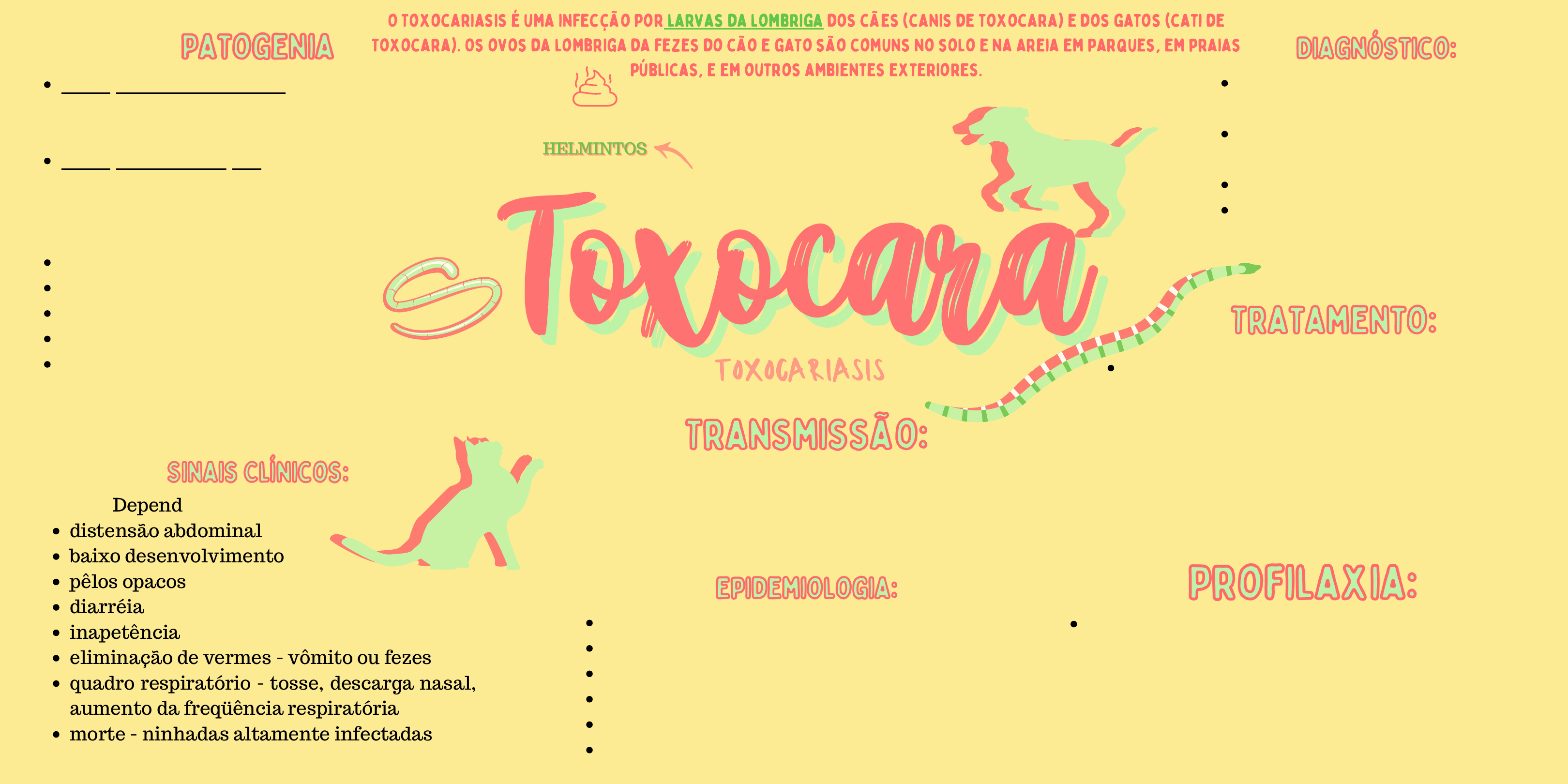 A transmissão da Toxocara ocorre normalmente por transmissão transplacentária ou ingestão de ovos do parasita. sinais respiratórios em ninhada de 2 semanas patência - pesquisa de ovos nas fezes técnicas de flutuação animais jovens repetir o exame caso resultado seja negativo @La ravet.studies O tratamento padrão para a Toxocara é um curso de cinco dias do albendazole. Isto é suplementado às vezes com os corticosteroide para suprimir a reacção alérgica às lombrigas. Para OLM, a cirurgia, os esteróides, e a quimioterapia (antiparasitária) anthelminthic são os métodos de tratamento preferidos. O Toxocariasis é uma infecção por larvas da lombriga dos cães (canis de Toxocara) e dos gatos (cati de Toxocara). Os ovos da lombriga da fezes do cão e gato são comuns no solo e na areia em parques, em praias públicas, e em outros ambientes exteriores. distensão abdominal baixo desenvolvimento pêlos opacos diarréia inapetência eliminação de vermes - vômito ou fezes quadro respiratório - tosse, descarga nasal, aumento da freqüência respiratória morte - ninhadas altamente infectadas Dependem do grau de infecção Infecções moderadas: não há sinais respiratórios e há pequenas reações no intestino Infecções maciças: pneumonia edema pulmonar, tosse, descarga nasal, aumento da freqüência respiratória, perfuração intestinal com peritonite, bloqueio dos ductos biliares. gatos não há sinais respiratórios hipoproteinemia hipoalbuminemia queda nos níveis de glicose diminuição da contagem total de eritrócitos, volume globular, hemoglobina, linfócitos e aumento de leucócitos e neutrófilos Higiene adequada onde os animais evacuam, lavagem das mãos após manipular seus excrementos, realizar a vermifugação constante dos cães e gatos e as caixas de areia devem ser cobertas. fêmeas prolíferas - T. canis ovos altamente resistentes no MA - vários anos importância das fontes de infecção fêmea no peri-parto (infectar várias ninhadas) ovos embrionados hospedeiro paratênico Toxocariasis (Responsável por uma zoonose conhecida como "Larva Migrans Visceral")