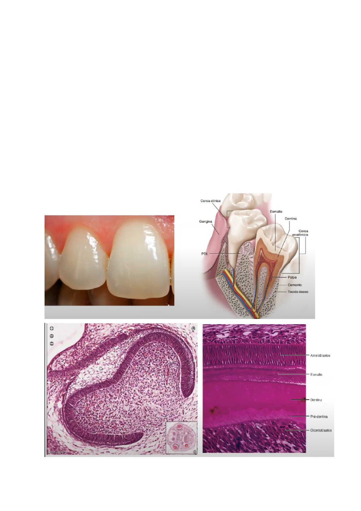 Amelogênes� ➔ É a formação do esmalte dentário ➔ É o tecido mais mineralizado do organismo (97% de origem inorgânica) ➔ Recobre a coroa do dente ➔ Porção coronária (parte para fora do dente) e radicular (envolve alvéolo do dente) ➔ Origem ectodérmica (epitelial do órgão do esmalte ➔ Secretado por tecidos especializados (primeiro matriz orgânica) ➔ Será tecido acelular ➔ Não está na raiz ➔ Ameloblastos - Secretam esmalte Composição do esmalte dentário ➔ Parte inorganica (97%) ➔ Cristais de fosfato e cálcio Ca10(PO4)6(OH)2 (hidroxiapatita) ➔ Carbono, sódio, magnésio, cloreto, potássio e flúor. ➔ É quem dá dureza Parte orgânica (1%) ➔ Basicamente proteica, escassos carboidratos e lipídios ➔ Amelogeninas, não-amelogeninas (enamelina e tufelina) Água (2%) Esmalte é um tecido friável ➔ Seria extremamente quebradiço se não tivesse um tecido mais resiliente, subjacente que é a dentina ➔ Reduz possibilidade de fratura ➔ Dentina e esmalte intimamente relacionados ➔ Esmalte é translúcido Quanto maior grau de mineralização do esmalte, maior a natureza cristalina e translucidez ➔ Influencia na cor do dente (para não ver a cor amarelada do dente). Obs: dente de leite é mais branco, pois há menor mineralização e vê pouco a dentina Desenvolvimento ➔ Ameloblastos passam por diversas fases ➔ É processo gradual Fase morfogenética ➔ Início do estágio de campânula (menos proliferação) ➔ Dobras do epitélio interno → forma da coroa dentária ➔ Forma do dente começa a ser determinada ➔ Epitélio interno – células cúbicas, núcleo central ou próximo a lâmina basal ➔ Organelas poucos desenvolvidas (mais próximas ao pólo superior perto do retículo estrelado) Fase de diferenciação ➔ Células se tornam capazes de secretar esmalte ➔ O formato das células deixam de ser cúbicas para se alongar (Cilíndricas + altas) e núcleo inverte a polaridade (lado oposto a papila dentária) ➔ Organelas também invertem polo (para perto da papila) ➔ Complexo de G. e retículos mais desenvolvidos ➔ Pré-ameloblastos: ainda não secretam esmalte, mas sinalizam para células da periferia da papila para se diferenciar em odontoblastos. ➔ Fenômeno da indução recíproca ➔ Secreção de enzimas do lisossomo que degradam a lâmina basal que está entre as células. ➔ Posteriormente pré-ameloblastos se tornam ameloblastos. Fase secretora ➔ Processo de secreção do esmalte (fase de coroa) ➔ Início da amelogênese propriamente dita ➔ Superfície distal dos ameloblastos inicialmente plana, com curtas protusões ➔ Organelas características de células secretora (vesículas, complexo de golgi, RE) ➔ Vesículas de proteínas nas protrusões que ajudarão a secretar ➔ Esmalte secretado sobre dentina do manto (após degradação da lâmina basal) Matriz orgânica (1%) ● Amelogeninas (possui 2 grandes grupos) ● não amelogeninas (enamelina, tufelina, amelina, bainhalina, amelotina, apina) Matriz inorgânica (97%) ● Cristais de fosfato de cálcio (hidroxiapatita), carbono, sódio, magnésio, cloreto, potássio e flúor. - Proteínas de matriz de natureza não colágena - Origem não conjuntiva do esmalte, mas sim epitelial ➔ Mineralização começa quase imediatamente após início da secreção da matriz orgânica ➔ Contato direto com dentina do manto ➔ Esmalte secretado em direção centrífuga ➔ Mineralização ➢ Acontece após início da secreção de matriz orgânica, ➢ Primeiros cristais mineral (Hidroxiapatita) desencadeiam o processo em associação com componente do esmalte (ex: Enamelina) ➢ Enamelina tem contato com colágeno da dentina do manto → favorece a nucleação de mineral no esmalte ➢ Tufelina também pode auxiliar na nucleação de mineral → orientam formação dos cristais em forma de fita ➢ Nanosfera de amelogeninas alinhadas em forma helicoidal (favorece crescimento) ➢ Depositados em contato direto com a dentina do manto em mineralização ➢ Esmalte não tem vesícula de matriz, diferente da dentina ➔ Após deposição de delgada camada aprismática, os ameloblastos desenvolvem processo de Tomes 1. Esmalte aprismática (não tem formato) 2. Se afastam e formam processo cônico (processo de tomes) 3. Nova fase de deposição a partir das deformações e cristais emitidos (formam esmalte prismático - maior parte do esmalte) Face mais plana: secretora Face N (côncava): Não secretora Processo de tomes: orientação do esmalte em formação (S e N) Deposição de esmalte prismático continua até formação final de esmalte (ameloblasto se diferencia e volta a ter apenas pequenas projeções, sem tomes) Final da fase secretora: ● Ausência do processo de tomes ● Camadas do esmalte aprismático superficial ● Toda fase ocorre no órgão do esmalte ● Vai diminuindo outros componentes do órgão do esmalte (involução) ● Esmalte produzido gradativamente até chegar na alça cervical quando finaliza Fase de maturação - pré-irruptiva ➔ Redução da altura dos ameloblastos (cilíndricas baixas, superfície distal lisa ou ondulada) ➔ Eventos cíclicos: remoção dos elementos orgânicos e influxo de íons ➔ Crescimento rápido dos cristais de mineral ➔ Redução de amelogeninas ➔ Aumento do componente mineral ➔ Também ocorre de modo centrífugo (início na JAD) ➔ Na fase de maturação, células têm superfícies distais lisas e menor altura. Fase de proteção ➔ Esmalte perde sua ondulação, se tornando mais lisa e células ainda menor ➔ Colapso do órgão do esmalte ➔ Estabelecimento do epitélio reduzido (reveste coroa do dente, até ele irromper na cavidade oral e irá contribuir para formação do epitélio juncional) Maturação pós-irruptiva ➔ após dente irromper e com avançar da idade ocorrem modificações estruturais e químicas do esmalte ➔ Perde água ➔ Diminuição no conteúdo orgânico 