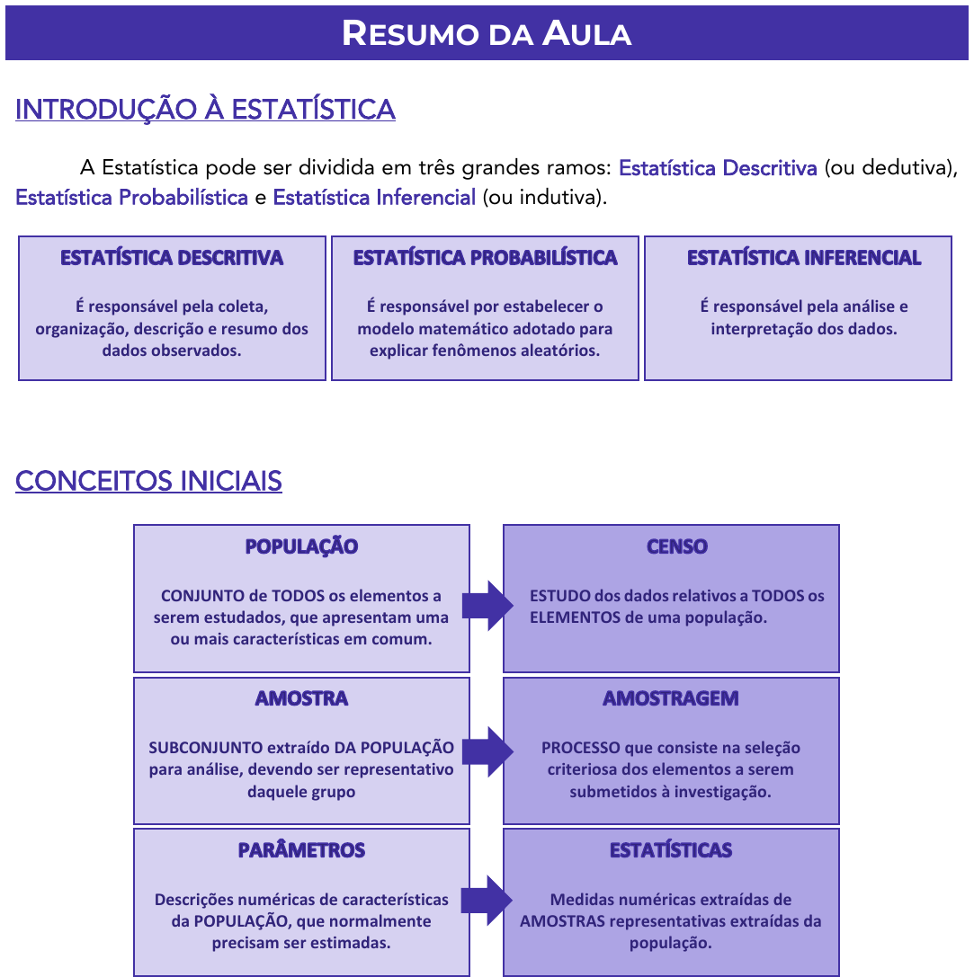 RESUMO DA AULA INTRODUÇÃO À ESTATÍSTICA A Estatística pode ser dividida em três grandes ramos: Estatística Descritiva (ou dedutiva), Estatística Probabilística e Estatística Inferencial (ou indutiva). CONCEITOS INICIAIS É responsável pela coleta, organização, descrição e resumo dos dados observados. É responsável pela análise e interpretação dos dados. É responsável por estabelecer o modelo matemático adotado para explicar fenômenos aleatórios. CONJUNTO de TODOS os elementos a serem estudados, que apresentam uma ou mais características em comum. ESTUDO dos dados relativos a TODOS os ELEMENTOS de uma população. PROCESSO que consiste na seleção criteriosa dos elementos a serem submetidos à investigação. SUBCONJUNTO extraído DA POPULAÇÃO para análise, devendo ser representativo daquele grupo Medidas numéricas extraídas de AMOSTRAS representativas extraídas da população. Descrições numéricas de características da POPULAÇÃO, que normalmente precisam ser estimadas. 12010637798 - Igrezio Ramos da Cruz MÉTODO EXPERIMENTAL X MÉTODO ESTATÍSTICO DADOS ESTATÍSTICOS Com relação ao número de observações coletadas, os dados são classificados em univariados, bivariados ou multivariados: Quanto à forma de apresentação, os dados podem ser classificados em dados brutos ou rol. As CAUSAS são mantidas CONSTANTES, COM EXCEÇÃO DE UMA, que é VARIADA para que seus efeitos sejam descobertos. Admite e REGISTRA TODAS AS POSSÍVEIS VARIAÇÕES DAS CAUSAS PRESENTES, procurando determinar a influência de cada fator no resultado. É quando uma única observação de cada indivíduo é registrada. É quando mais duas observações acerca de cada indivíduo são registradas É quando duas observações de cada indivíduo são registradas. São aqueles que não foram numericamente organizados em ordem crescente ou decrescente, ou seja, estão na forma como foram coletados. É a organização dos dados brutos em ordem de grandeza crescente ou decrescente. 12010637798 - Igrezio Ramos da Cruz VARIÁVEIS ESTATÍSTICAS As variáveis estatísticas podem ser classificadas, inicialmente, em duas categorias: qualitativas e quantitativas. Variáveis Qualitativas Quantitativas Ordinais Nominais Discretas Contínuas Os resultados obtidos não podem ser ordenados/hierarquizados. Ex: cor dos olhos; esporte praticado. Os resultados obtidos podem ser ordenados/hierarquizados. Ex: nível de escolaridade. Os possíveis valores formam um conjunto finito ou enumerável; resultam de contagem. Ex: número de leitos por cidade; idade. Os possíveis valores formam um intervalo de números reais; resultam de mensuração. Ex: peso; altura. 12010637798 - Igrezio Ramos da Cruz SÉRIES ESTATÍSTICAS As séries estatísticas podem ser classificadas em: temporais, geográficas, específicas ou mistas: Séries Temporais Específicas Também chamadas de HISTÓRICAS ou EVOLUTIVAS. Geográficas Mistas Também chamadas de ESPACIAIS ou de LOCALIZAÇÃO. Também chamadas de CATEGÓRICAS. Combinação de duas ou mais séries. Tabelas de dupla entrada Se for uma série mista de FATO e TEMPO, denominaremos de série específico-temporal. Se tivermos uma série mista de LOCAL e TEMPO, denominaremos de série geográfica-temporal. Enquanto o TEMPO varia, o fato investigado e o local permanecem constantes. Enquanto o LOCAL varia, o fato investigado e o tempo permanecem constantes. Enquanto o FATO investigado varia, a época e o local permanecem constantes. 12010637798 - Igrezio Ramos da Cruz DISTRIBUIÇÃO DE FREQUÊNCIAS As distribuições de frequências podem ser classificadas em dois tipos: distribuição de frequências pontual (ou discreta) e distribuição de frequências intervalar (ou contínua). Elementos de uma Distribuição de Frequências Item Definição Símbolos e Fórmulas Número de Classes As classes são os intervalos nos quais o fenômeno é subdividido. 𝑘 = 1 + 3,3 × 𝑙𝑜𝑔 𝑛 𝑘 = √𝑛 Limites de Classe Correspondem aos valores extremos. 𝑙𝑖𝑛𝑓 e 𝑙𝑠𝑢𝑝 Amplitude de um Intervalo de Classe Distância entre os limites inferiores (ou superiores) de classes consecutivas. ℎ = 𝑙𝑠𝑢𝑝 − 𝑙𝑖𝑛𝑓 Amplitude total Diferença entre o limite superior da última classe (limite superior máximo) e o limite inferior da primeira classe (limite inferior mínimo). 𝐴𝑇 = 𝑙𝑚á𝑥 − 𝑙𝑚í𝑛 𝐴𝑇 = ℎ × 𝑘 Ponto Médio Média aritmética simples dos valores extremos de uma classe. 𝑃𝑀 = (𝑙𝑖𝑛𝑓 + 𝑙𝑠𝑢𝑝) 2 𝑃𝑀 = 𝑙𝑖𝑛𝑓 + ℎ 2 𝑃𝑀 = 𝑙𝑠𝑢𝑝 − ℎ 2 Frequência Absoluta Simples Número de observações correspondentes a uma determinada classe ou a um determinado valor. 𝑓𝑖 São apresentados todos os dados coletados juntamente com suas respectivas frequências, não havendo perda de valores. É agrupamento os valores por intervalos de classe. 12010637798 - Igrezio Ramos da Cruz Frequência Absoluta Acumulada Total das frequências de todos os valores inferiores ao limite superior do intervalo de uma dada classe 𝑓𝑎𝑐𝑖 = 𝑓1 + 𝑓2 + 𝑓3 + ⋯ + 𝑓𝑖 Frequência Relativa Simples Proporção de dados existentes em uma determinada classe. 𝐹𝑖 = 𝑓𝑖 ∑ 𝑓𝑖 = 𝑓𝑖 𝑛 Frequência Relativa Acumulada Proporção de valores inferiores ao limite superior do intervalo de uma dada classe. 𝐹𝑎𝑐𝑖 = 𝐹1 + 𝐹2 + 𝐹3 + ⋯ + 𝐹𝑖 Densidade de Frequência Quociente entre a frequência da classe (absoluta ou relativa) e sua amplitude 𝑑 = 𝑓 ℎ REPRESENTAÇÕES GRÁFICAS DAS DISTRIBUIÇÕES DE FREQUÊNCIA Gráfico Definição O gráfico de hastes ou bastões é muito utilizado para representar dados não agrupados em classes, o que normalmente ocorre com dados discretos. O histograma é um gráfico destinado a representar dados agrupados em classe, sendo composto por um conjunto de retângulos contíguos 