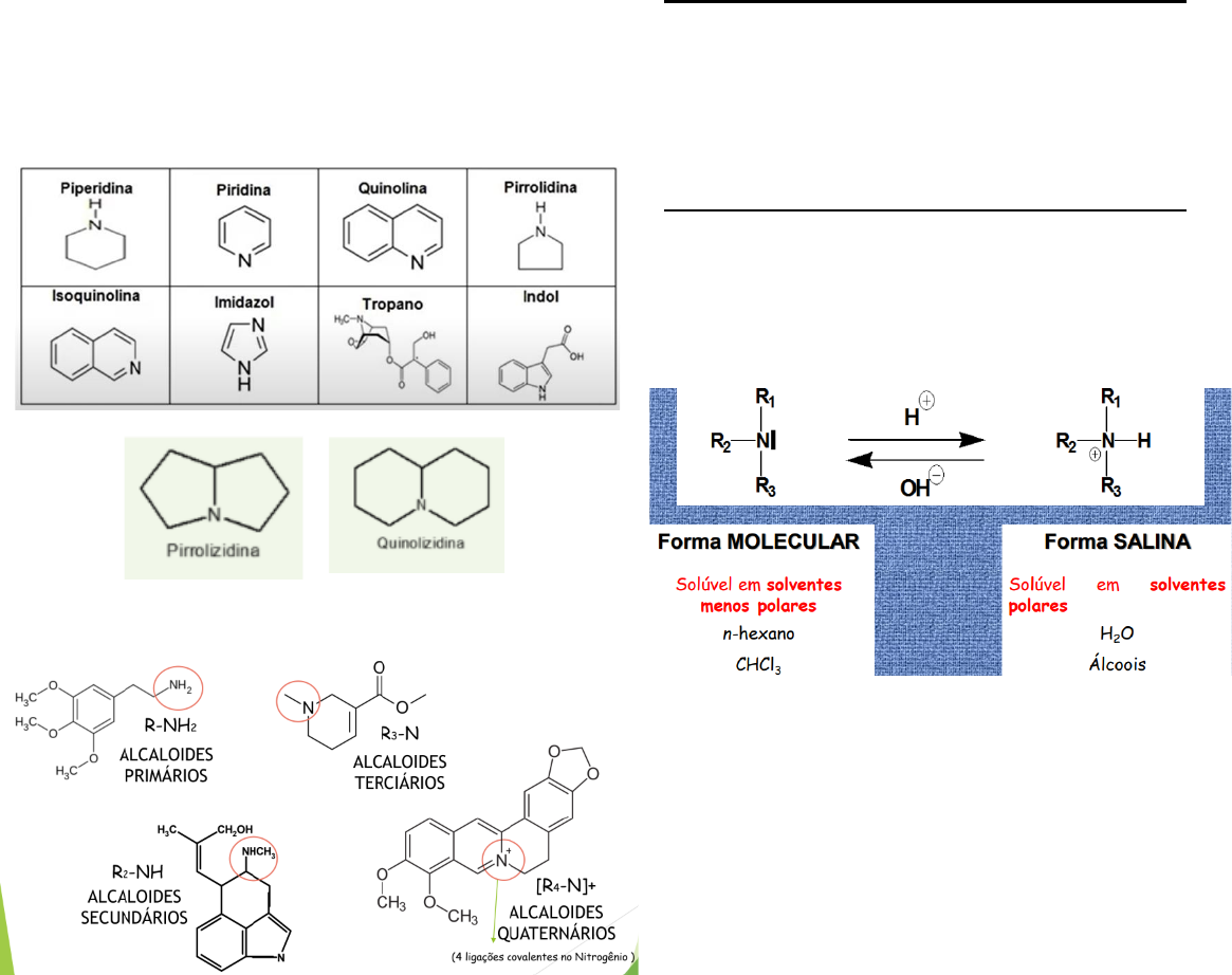 ALCALOIDES São compostos orgânicos nitrogenados, de origem vegetal, farmacologicamente ativos, sendo na maioria tóxicos, encontrados predominantemente em angiospermas. Possuem caráter geralmente alcalino (bases fracas), com algumas poucas exceções. São substâncias orgânicas cíclicas, contendo um átomo de nitrogênio em um estado de oxidação negativo e cuja distribuição é limitada entre os seres vivos. • Classificação química > Com base no núcleo heterocíclico > Com base na substituição do N Os alcaloides por serem moléculas grandes e orgânicas em geral possuem baixa solubilidade em água (polar) e mais em solventes apolares, mas nos alcaloides quaternários por fazerem essas quatro ligações, acabam ficando carregado e com isso aumenta sua solubilidade. • Classificação Biossintética > Alcaloides verdadeiros - Oriundos de aminoácidos. Possuem um átomo de nitrogênio em um anel heterocíclico. Eles são divididos em vários grupos, de acordo com o tipo de anel. > Pseudoalcaloides - São compostos cujo átomo de nitrogênio pode ou não estar em anel heterocíclico, mas que não se originam de aminoácidos. > Protoalcaloides - simples, que possuem um átomo de nitrogênio não pertencente a um anel heterocíclico. - Aminas são subs orgânicas que apresentam um ou mais radicais ligados ao N e são muito utilizadas na produção de outros comp. orgânicos. Aminas são comp. orgâ. nitrogenados que derivam da substância amônia (NH3) pela substituição de um ou mais hidrogênios por radicais orgânicos. • Características físico-químicas > Solubilidade – está relacionada com a forma em que se encontram, sendo ela forma molecular e forma salina (forma protonada). A forma molecular possui um coeficiente de partição lipídio:água maior, com isso, aumenta a permeabilidade nas membranas celulares, isso no ponto de vista farmacológico é interessante, pois a seletividade no caso do SNC na membrana hematoencefálica. • Reativos gerais (metálicos) para a detecção e caracterização dos alcaloides o Reativo de Bouchardat ou Wagner - solução de iodo e iodeto de potássio o Reativo de Mayer- solução de iodeto de potássio e cloreto de mercúrio o Reativo de Dragendorff- solução de iodeto de potássio e subnitrato de bismuto o Reativo de Bertrand - solução de ácido sílico-túngstico o Reativo de Hager - solução saturada de ácido pícrico *Podem apresentar falso-positivos (ex.: com proteínas, purinas, alfa-pironas, algumas cumarinas, hidroxi-fenois, lignanas...)