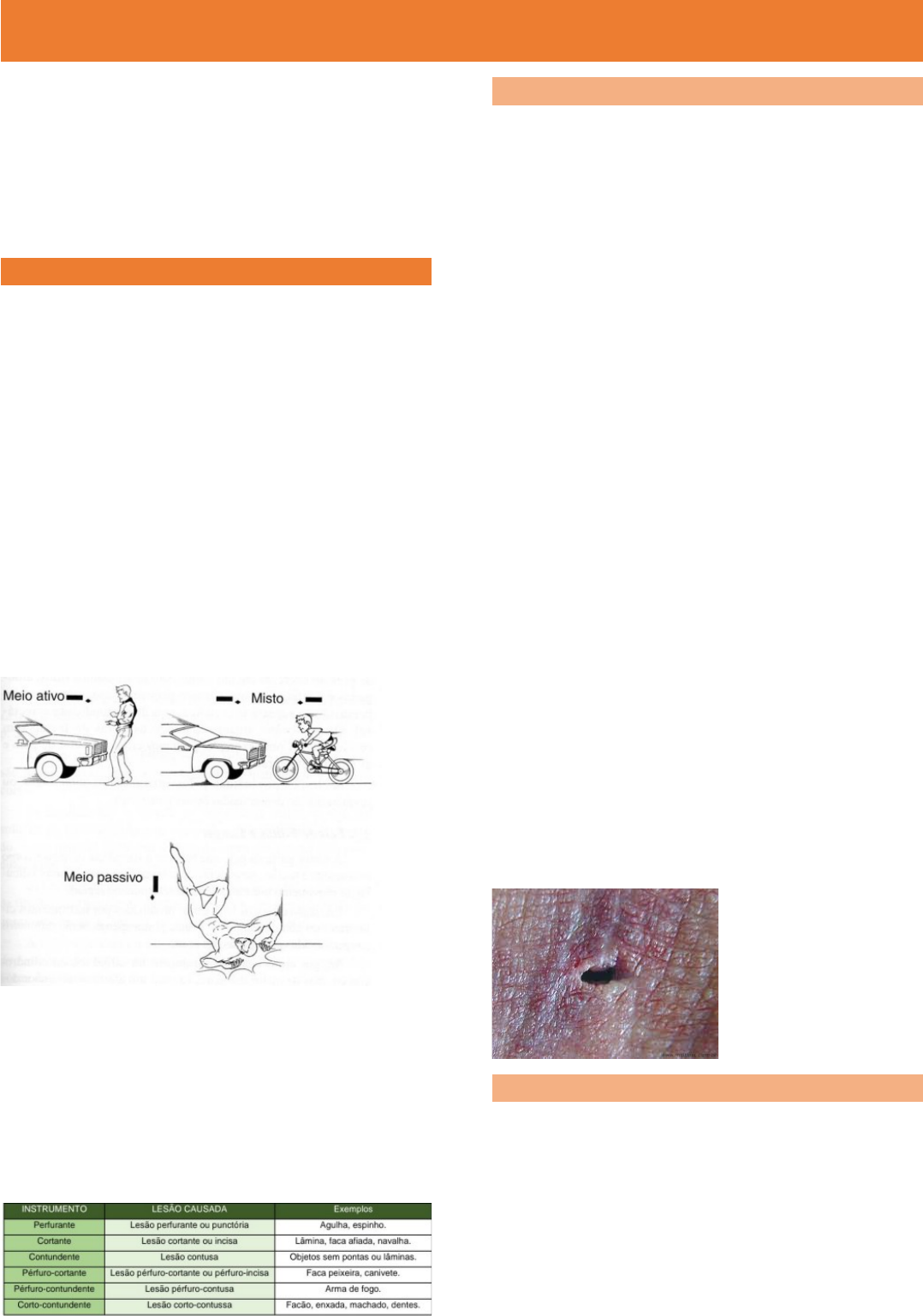 TRAUMATOLOGIA FORENSE AUTOR: PEDRO V.F. MEDRADO - É a área que estuda as lesões corporais resultantes de traumatismos de ordem material ou moral, danosos ao corpo ou à saúde física ou mental. - Princípios de Borri – energia de ordem mecânica, ordem física, ordem físico-química, ordem química, ordem bioquímica, ordem biodinâmica e mista. ENERGIA DE ORDEM MECÂNICA - Agentes que atuam pela energia mecânica, que modifica o estado inercial (repouso ou inercia) de um corpo em agente agressor, o que produz lesões. · Modificações do estado de repouso ou movimento, um instrumento ou meio é o causador da lesão. - Meio ativo · Instrumento em movimento e corpo repouso, exemplo do atropelamento - Meio misto – ambos em movimento, exemplo do ciclista em movimento é atropelado - Meio passivo – instrumento em repouso, corpo em movimento, exemplo da queda. - Instrumento e tipo de lesão · Perfurante – perfurante ou punctória · Cortante – lesão cortante ou incisa · Contundente – contusa · Perfurocortante · Perfuro-contudente · Corto-contundente Instrumento perfurante - Corpo longo, delgado e ponta aguçada · Tais como – aguda, espinho, furador de gelo, garfo e etc · É uma lesão que predomina a profundidade sobre o diâmetro · Forma de “casa de botão” ou de quadrilátero em instrumentos perfurantes de médio calibre - Instrumento perfurante de médio calibre · Primeira lei de filhos – formato da lesão assume um aspecto de “casa de botão” · “Imagem de um rapaz com uma flechada/arpão na mão” · Segunda lei de filhos – região com linhas de forças iguais o sentido do maior eixo é igual · Na mesma região, o maior eixo das feridas estará orientado no mesmo sentido das fibras musculares subjacentes. · Lei de Langer – linhas de força diferentes, aspecto de seta triangular ou quadrilátero. · Na confluência de regiões de linhas de forças diferentes, a extremidade da lesão toma o aspecto de ponta de seta, de triângulo, ou mesmo de quadrilátero. - Característica da Lesão – forma, dimensão, localização e sinais específicos Instrumento cortante - Característica da lesão · Predomínio do comprimento sobre as outras duas dimensões · Forma elíptica ou casa de botão · Hemorragia grande · Cauda de escoriação – serve para identificar a direção do ferimento, como em suicídios - Exemplos – lâmina de barbear, navalha, faca afiada e etc. - Casos específicos · Lesões de defesa – em região de antebraço, mãos e costas (posição de defesa). Isso é importante para caracterizar se a vítima teve ou não chance de defesa. · Esgorjamento – não há separação da cabeça do corpo, mas ocorre em região anterior do pescoço. · Degolamento – não separa a cabeça do corpo, mas ocorre em região posterior do pescoço. · Decapitação – separa a cabeça do corpo · Incisão – é uma ferida provocada por um ato operatório, não é dita ferida cortante Instrumento contundente - Instrumento que não possui pontas ou lâminas, a lesão é mais superficial que profunda. - As lesões podem ser abertas ou fechadas - Tendem a ser lesões multiformes – pois atuam por explosão, pressão, distensão, descompressão, arrastamento e etc. - Tipos de lesões · Rubefação – lesão de natureza transeunte, para ser caracterizada deve se registrada no momento do aparecimento. · Exemplo – tapa no rosto · Escoriação – atinge a epiderme, com importância médico-legal: tempo de produção (algumas horas depois há formação de solução de drenagem), forma da escoriação, sede da lesão e número de lesões. Não deixa marcas · Equimose – ocorre o rompimento de vasos e derrame sanguíneo infiltrando os tecidos. · Puntiforme (sugilação – pontos), Estrias alongadas e paralelas (víbices, exemplo de feridas por arranhadura) e manchas disformes · Edema traumático · Hematoma · Ferimento contuso – múltiplas formas e variações, onde o agende promove a perda de integridade da pele ou vence a sua elasticidade. · Luxação – sofre um movimento anômalo, mas que não retorna ao estado natural. · Quando parcial é subluxação, quando total é a dita luxação. · Entorse – sofre um movimento anômalo, mas retorna - Espectros equimóticos de Legrand Du Salle – é importante para caracterizar se o tempo de lesão é compatível com a queixa do sujeito. Os grupos como crianças (mais acelerado), idosos (mais lentificado), conjuntiva (mais avermelhado) e cadáver não respeitam esse instrumento · 1-2º dia – vermelho a vermelho-violácea · 3-6º dia – azulada · 7-12º dia – esverdeada · 13º-20º dia – amarelada - Espectro equimótico de Le Grand · Vermelho violácea – hemoglobina · Azulada – hemossiderina · Verde – hematoidina · Amarelo – hematina - Edema traumático – desaparece em torno de 243 horas - Hematoma – reabsorção mais demorada que as equimoses - Bossa sanguínea – específica para o trauma do canal de parto (importante para perícia do aborto/infanticídio) Instrumento Perfuro-cortante - Lesões com predomínio da profundidade - Forma de ângulo agudo + extremidade romba ou casa de botão – causada por instrumentos dotado de ponta (perfurante) na extremidade de uma lâmina portadora de um ou mais gumes (ação cortante). · Forma de coxinha · As soluções de continuidade produzidas por instrumentos de um só gume resultam em ferimentos em forma de botoeira com uma fenda regular, e quase sempre linear, com um ângulo agudo e outro arredondado. - Exemplos (objetos que somam as ações perfurante e cortante) – faca peixeira, canivete, punhal e etc · Faca – típico instrumento não amolado causa um lado cortante e outro rombo. Instrumento Perfuro-contundente - Arma de fogo – o exemplo mais característico · Depende de características como a distância e o tipo do projetil · Raias – reentrâncias e saliências para permitir estabilidade ao tiro