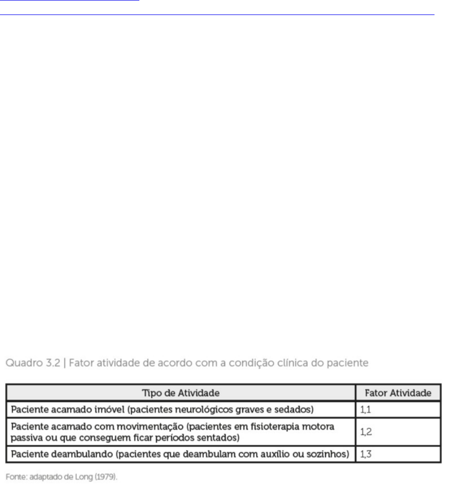 Cálculos de Nutrição Enteral ISAX Residência - Concursos para nutricionista - Terapia Nutricional Enteral e Parenteral O cálculo do Gasto Energético Basal (GEB), que é o mínimo de energia necessária para manutenção dos processos corporais vitais, como manutenção da temperatura corporal, metabolismo celular, atividade glandular e processos de respiração e circulação, pode ser realizado por diversos métodos, porém, a antiga (1919) e ainda útil fórmula de Harris-Benedict para estimar essas necessidades demonstrou ter acurácia geral de 61%, ou seja, predizer entre 90 a 110% do GEB comparados à calorimetria indireta padrão ouro, sendo o método mais utilizado no ambiente hospitalar. O GEB é calculado por meio das equações a seguir, que levam em consideração o gênero, o peso, a altura e a idade do paciente. • Homens: 66,5 + (13,7 x P) + (5 x A) – (6,8 x I) • Mulheres: 665 + (9,6 x P) + (1,7 x A) – (4,7 x I) Onde: P = peso em kg; A = altura em cm; I = idade em anos. A partir do resultado do GEB, pode-se calcular o gasto energético total (GET), que corresponde à energia gasta por um indivíduo em 24 horas, por meio da fórmula: GET= GEB x FA x FI x FT, Onde: FA = fator atividade; FI = fator injúria; FT = fator térmico. Exemplo: Um paciente cujo GEB seja 1.300 kcal/dia, que deambula, que esteja internado devido a uma cirurgia para retirada de um tumor na mama e que apresenta temperatura corporal de 38 °C terá um GET de 2.044,9 kcal/dia, conforme cálculo a seguir: • GET = GEB x FA x FI x FT • GET = 1300 x 1,3 x 1,1 x 1,1 • GET = 2044,9 kcal/dia Exemplo: Para realizar a estimativa calórica diária de um paciente de 65 Kg com politraumatismo, deve-se multiplicar o valor da estimativa calórica correspondente à condição clínica deste paciente, que é de 40 kcal/ kg, pelo seu peso atual de 65 kg. Sendo assim, 40 x 65 = 2.600, então 2.600 kcal/dia é a necessidade energética estimada através da fórmula de bolso para este paciente. Carboidratos: Representa de 50 a 60% da estimativa calórica ou, no mínimo, 130 g ao dia, não devendo ultrapassar 7 g/kg/dia. Proteína: A recomendação de proteínas para pacientes sem estresse metabólico ou falência de órgãos é de 10-15% da estimativa calórica ou 0,8-1,0 g/kg/dia. Para pacientes com estresse metabólico, a recomendação é de 1,0-2,0 g/kg/dia, dependendo de sua condição clínica. Já para pacientes críticos, a quantidade de proteína sugerida é de 1,2-2,0 g/kg/dia e,pode ser ainda mais elevada em pacientes grandes, queimados e politraumatizados Lipídios: Sua recomendação é de 20-35% da estimativa calórica, não devendo ultrapassar 2,5 g/ kg/dia, para minimizar o risco de complicações metabólicas A ingestão adequada de ácidos graxos linoleico é de 10-17 g/dia, que representa 2-4% da estimativa calórica, e de alfa -linolênico é de 0,9-1,6 g/dia, que representa 0,25-0,5 % da estimativa calórica. Em pacientes graves, a recomendação máxima de lipídios via venosa é de 1 g/kg/dia O paciente obeso é muito suscetível à desnutrição, principalmente proteica, com perda de massa muscular, porque a obesidade já é um estado de resistência insulínica e a mobilização de gordura como substrato energético também é mais difícil na obesidade. De acordo com a condição clínica de Luiz, que é um paciente queimado, a A estimativa calórica diária é de 40 kcal/kg. • Aplicando os dados de Luiz à fórmula, sua necessidade energética será: 40 x 71= 2840,0 kcal/dia • A recomendação de proteínas para pacientes com estresse metabólico é de 1,0- 2,0 g/kg/dia. • No caso de Luiz, devido à sua condição clínica, o ideal é ofertar a recomendação máxima de 2,0 g/kg/dia. • Agora, para calcular sua necessidade proteica diária, basta multiplicar 2,0 g x 71 kg, que resultará em 142 g de proteína ao dia. . Complicações gastrintestinais: são as mais habituais, dentre elas estão diarreia, distensão abdominal, náuseas e vômitos. Complicação mecânica: A obstrução da sonda nasoenteral, que pode ser causada por resíduos de alimentos ou acúmulo de medicamentos Complicações metabólicas: são menos frequentes, especialmente quando são utilizadas fórmulas poliméricas, no entanto, quando relatadas, são mais comuns os casos de hipercalemia, hiperglicemia e hipofosfatemia. Complicação infecciosa: A gastroenterocolite por contaminação microbiana durante o preparo e administração da fórmula. Complicações psicológicas: estão relacionadas ao desconforto da presença da sonda nasoenteral, que interfere na sociabilidade e inatividade do paciente, deixando-o deprimido e ansioso. Complicação respiratória: Pneumonia aspirativa ela está relacionada com a exagerada oferta de dieta íleo paralítico e retardo do esvaziamento gástrico. Carboidratos: De acordo com a ASPEN, é recomendado ≤7g/kg de peso/dia para pacientes estáveis e, de acordo com a ESPEN, o recomendado para pacientes críticos é de ≥2g/kg de peso/dia. Lipídeos: De acordo com a ASPEN, é recomendado ≤2,5g/kg de peso/dia para pacientes estáveis e, de acordo com a ESPEN, o recomendado para pacientes críticos é de 0,7- 1,5g/kg de peso/dia. De acordo com as diretrizes atuais (ESPEN, ASPEN), a suplementação da dieta parenteral com glutamina é altamente recomendada. Além disso, os aminoácidos devem sempre ser co- administrados com glicose para evitar desperdício de aminoácidos para a produção de glicose endógena. De acordo com as recomendações indicadas para o primeiro dia de realimentação, é aconselhado iniciar com o aporte de 600 kcal/dia, as necessidades médias de líquidos devem ser de 1200-1800 ml/dia. A suplementação profilática de eletrólitos, sais minerais e oligoelementos devem ser de 100% da ingestão dietética recomendada é de 200% para vitaminas. VÍDEOS: Vídeo explicativo para dieta parenteral: https://www.youtube.com/watch?v=Fp3umbMtkE4 Vídeo