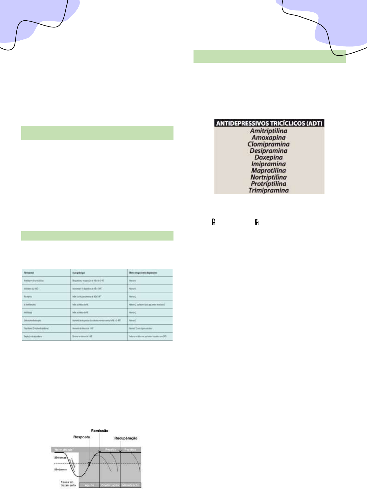 Carla Bertelli – 5° Período Mecanismo de Ação dos Antidepressivos Mecanismo de Ação dos Antidepressivos Depressão – Distúrbio Afetivo leve ou grave. É um dos mais frequentes presente na sociedade. Distúrbio Heterogêneo = Sintomas Centrais + Condições Psiquiátricas Sintomas Emocionais e Sintomas Biológicos Teorias da Depressão Teoria das Monoaminas – Transmissão monoaminérgica funcionalmente deficiente. Mecanismos Neuroendócrinos – Células Hipotalâmicas -> CRH -> ACTH – depressão com aumento do Cortisol (estresse crônico) Efeitos Tróficos e Neroplasticidade Mecanismo de Ação dos Antidepressivos Potencialização das ações de Norepinefrina, Serotonina e Dopamina. Alterações Imediatas X Efeitos Tardios? Os efeitos dos antidepressivos acontecem de maneira tardia, geralmente em 4 semanas. Por mais que ocorram alterações imediatas, mas os efeitos são tardios devido a necessidade de uma neuroadaptação neurológica para que ocorra a melhora clínica. Antidepressivos Tricíclicos Inibem a captação de Norepinefrina e Serotonina no neurônio pré-sináptico, além de bloquear os receptores serotoninérgicos, bloquear os receptores alfa- adrenérgicos, bloquear receptores histamínicos e muscarínicos Mecanismo de Ação Inibic o da captac o do neurotransmissor: Os ADTs e a amoxapina são inibidores potentes da captação neuronal de norepinefrina e serotonina no terminal nervoso pré-sináptico. Maprotilina e desipramina são inibidores relativamente seletivos da captação de norepinefrina Bloqueio de receptores: Os ADTs também bloqueiam os receptores serotoninérgicos, α- adrenérgicos, histamínicos e muscarínicos. Ainda não se sabe se alguma dessas ações é responsável pelo benefício terapêutico dos ADTs. Contudo, as ações nesses receptores provavelmente são responsáveis por muitos dos seus efeitos adversos. A amoxapina também bloqueia os receptores 5-HT2 e dopamina D2. No momento, os ADTs são usados principalmente na depressão que não responde aos antidepressivos de uso mais comum, como os ISRSs ou os IRSNs. Sua perda de popularidade provém, em grande parte, de sua tolerabilidade relativamente menor em comparação com agentes mais recentes, da dificuldade de seu uso e de sua letalidade em superdosagem. Outras aplicações dos ADTs incluem o tratamento de distúrbios de dor, enurese e insônia Efeitos Adversos – O bloqueio dos receptores muscarínicos leva a visão turva, xerostomia, retenção Carla Bertelli – 5° Período urinária, taquicardia sinusal, constipação e agravamento do glaucoma de angulo fechado Ações: Os ADTs melhoram o humor e o alerta mental, aumentam a atividade física e reduzem a preocupação mórbida de 50 a 70% dos indivíduos com depressão. O início da melhora do humor é lento, necessitando de 2 semanas ou mais A resposta do paciente pode ser usada para ajustes da dosagem. Após a resposta terapêutica, a dosagem pode ser reduzida gradualmente para melhorar a tolerância, a menos que ocorra recaída. Dependência física e psicológica raramente foram registradas. Exige a retirada lenta para minimizar a síndrome de descontinuação e os efeitos colinérgicos de rebote Indicações: Os ADTs são eficazes no tratamento de depressão moderada e grave. Alguns pacientes com transtorno de pânico também respondem aos ADTs. A imipramina tem sido usada para controlar a enurese em crianças com mais de 6 anos; contudo, tem sido amplamente substituída por desmopressina e tratamentos não farmacológicos (alarmes de enurese). Os ADTs, particularmente a amitriptilina, têm sido usados para auxiliar a prevenção da enxaqueca e tratar síndromes de dor crônica (p. ex., dor neuropática), em inúmeras condições em que a causa da dor é desconhecida. Dosagens baixas de ADT, especialmente doxepina, podem ser usadas contra insônia. Inibidores da Monoaminoxidase Inibidores da Enzima MAO – enzima mitocondrial que está envolvida na degradação das monoaminas. A monoaminoxidase (MAO) é uma enzima mitocondrial encontrada em nervos e outros tecidos, como fígado e intestino. No neurônio, a MAO funciona como “válvula de segurança”, desaminando oxidativamente e inativando qualquer excesso de neurotransmissor (norepinefrina, dopamina e serotoni- na) que possa vazar das vesículas sinápticas quando o neurônio está em repouso. O IMAO pode inativar reversível ou irreversivelmente a enzima, permitindo que as moléculas do neurotransmissor fujam da degradação e, as- sim, se acumulem dentro do neurônio pré-sináptico e vazem para o espaço sináptico. Mecanismo de Ação: A maioria dos IMAOs, como a fenelzina, forma complexos estáveis com a enzima, causando inativação irreversível. Isso resulta em aumento dos estoques de norepinefrina, serotonina e dopamina no interior dos neurônios e subsequente difusão do excesso de neurotransmissor para a fenda sináptica. Esses fármacos inibem a MAO não só no cérebro, mas também no fígado e no intestino, onde catalisam desaminações oxidativas de fármacos e substa ̂ncias potencialmente tóxicas, como a tiramina, que é encontrada em certos alimentos. Por isso, os IMAOs mostram elevada incidência de interações com fármacos e com alimentos. A selegilina administrada na forma de Carla Bertelli – 5° Período adesivo transdérmico pode produzir menor inibição da MAO hepática e intestinal em dosagens baixas, porque se evita a biotransformação de primeira passagem. Embora a MAO esteja completamente inibida após alguns dias de tratamento, a ação antidepressiva dos IMAOs, como a dos ISCSs, ICSNs e ADTs, é retardada em várias semanas. A selegilina e a tranilcipromina apresentam efeito estimulante tipo anfetamina, o qual pode causar agitação e insônia. Indicação: Os IMAOs são indicados para pacientes deprimidos que não respondem ou são alérgicos aos ADTs ou que apresentam forte ansiedade. Uma subcategoria especial de depressão, den