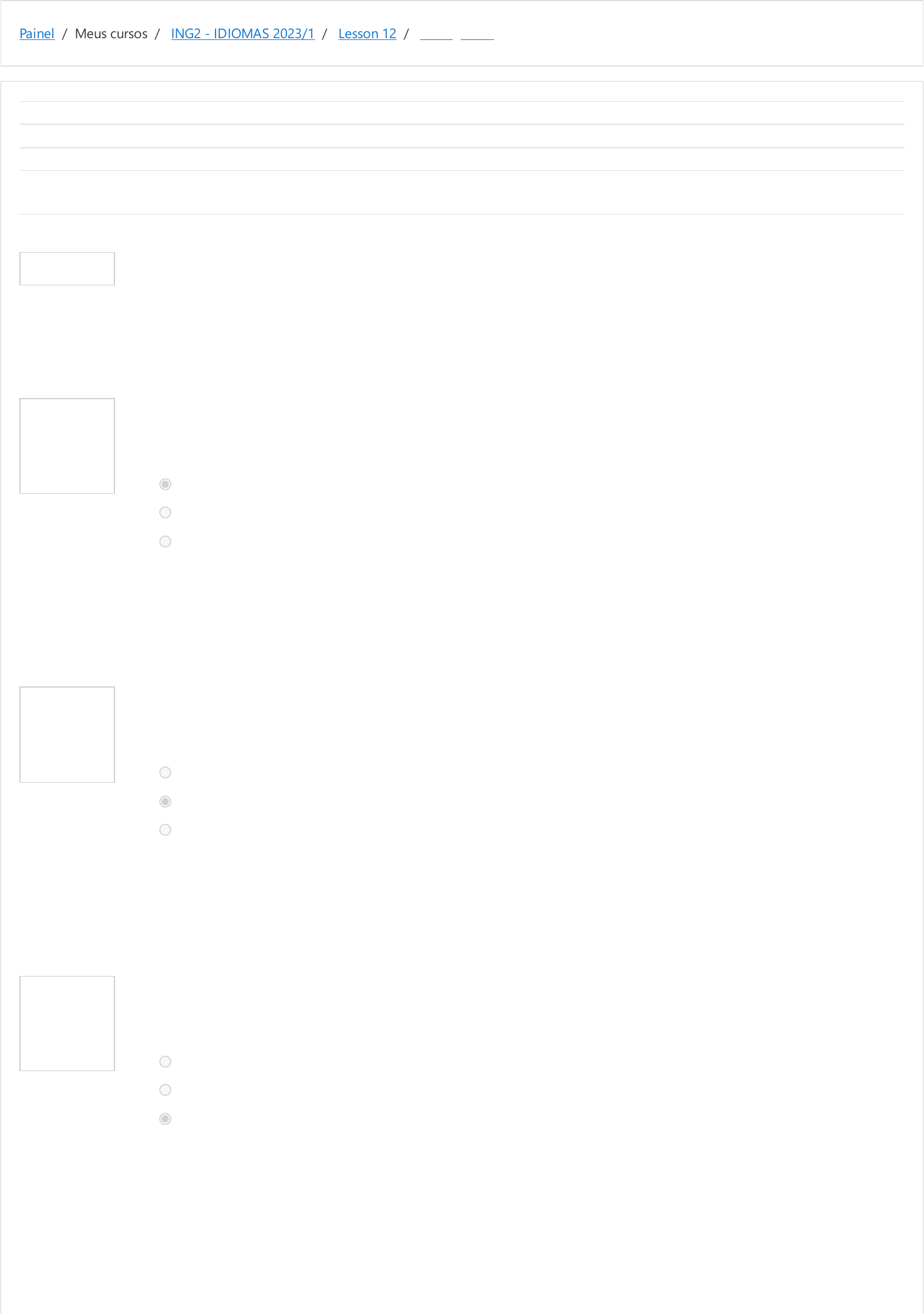 Painel / Meus cursos / ING2 - IDIOMAS 2023/1 / Lesson 12 / Dating Mike Informação Questão 1 Correto Atingiu 2,00 de 2,00 Questão 2 Correto Atingiu 2,00 de 2,00 Questão 3 Correto Atingiu 2,00 de 2,00 Iniciado em sexta, 26 mai 2023, 13:22 Estado Finalizada Concluída em sexta, 26 mai 2023, 13:23 Tempo empregado 56 segundos Avaliar 10,00 de um máximo de 10,00(100%) You read a conversation between Sarah and Amélie in the Warming Up section. Choose the best answer according to what they talked about. What are the girls talking about? Escolha uma opção: Nick asked Amélie out and they are meeting at the park. Dave asked Sarah out and they are meeting at the diner. Steve asked Sarah out and they are meeting at the diner. Sua resposta está correta. A resposta correta é: Nick asked Amélie out and they are meeting at the park. What are their impressions about the place the couple is going to and the boy? Escolha uma opção: They find the place a nice option, but the boy is boring. They have positive impressions about the place and the boy. They believe both are not the best place and person to be with. Sua resposta está correta. A resposta correta é: They have positive impressions about the place and the boy. Whats does Amélie ask Sarah? Escolha uma opção: She asks Sarah to lend her a dress. She asks Sarah to go on the date with her. She asks Sarah to return a favor. Sua resposta está correta. A resposta correta é: She asks Sarah to return a favor. https://moodle.ifsul.edu.br/novohamburgo/my/ https://moodle.ifsul.edu.br/novohamburgo/course/view.php?id=337 https://moodle.ifsul.edu.br/novohamburgo/course/view.php?id=337#section-18 https://moodle.ifsul.edu.br/novohamburgo/mod/quiz/view.php?id=53720 Questão 4 Correto Atingiu 2,00 de 2,00 Questão 5 Correto Atingiu 2,00 de 2,00 How does Sarah react to Amélie's request? Escolha uma opção: She refuses at first, but then takes it back. She refuses and just leaves the room. She says "yes" at first, but then takes it back. Sua resposta está correta. A resposta correta é: She refuses at first, but then takes it back. How does it end? Escolha uma opção: The girls have a fight and Amélie postpones the date. Sarah tells her to go on her date - she's gonna handle things at the diner. The girls change shifts at the diner. Sua resposta está correta. A resposta correta é: Sarah tells her to go on her date - she's gonna handle things at the diner. ◄ Sightseen in Canada (apostila) Seguir para... Adjectives In Use ► https://moodle.ifsul.edu.br/novohamburgo/mod/resource/view.php?id=53718&forceview=1 https://moodle.ifsul.edu.br/novohamburgo/mod/quiz/view.php?id=53721&forceview=1