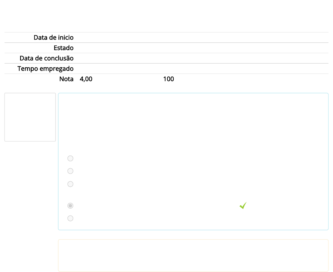 Questão 1 Correto Atingiu 1,00 de 1,00 Data de inicio quinta, 1 Jun 2023, 15:49 Estado Finalizada Data de conclusão quinta, 1 Jun 2023, 15:52 Tempo empregado 2 minutos 56 segundos Nota 4,00 de um máximo de 4,00(100%) Quando ocorre a avaliação, é por meio do preenchimento de formulários que possuem questões de avaliação. Estes são formulários cujos valores são escalonados de zero a cem, sendo que há “pesos” a serem considerados nesta avaliação: Escolha uma: a. O maior peso é da alta-avaliação. b. Ocorre apenas a auto-avaliação. c. Não a alta-avaliação. Não há avaliação por parte dos pares. d. A avaliação da Che�a imediata possui o peso maior. e. Não há avaliação por parte dos pares. Sua resposta está correta. A resposta correta é: A avaliação da Che�a imediata possui o peso maior. . Liderança, Cultura e Clima Organizacional ► AVALIAÇÃO ► ATIVIDADE DO ESTUDO DE CASO https://moodle.universoead.com.br/course/view.php?id=709 https://moodle.universoead.com.br/mod/quiz/view.php?id=15216 Questão 2 Correto Atingiu 1,00 de 1,00 Questão 3 Correto Atingiu 1,00 de 1,00 A princípio, apenas o concurso público é instrumento para a promoção e melhora na carreira do servidor público, talvez a única forma de “promoção” do servidor da instituição sejam os fatores de: Escolha uma: a. Ostentação. b. Extrapolação. c. Inviabilização. d. Avaliação. e. Formulação. Sua resposta está correta. A resposta correta é: Avaliação. . Na missão da instituição, é explicitado que há de se ter o “respeito ao pluralismo de ideias”, no entanto, em inúmeras situações, a prática contraria a teoria. Em relação a esta a�rmação no contexto do estudo de caso, é correto dizer: Escolha uma: a. Nenhuma das alternativas. b. Não são permitidos grupos. c. São permitidos parcialmente grupos. d. Há diversos “grupos” políticos. e. Não há “grupos” políticos. Sua resposta está correta. A resposta correta é: Há diversos “grupos” políticos.. https://moodle.universoead.com.br/mod/resource/view.php?id=15215 Questão 4 Correto Atingiu 1,00 de 1,00 O estilo comportamental da liderança e dos subordinados está diretamente relacionado ao contexto onde ela ocorre. A liderança na instituição em estudo tem um caráter: Escolha uma: a. Sensitivo. b. Agressivo. c. Temporário. d. Nenhuma das alternativas. e. Inspiracional. Sua resposta está correta. A resposta correta é: Temporário. .