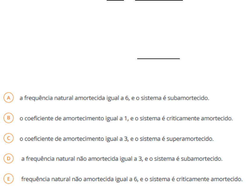 Lista 2 - Controle Exemplo 1 | Considere o sistema mostrado na figura, onde 𝛇 = 𝟎, 𝟔 e 𝛚𝐧 = 𝟓 𝐫𝐚𝐝/𝐬. Obteremos o tempo de subida tr, o tempo de pico tp, o máximo sobressinal Mp, e o tempo de acomodação ts quando o sistema for submetido a uma entrada em degrau unitário Exemplo 2 | Obtenha o tempo de subida, o tempo de pico, o máximo sobressinal e o tempo de acomodação, na resposta ao degrau unitário, do sistema de malha fechada dado a seguir 𝑪(𝒔) 𝑹(𝒔) = 𝟑𝟔 𝒔𝟐 + 𝟐𝒔 + 𝟑𝟔 Exemplo 3 | Tem-se o seguinte sistema de segunda ordem com a FT abaixo 𝐆(𝐬) = 𝟗 𝐬𝟐 + 𝟔𝐬 + 𝟗 A respeito da estabilidade e desempenho de G(s), podemos dizer Exemplo 4 | Considere a resposta ao degrau unitário de um sistema dinâmico, cuja função de transferência é dada por G(s) = A partir da análise do gráfico, conclui-se que a resposta do sistema apresenta Exemplo 5 |