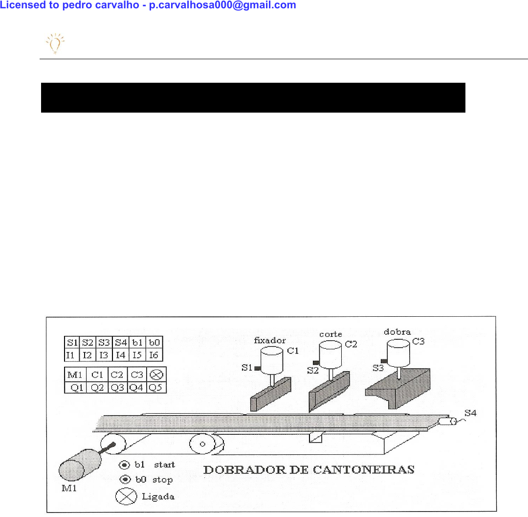 CLP Fácil Cursos On-line de Programação de CLP 1 Exercício #2: DOBRADEIRA DE PEÇAS LEIA COM ATENÇÃO A empresa ACME contratou você para fazer a programação de um novo equipamento adquirido. A máquina é uma dobradeira de peças e sua programação funciona da seguinte forma: Ao pressionar o botão de START a esteira M1 liga até que o sensor S4 detecte material. Quando isso ocorrer a esteira pára, o cilindro C1 avança até seu sensor, em seguida o cilindro C3 avança até seu sensor, dobrando a peça e por fim o cilindro C2 avança até seu respectivo sensor, cortando a peça. Feito isso os três cilindros recuam. Liberando a peça que cai numa caixa e finalizando o ciclo e dando condição para um novo ciclo. A lâmpada liga quando o ciclo estiver em funcionamento e o botão STOP finaliza o ciclo. Desenvolva a programação em Ladder utilizando o S7-1200 CPU 1214C DC/DC/DC. Licensed to pedro carvalho - p.carvalhosa000@gmail.com