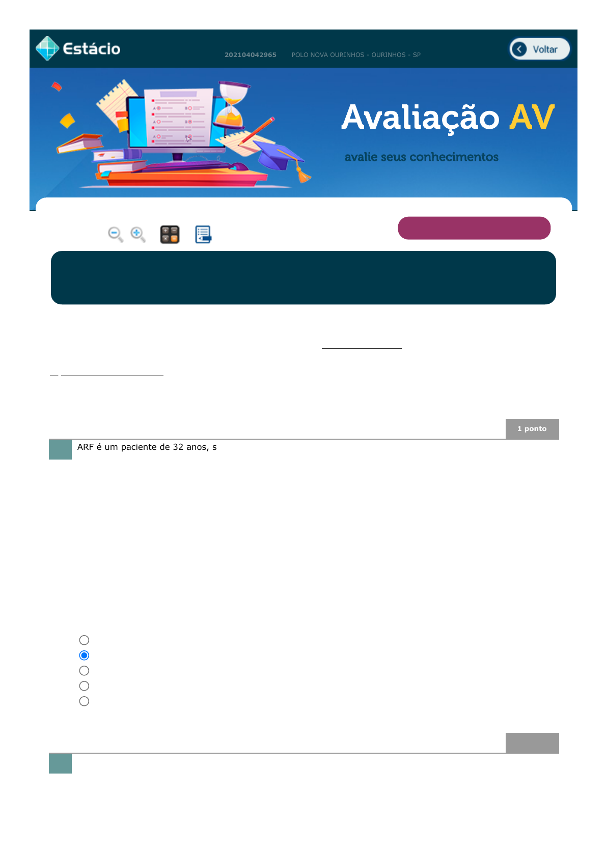 11/06/2022 10:45 EPS https://simulado.estacio.br/alunos/ 1/4 Rita Fabiana bianchi de Andrade Avaliação AV 202104042965 POLO NOVA OURINHOS - OURINHOS - SP avalie seus conhecimentos 1 ponto ARF é um paciente de 32 anos, sexo masculino, triatleta, vegetariano, com diagnóstico de eutrofia, preservação de massa magra e sem risco de comorbidades ao exame antropométrico. Consome todos os dias ovo cozido no café da manhã (ele é ovolactovegetariano, ou seja, consome leite e derivados e ovos na dieta habitual). Com relação a esse paciente, analise as afirmativas a seguir: I. Para uma boa digestão do ovo, serão necessárias a acidez gástrica e a ação do suco pancreático. II. No caso do atleta, teremos que introduzir na dieta uma fonte de aminoácidos essenciais. III. Se Mário consumir muitos ovos, associado a uma dieta de baixa caloria, é possível que haja o aumento da produção de ureia. IV. A suplementação de aminoácidos essenciais será fundamental para manutenção do estado nutricional de Mário. V. Tanto ovos quanto leites e derivados são ótimas fontes de aminoácidos indispensáveis. Estão corretas as afirmativas: (Ref.: 202109282936) 1 ponto A ligação peptídica é uma ligação amida formada entre o grupamento terminal carboxílico de um aminoácido com o grupamento terminal amino de outro aminoácido. Dessa maneira, há a liberação de uma molécula de água. A presença da ligação peptídica forma peptídeos que podem ser classificados de acordo com a quantidade de aminoácidos presente na molécula. Se um polipeptídeo possui 84 ligações peptídicas, quantos aminoácidos existem nessa cadeia? (Ref.: 202109280153) Lupa Calc. Notas VERIFICAR E ENCAMINHAR Disciplina: SDE4572 - NUTRIÇÃO HUMANA Período: 2022.1 EAD (G) Aluno: RITA FABIANA BIANCHI DE ANDRADE Matr.: 202104042965 Turma: 9001 Prezado(a) Aluno(a), Responda a todas as questões com atenção. Somente clique no botão FINALIZAR PROVA ao ter certeza de que respondeu a todas as questões e que não precisará mais alterá-las. A prova será SEM consulta. O aluno poderá fazer uso, durante a prova, de uma folha em branco, para rascunho. Nesta folha não será permitido qualquer tipo de anotação prévia, cabendo ao aplicador, nestes casos, recolher a folha de rascunho do aluno. Valor da prova: 10 pontos. 1. I e III I, III e V II e IV IV e V II, III e IV 2. javascript:voltar(); javascript:diminui(); javascript:aumenta(); javascript:calculadora_on(); javascript:anotar_on(); 11/06/2022 10:45 EPS https://simulado.estacio.br/alunos/ 2/4 1 ponto Segundo a Pesquisa de Orçamentos Familiares (POF/IBGE), o consumo de sódio do brasileiro excede o limite máximo recomendado pela OMS em: (Ref.: 202109295283) 1 ponto Alguns fatores alteram a biodisponibilidade do cálcio. Assinale a alternativa que contribua para o aumento da absorção do cálcio: (Ref.: 202109295278) 1 ponto (FIOCRUZ 2010) A carga glicêmica estimada dos alimentos, das refeições e dos padrões dietéticos é calculada: (Ref.: 202109288588) 1 ponto As fibras alimentares são componentes importantes para o funcionamento do organismo, associadas à prevenção de diversas doenças. A recomendação diária da Organização mundial da saúde para ingestão de fibras para adultos é de: (Ref.: 202109271623) 84 aminoácidos 82 aminoácidos 85 aminoácidos 86 aminoácidos 83 aminoácidos 3. Mais de 7 vezes Mais de uma vez Mais de 10 vezes Mais de 5 vezes Mais de duas vezes 4. Acúrico Fitatos Inulina Fibras Oxalato 5. Pela multiplicação ao dobro da medição do índice glicêmico sobre a glicemia pós-prandial. Pela área sob a curva da glicemia pós-prandial após a ingestão de 50 gramas de carboidratos digeríveis em comparação com 200 gramas de um alimento-padrão, glicose ou pão branco. Pela área sob a curva da glicemia pós-prandial após a ingestão de 150 gramas de carboidratos digeríveis em comparação com 50 gramas de um alimento-padrão, glicose ou pão branco. Pela multiplicação do índice glicêmico pela quantidade de carboidratos em cada alimento, seguido pela soma dos valores de todos os alimentos em uma refeição ou padrão dietético. Pela área sob a curva da glicemia pós-prandial após a ingestão de 50 gramas de carboidratos digeríveis em comparação com 50 gramas de um alimento-padrão, glicose ou pão branco. 6. 10 a 15 g 50 a 60 g 20 a 35 g 20 a 50 g 15 a 20 g 11/06/2022 10:45 EPS https://simulado.estacio.br/alunos/ 3/4 1 ponto Você resolveu fazer uma dieta de restrição zero de carboidratos, composta apenas de lipídios e proteínas. Estava feliz, pois em uma semana perdeu bastante peso. Entretanto, começou a sentir tonturas, enjoo e perda de memória, além de estar exalando um hálito de acetona muito forte. Ao procurar o médico, este relatou que sua dieta estava totalmente errada e que você estava sofrendo os efeitos colaterais dela. Baseado no relato acima, assinale a alternativa que aponta as vias bioquímicas que se encontram ativadas no seu organismo após a introdução da dieta e o motivo dos efeitos colaterais que você estava sentindo. (Ref.: 202109295415) 1 ponto Sobre os ácidos graxos, é correto afirmar: (Ref.: 202109272808) 1 ponto A seguinte vitamina é muito sensível à luz e à oxidação e é resistente ao calor: (Ref.: 202109295418) 1 ponto As vitaminas são compostos orgânicos que funcionam como coenzimas, ou seja, atuam juntamente com as enzimas envolvidas no metabolismo celular. A deficiência de vitaminas provoca enfermidades chamadas de doenças de carências. Observe abaixo os dados de sintomas de carências de algumas vitaminas: 1. Córnea ressecada 2. Raquitismo na infância 3. Deficiência na coagulação sanguínea 4. Anemia perniciosa Os sintomas carenciais enumerados acima estão relacionados, respectivamente, com a deficiência das seguintes vitaminas: 7. Gliconeogênese, cetogênese, síntese de glicogênio, tendo como principal motivo dos efeitos colaterais a produ