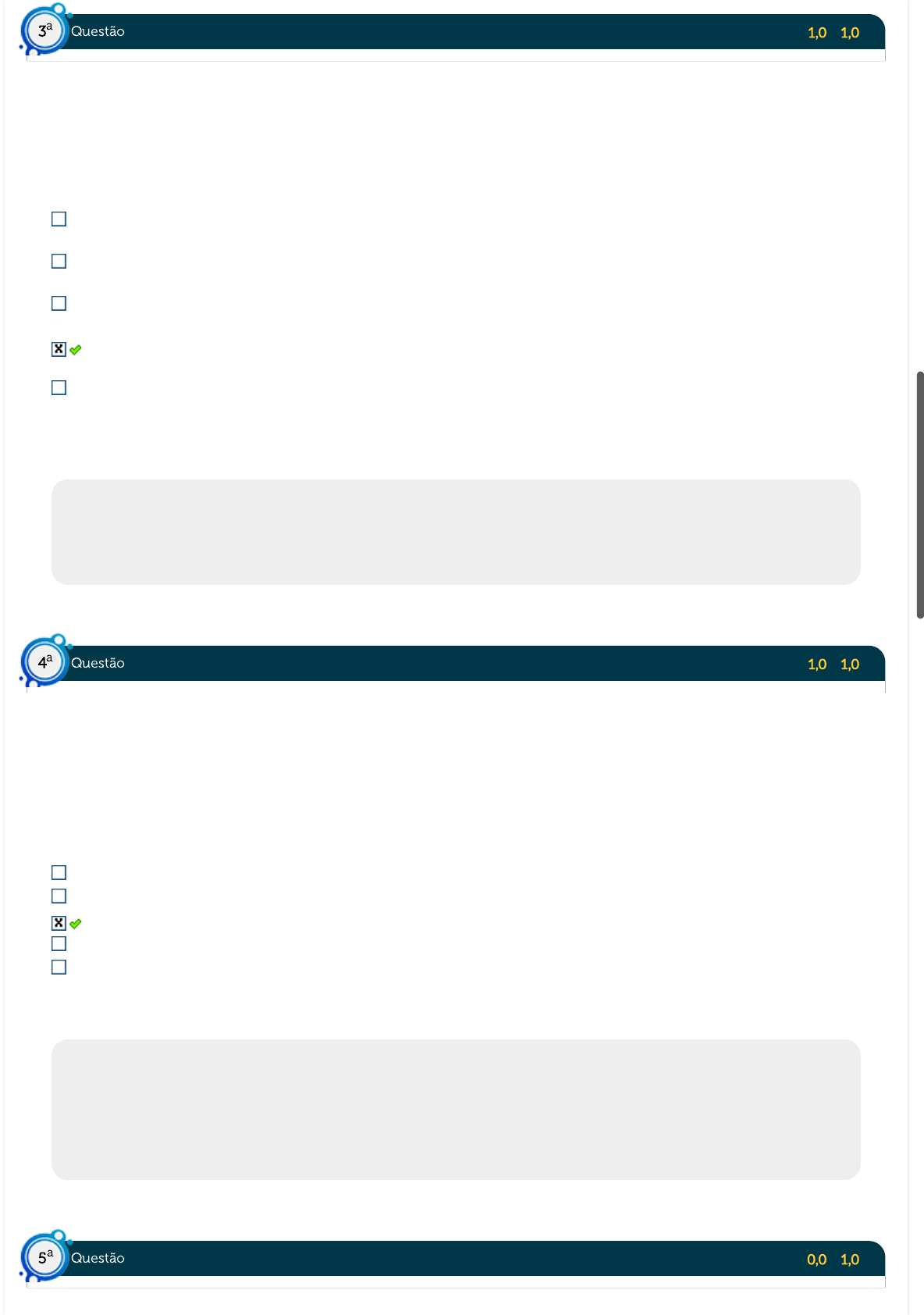 Acerto: 1,0 / 1,0 A drenagem autógena é uma técnica de desobstrução brônquica que utiliza um padrão de respiração que envolve volumes pulmonares diferentes durante sua realização. A fase em que ocorre a inspiração do paciente em nível do volume de reserva inspiratório é a (1). Existe uma fase na qual ocorrem inspirações com volumes abaixo do volume corrente denominada (2). Em uma determinada fase, o paciente respira um pouco acima dos valores do volume corrente normal, conhecida como fase (3). Após a observação do texto incompleto acima, assinale a alternativa que preenche corretamente as lacunas (1), (2) e (3): Fase 2, momento em que ocorre a coleta do muco (1); fase 1, momento em que o muco se desgarra das paredes brônquicas (2); fase 3, momento em que ocorre o preparo para a expulsão do muco (3). Fase 1, momento em que o muco se desgarra das paredes brônquicas (1); fase 3, momento em que ocorre o preparo para a expulsão do muco (2); fase 2, momento em que ocorre a coleta do muco (3). Fase 1, momento em que o muco se desgarra das paredes brônquicas (1); fase 2, momento em que ocorre a coleta do muco (2); fase 3, momento em que ocorre o preparo para a expulsão do muco (3). Fase 3, momento em que ocorre o preparo para a expulsão do muco (1); fase 2, momento em que ocorre a coleta do muco (2); fase 1, momento em que o muco se desgarra das paredes brônquicas (3). Fase 2, momento em que ocorre a coleta do muco (1); fase 3, momento em que ocorre o preparo para a expulsão do muco (2); fase 1, momento em que o muco se desgarra das paredes brônquicas (3). Respondido em 18/04/2023 18:20:35 Explicação: Na drenagem autógena, o muco é desprendido da parede brônquica na fase 1; a seguir, é coletado e sofre a evacuação, que representa o momento de preparo desse muco para ser liberado pela tosse. É na fase 3 que ocorrem inspirações em nível do volume de reserva inspiratório, não na fase 1, tampouco na fase 2. Acerto: 1,0 / 1,0 Paciente com asma brônquica e possível hiper-reatividade das vias aéreas, realizando aerossolterapia via �uxômetro, com �uxo de 7L/min,, sem broncoespasmos pulmonares, utilizando N-acetil-L-cisteína como medicamento para facilitar a diminuição da viscoelasticidade do muco presente em suas vias aéreas. A nebulização terapêutica estava sendo entregue por máscara facial, anatomicamente acoplada à sua face. Imediatamente após a conduta, que teve o tempo estimado de nove minutos, com o paciente mantendo o estado clínico de início da terapia nebulizadora, foi realizado o ciclo ativo da respiração na tentativa de mobilizar as secreções brônquicas. Com menos de 30 segundos do início do ciclo ativo da respiração, a terapia teve que ser interrompida porque o paciente começou a apresentar broncoespasmos audíveis a ausculta pulmonar. O provável motivo do aparecimento dos broncoespasmos foi: A técnica ciclo ativo da respiração. O tempo de execução da aerossolterapia. A utilização da medicação mucolítica. O �uxo entregue por meio do �uxômetro para a realização da nebulização. O uso da máscara em vez do bocal para aplicação da nebulização terapêutica. Respondido em 18/04/2023 18:21:05 Explicação: A N-acetil-L-cisteína é um mucolítico que ao quebrar as pontes de dissulfeto do muco diminui sua viscoelasticidade e auxilia na melhora da clearance mucociiar. No entanto, este medicamento inalado pode levar ao broncoespasmo, pois produz irritabilidade das vias aéreas. Sendo o paciente asmático e apresentando vias aéreas hiper-reativas, certamente foi a provável causa da presença de constrição brônquica. As outras alternativas não apresentam qualquer relação com a probabilidade de indução ao broncoespasmo por elas. Portanto, estão incorretas. Acerto: 0,0 / 1,0 Os espirômetros de Incentivo são terapias comumente indicadas no pré e pós-operatório cirúrgico, com a �nalidade de it li õ l At l t i S d d i ti d l d t di iti b f db k Questão3 a Questão4 a Questão5 a